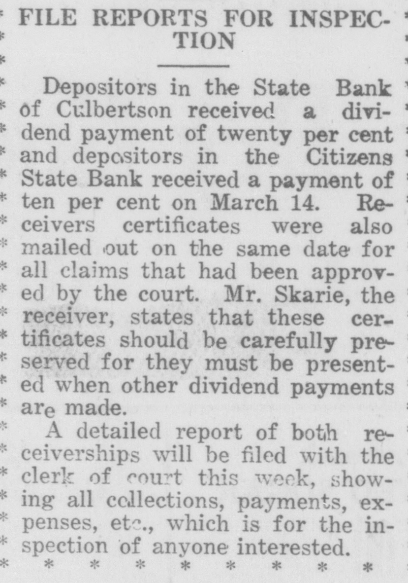 FILE REPORTS FOR INSPECTION Depositors in the State Bank of Culbertson received a dividend payment of twenty per cent and depositors in the Citizens State Bank received a payment of ten per cent on March 14. Receivers certificates were also mailed out on the same date for all claims that had been approved by the court. Mr. Skarie, the receiver, states that these certificates should be carefully preserved for they must be presented when other dividend payments are made. A detailed report of both receiverships will be filed with the clerk of court this week, showing all collections, payments, expenses, etc., which is for the inspection of anyone interested.