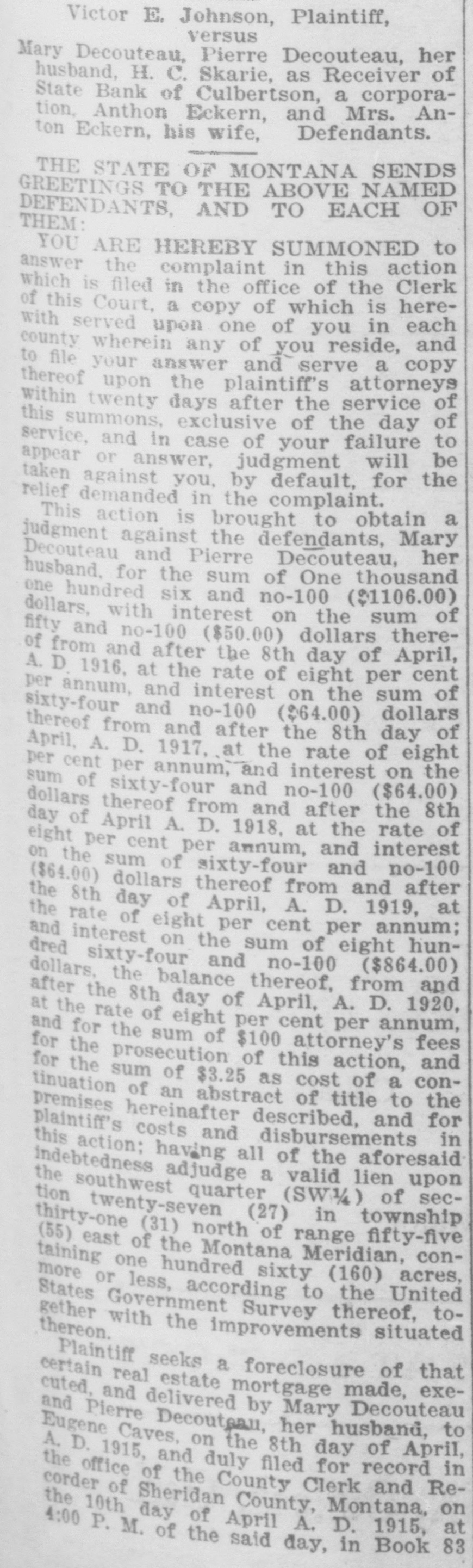 Victor E. Johnson, Plaintiff, versus Mary Decouteau, Pierre Decouteau, her husband, H. C. Skarie, as Receiver of State Bank of Culbertson, a corporation, Anthon Eckern, and Mrs. Anton Eckern, his wife, Defendants. # THE STATE OF MONTANA SENDS GREETINGS TO THE ABOVE NAMED DEFENDANTS, AND TO EACH OF THEM: YOU ARE HEREBY SUMMONED to answer the complaint in this action which is filed in the office of the Clerk of this Court, a copy of which is herewith served upon one of you in each county wherein any of you reside, and to file your answer and serve a copy thereof upon the plaintiff's attorneys within twenty days after the service of this summons, exclusive of the day of service, and in case of your failure to appear or answer, judgment will be taken against you, by default, for the relief demanded in the complaint. This action is brought to obtain a judgment against the defendants, Mary Decouteau and Pierre Decouteau, her husband, for the sum of One thousand one hundred six and no-100 ($1106.00) dollars, with interest on the sum of fifty and no-100 ($50.00) dollars thereof from and after the 8th day of April, A. D. 1916, at the rate of eight per cent per annum, and interest on the sum of sixty-four and no-100 ($64.00) dollars thereof from and after the 8th day of April, A. D. 1917, at the rate of eight per cent per annum, and interest on the sum of sixty-four and no-100 ($64.00) dollars thereof from and after the 8th day of April A. D. 1918, at the rate of eight per cent per annum, and interest on the sum of sixty-four and no-100 ($64.00) dollars thereof from and after the 8th day of April, A. D. 1919, at the rate of eight per cent per annum; and interest on the sum of eight hundred sixty-four and no-100 ($864.00) dollars, the balance thereof, from and after the 8th day of April, A. D. 1920, at the rate of eight per cent per annum, and for the sum of $100 attorney's fees for the prosecution of this action, and for the sum of $3.25 as cost of a continuation of an abstract of title to the premises hereinafter described, and for plaintiff's costs and disbursements in this action; having all of the aforesaid indebtedness adjudge a valid lien upon the southwest quarter (SW¼) of section twenty-seven (27) in township thirty-one (31) north of range fifty-five (55) east of the Montana Meridian, containing one hundred sixty (160) acres, more or less, according to the United States Government Survey thereof, together with the improvements situated thereon. Plaintiff seeks a foreclosure of that certain real estate mortgage made, executed, and delivered by Mary Decouteau and Pierre Decouteau, her husband, to Eugene Caves, on the 8th day of April, A. D. 1915, and duly filed for record in the office of the County Clerk and Recorder of Sheridan County, Montana, on the 10th day of April A. D. 1915, at 4:00 P. M. of the said day, in Book 83
