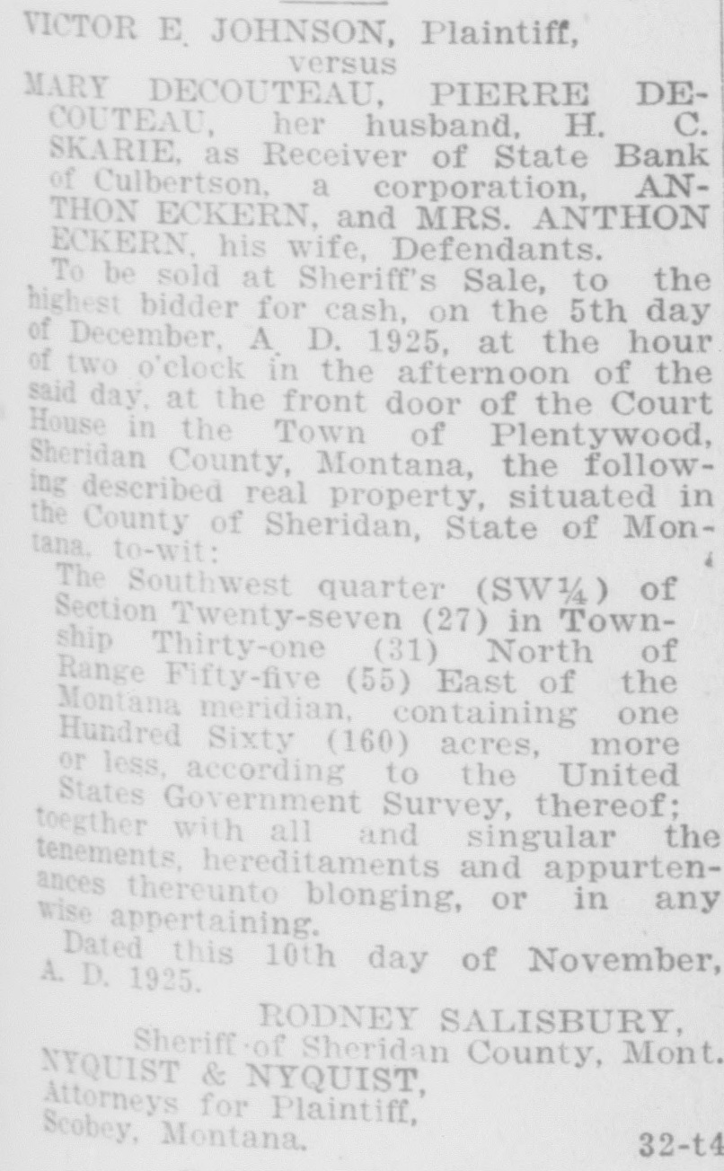 VICTOR E JOHNSON, Plaintiff, versus MARY DECOUTEAU, PIERRE DECOUTEAU, her husband, H. C. SKARIE, as Receiver of State Bank of Culbertson, a corporation, ANTHON ECKERN, and MRS. ANTHON ECKERN, his wife, Defendants. To be sold at Sheriff's Sale, to the highest bidder for cash, on the 5th day of December, A D. 1925, at the hour of two o'clock in the afternoon of the said day, at the front door of the Court House in the Town of Plentywood, Sheridan County, Montana, the following described real property, situated in the County of Sheridan, State of Montana. to-wit: é The Southwest quarter (SW1/4) of Section Twenty-seven (27) in Township Thirty-one (31) North of Range Fifty-five (55) East of the Montana meridian, containing one Hundred Sixty (160) acres, more or less, according to the United States Government Survey, thereof; toegther with all and singular the tenements, hereditaments and appurtenances thereunto blonging, or in any wise appertaining. Dated this 10th day of November, A. D. 1925. RODNEY SALISBURY, Sheriff of Sheridan County, Mont. NYQUIST & NYQUIST, Attorneys for Plaintiff, Scobey, Montana. 32-t4