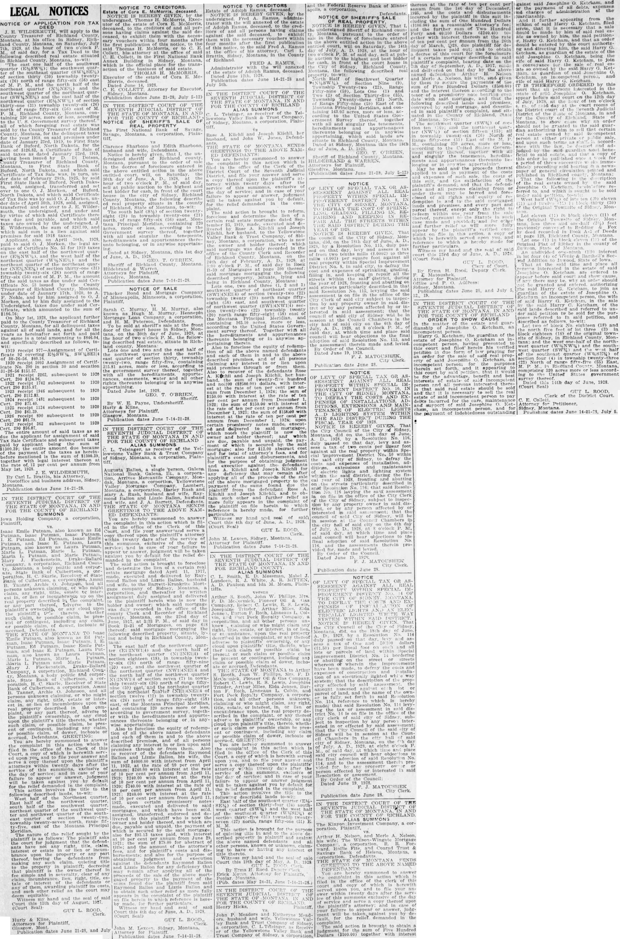 LEGAL NOTICES NOTICE OF APPLICATION FOR TAX DEED E. WILDERMUTH, will apply to the County Treasurer County, Montana, at his office in Sidney Richland on Saturday 7th, 1928. the hour of two of said day, for Tax Deed the following described real estate situated in County, half the southwest the quarof the southeast of section thirty township twenty. six (26) range (56) and north half the northeast quarter of the ter quarter and the east half the northwest of (31) township north of range fifty-six (56) east of con- M. Richland taining 320 acres, more according to the thereof. which foregoing real the of Richland County, for the taxes for the year 1918. on said premises under State date January 23rd, First Bank Buford, for the sum of $126.82, Certificate Sale 1919, said taxes dated Jaunary having been issued by Dotson, County Richland County Montana, State Bank Buford, North Dakota, and which said Certificate Tax Sale was, turn, under of February 1925, said First Bank of Buford, North transferred Buford over North Dakota, and which said Certificate Tax Sale was Morken, der April transferred and to Wildermuth, the under by virtue which said Certificate there was due and which by the the sum of $267.09 and which lien against premises for said 1918 Applicant, also, on April 30th. 1928. the No. for 1919 taxes on the half of the and the west half of the northeast quarter the quarter of the ter (NE% NEW) (31) township twenty (26) north of range east of the amount of the said taxes as due the County Richland Montana, under date Jaunary 17th, and him assigned to Morken, and by him duly to the Undersigned, taxes due tificate, which to the sum of On May 1st, 1928. the applicant further paid the County of Richland County, against of said lands, and for all the years forth and the same to $846.04 and specifically described as follows, toreceipt 977-Assignment of Certiof 1920 receipt 1093 Assignment of Certificate section 30 and secation receipt 2262, subsequent to 1920 Cert. 290 1742 subsequent to 1920 290 $135.87 1946 subsequent to 1920 290 Cert. 1924 1481 subsequent to 1920 $71 Cert. 290 1134 subsequent to 1920 290 Cert. 890 subsequent to 1920 Cert. 1927 290 receipt 362 subsequent to 1920 $56.07 290 amount of said taxes as due the applicant for said Tax Certificate and subsequent taxes by applicant being sum of amount due because payment the taxes as hereinbefore the sum of $1300.39 together legal at the per cent per annum from May 1st, E. WILDERMUTH, By Carl L. Postoffice and business address, Sidney, Montana Publication dates June IN THE DISTRICT COURT OF THE OF THE OF THE OF RICHLAND FOR SUMMONS Iowa Holding Company, corporation, Plaintiff, also known Ed Isaac Emile Putnam, Putnam, Ed Isaac Emile E. Putnam, Laura and Isaac this Putnam, Putman, also known as Laura Putman, Marie Putnam, Putman, Putnam, Marie Putnam, Maria Fleckenstein, Ballard Mary corporation, Counpolitic and corporty, Montana, Bank Receiver State Bank Culbertson, corporation, Ammi Archie Johnson, and claiming, or who might or interclaim, any up on the lien or described in the thereof, adverse to the any cloud plaintiff was the presclaim, or any June, ent or or claim, of dower, inchoate or THE OF MONTANA TO Isaac PutEmile man, Ed Isaac Laura Emile Put- Putand Isaac known as Putman, the Putnam, Putman, Putnam, Maria Putnam Mary Fleckenstein, Councorporation, the politic and corporty, Montana, the Bank ate, State Receiver of State of Culbertson, Johnson, and Ammi Archie O. of unknown claiming. or who might interany right, title, six the est lien in the real adverse to any part the upon the title claim, be whether present including any claim. or or of GREETING to You are hereby this is filed in the Clerk of this Court, copy of which is herewith serv. upon you. and to file answer serve thereof the after the twenty service attorneys summons, exclusive service: and case your the of failure day to appear answer, by judgment default be against you will demanded in for the relief action the title to the lands, following West Northeast quarter, quarter, of northwest East half south half of southwest quarter, northeast quarter the quarter and northwest quarter of the southeast township the Montana Principal Meridian. The nature the relief sought by the follows: plaintiff the for judgment that the ants title, claim, estate lien incuminterest or brance upon the property any part thereof, barring making plaintiff; decreeing that plaintiff the owner thereof in fee simple in title. any right, interest of the any of its other relief as the court may deem hand and the seal of said my Court day of August, 1927. (Court Seal) GUY L. Clerk NOTICE TO CREDITORS Estate Cora NOTICE IS HEREBY GIVEN, by the undersigned, Thomas H. McMorris, McMorris, Executor the the and all persons claims against the to exhibit them with the necessary within four months after the the first this notice, said H. McMorris, to Collett, his the office said E. Collett, the First National Bank Annex Building Sidney, Montana, which the official the action of the of said THOMAS H. Executor of the estate of Cora E. McMorris, Dated Attorney for Executor, (Publication dates June 21-28, July 5-12) IN THE DISTRICT COURT OF THE THE STATE OF FOR THE NOTICE OF SHERIFF'S SALE OF REAL PROPERTY The Savage Montana, corporation, Plaintiff, Clarence Sharbono Edith Sharbono, husband wife Defendants. Notice hereby given that the ersigned sheriff Richland the order of Montana, the in the action in the above will, the of June 1928 the 30th day said day sell the and best front of Richland court house city of County Montana, the ed property in county State eight (28) township north of (56) MonMeridian 320 tana according the survey together with all and singular belonging, or in Dated at Sidney Montana, this 1st day of A. D., Sheriff of Richland County Montana Warren Attorneys for Publication dates June 7-14-21-28. NOTICE OF SALE Company Thacker a corporation, Plaintiff, Sarah C. Murray M. Murray, also know