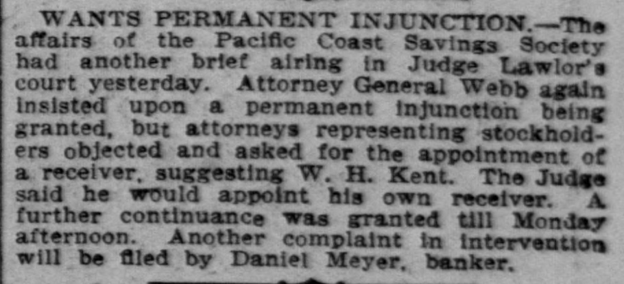 MAKES DEMAND FOR RECEIVER Urgency Pleaded by Lawyer Wise in Coast Pacific Case Savings Society CLIENTS ARE UNSECURED Motion to Make Injunction Permanent Continued for Argument Until Tuesday The argument on a motion for a permanent injunction to restrain and enjoin the Pacific Coast Savings Society from transacting further business on the ground that it is insolvent was to have been heard before Judge Lawlor yesterday afternoon at 2 o'clock. Attorneys representing various interests were present. When the case was called the Judge suggested that another date for hearing be agreed upon, as he could not take up the case. Attorney O. I. Wise, representing stockholders who had paid in more than $100,000. said that the only question up was the appointment of receivers, as all were agreed that the society was insolvent. That should not take much time and he pleaded urgency. Attorney Van Ness, representing the Canadian and American Mortgage and Trust Company, holders of the society's debenture bonds, who had filed a complaint in Intervention, said that the society's debts amounted to about $72,500. He thought there was nothing to justify the appointment of receivers and asked whether the parties interested could not agree upon the best method of liquidating the estate. He suggested that a continuance of four or five days be granted to see if it were not possible to make some satisfactory arrangements in that direction. The temporary restraining order was sufficient to prohibit the society from doing any further business. Attorney Wise said that Van Ness' clients were nominally secured and so was Daniel Meyer's bank, but his clients were unsecured. There was nothing to prevent Meyer from foreclosing, thereby depriving others of the benefit of any surplusage. He repeated that the only question was the naming of receivers. The rights of Van Ness' clients could not be impaired. The arguments went over till Tuesday morning, and the attorneys were asked to come prepared with authorities as to whether the allegations in the complaint were sufficient to authcrize the court to appoint receivers. Attorney Wise then filed a complaint in intervention on behalf of W. H. Kent and 200 other stockholders.