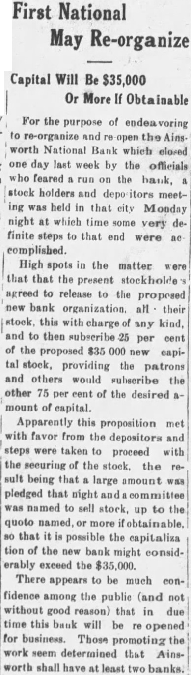 STATEMENT BY THE DIRECTORS OF FIRST NATIONAL BANK To the patrons and friends of The National Bank of Ainsworth: For over 42 years the National Bank of Ainsworth has stood shoulder to shoulder with the people of Ainsworth and Brown County, through prosperity and adversity alike. In its entire history it has never failed in a single obligation. There has never been a time that it had not the interests of the community at heart, nor has it ever lost sight of the absolute obligation that it owes to its depositors. In spite of its clean record for nearly half a century, there seems to have come a time when the confidenc of the public has been temporarily withheld. Every effort has been expended by the officers and stockholders to keep the bank in a sound financial condition, and their efforts have been so well rewarded that the past year has been the most prosperous one in the last decade. The misfortune that occurred last week in the closing of the Citizens Bank seems to have caused a feeling of unrest and lack of confidence in the minds of the people and resulted in very heavy withdrawals of de-s posits from the National Bank on Saturday of last week and Monday and Tuesday of this week. At no time was there anything resembling a "run" on the bank, but the withdrawals were steady and persistent. Yet the resources of the bank were not endangered. However, there was no indication that the demands of our depositors would cease before the danger point would be reached, and it was decided by our Directors that in justice to our depositors, the withdrawal should not be permitted to continue and that the bank should be closed while it was yet solvent and capable of liquidating all demands. Hence, the doors have been closed and the bank has been placed in the hands of the Comptroller of the Currency. While the officers regret that it seemed necessary to suspend operations, still they are convinced that such action was the proper course to pursue in order that our depositors might be fully potected. It might be well to state that prior to Tuesday of last week the bank owed nothing for borrowed money and had no re-discounted paper. However, owing to the closing of the Citizens Bank on Tuesday, it was considered advisable to obtain a loan to enable us to cope with any reasonable emergency and we therefore borrowed $29,500 on our bills payable. That loan has not been increased ,nor has any part of the borrowed money been expended. In other words, we still have the $29,500 in cash or its equivalent, and a considerable amount besides. The loan may therefore be fully discharged without exhausting our available cash, and thus when our bills payable are liquidated out of the funds which we now have on hand, we will be free from debt for borrowed money, and all of our assets will be available for the payment of our depositors. We consider that our notes and other assets are worth practically 100 cents on the dollar, and we believe that our depositors have no cause to worry. We know that we have been the victim of unfounded rumors, which have been circulated partly through ignorance and partly through unfriendly motives. Still, we are not placing the blame on anyone. We appreciate the great confidence that has at all times been placed in this bank, and feel sure that future developments will justify that confidence. Most respectfully, J. M. Hanna, Wm. M. Ely, L. F. Corbitt, Hans Rohwer, C. T. Bowen, Directors.