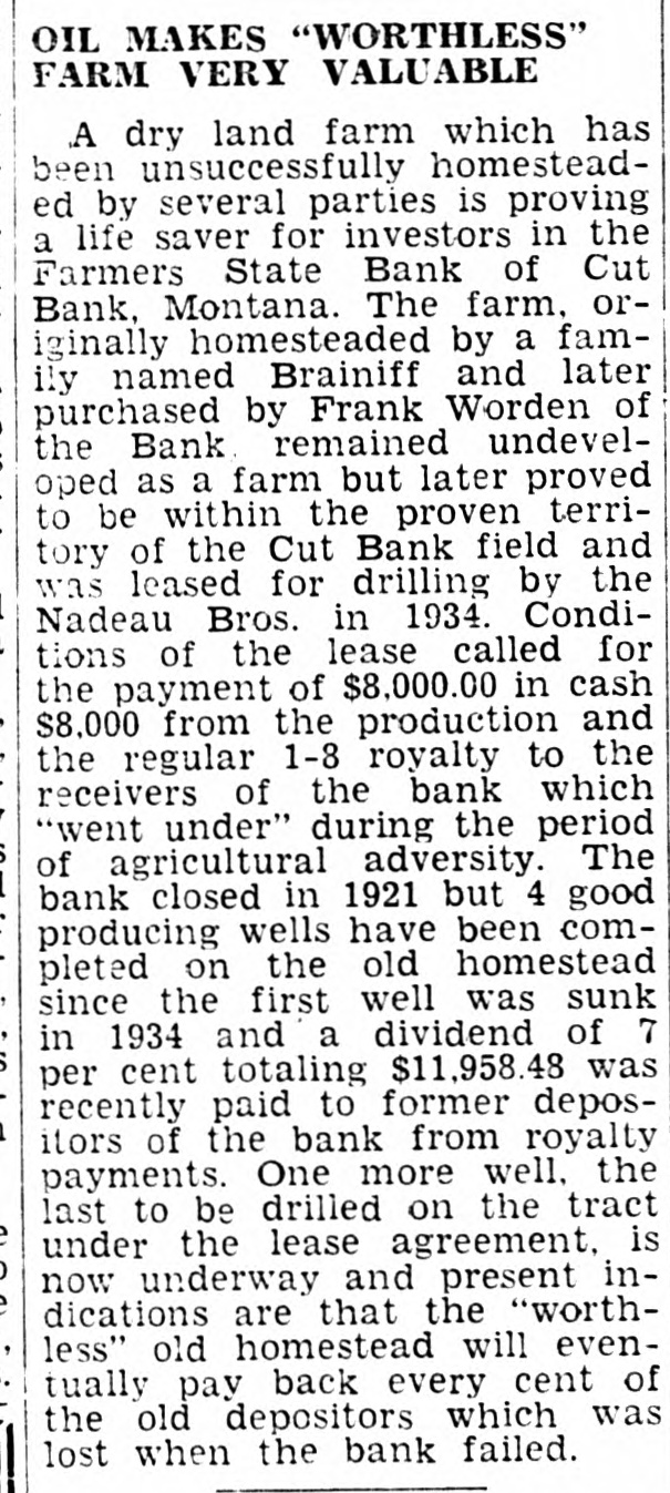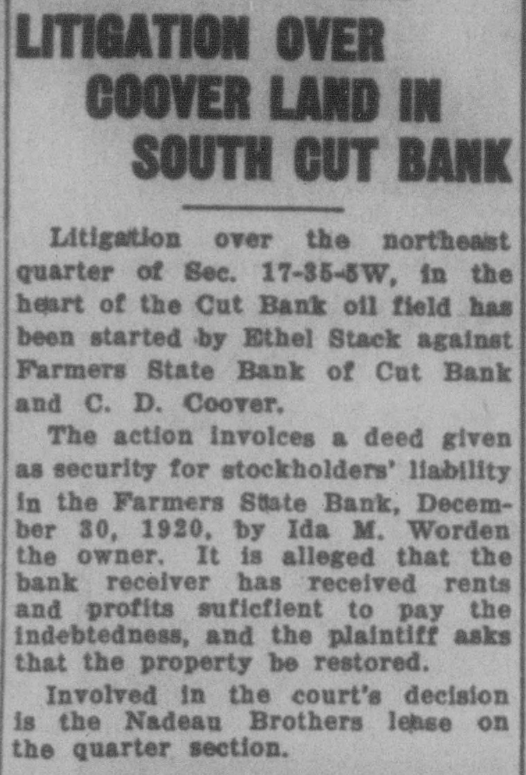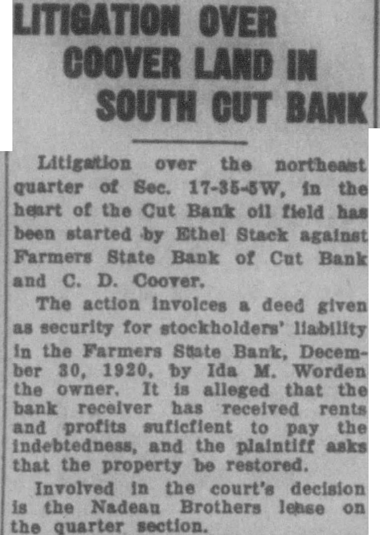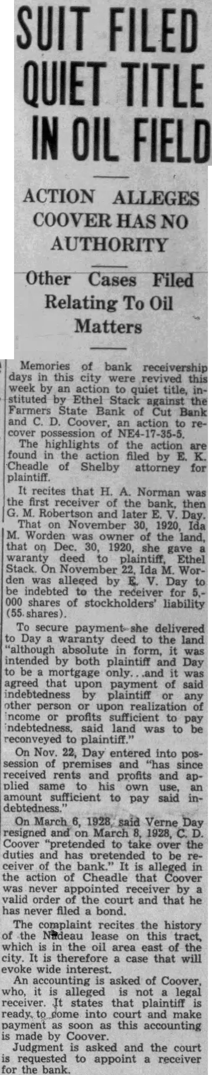 ALLEGES AUTHORITY Other Cases Filed Relating Oil Matters Memories of bank receivership days this city by action to quiet instituted by Ethel Stack against Farmers State Bank of Cut Bank and Coover, action of The highlights of the action found in the action filed by Cheadle of Shelby attorney for plaintiff. It recites that H. Norman was the first receiver of the bank, then Robertson and later That on November 30, 1920, Ida M. Worden was owner of the land, that on Dec. 30, she gave waranty deed to plaintiff, Ethel Stack Ida Worden was alleged by Day indebted to the receiver for shares of stockholders' liability To secure delivered Day waranty deed to the land "although absolute in form, was intended by both plaintiff and Day be .and agreed that upon payment of said indebtedness plaintiff other person or upon realization income or profits sufficient to pay ndebtedness. land was to reconveyed to On Nov. 22, Day entered into possession of premises and received rents and profits and applied to his own use, an amount sufficient to pay said indebtedness. On March Verne resigned and March Coover to take over the duties and has to be of the alleged in the action of Cheadle that Coover never appointed receiver by valid order of the court and that he has never filed bond. The complaint recites the history the Nadeau lease on this tract, which is in the oil area east of the city. It therefore case that will wide An accounting is asked of Coover, who, it alleged is not legal receiver. states that plaintiff ready. into court and make payment soon this accounting made by Judgment is asked and the court requested to appoint receiver for the bank.