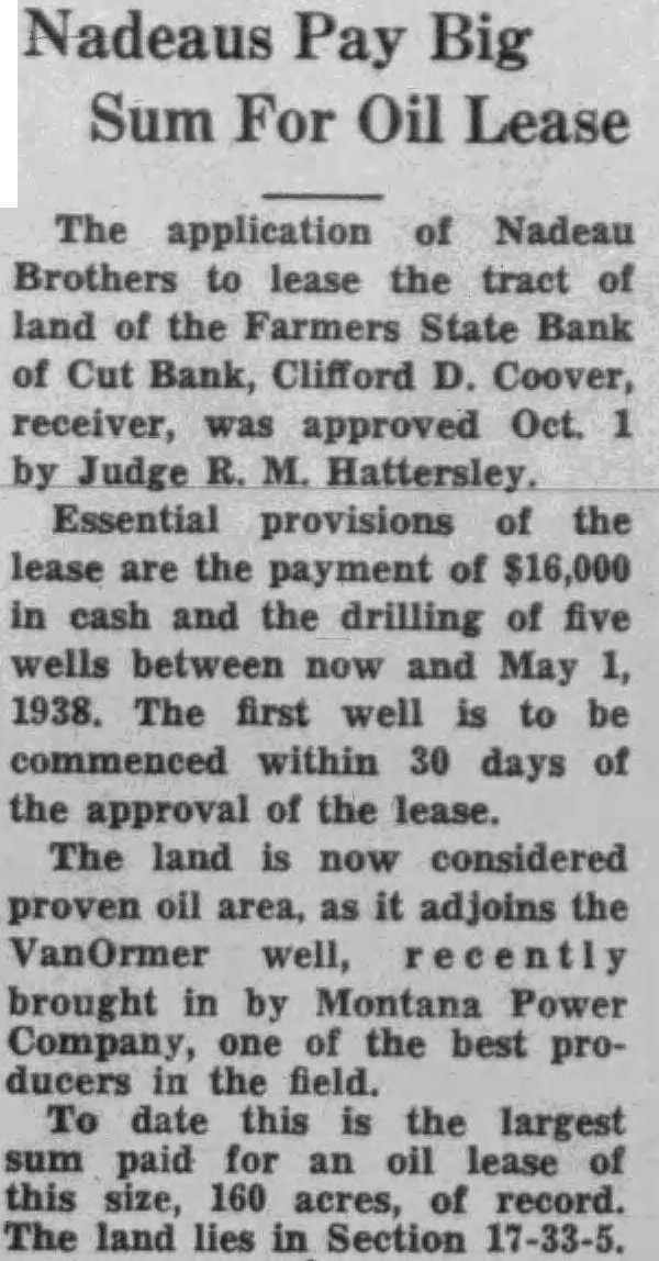 Pay For Oil The application of Nadeau Brothers to lease the tract of land of the Farmers State Bank of Cut Bank, Clifford Coover, receiver, was approved Oct. Judge Hattersley. Essential provisions of the lease are the payment of $16,000 in cash and the drilling of five wells between now and May 1938. The first well is to be commenced within 30 days of the approval of the lease. The land now considered proven oil area, adjoins the VanOrmer well, brought in by Montana Power Company, one of the best ducers in the field. To date this the largest sum paid for an oil lease of this size, 160 of record. acres, The land lies in Section