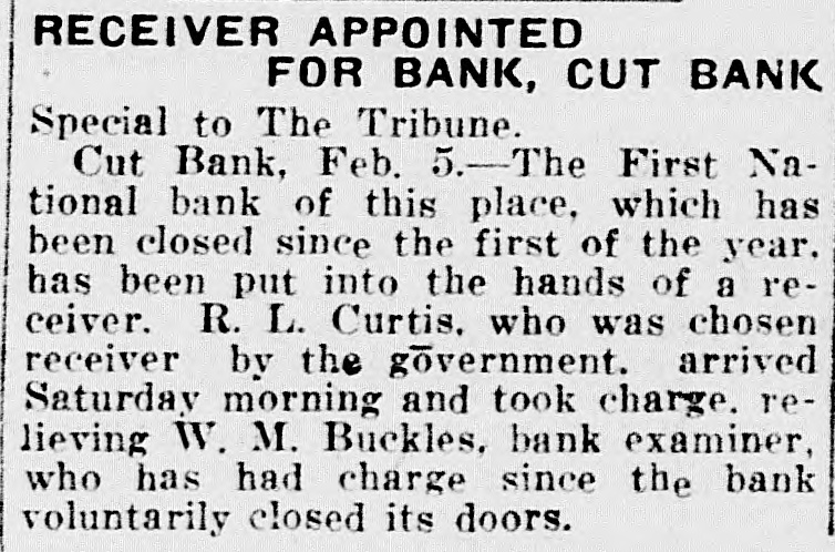 The First National Bank of Cut Bank voluntarily closed at the beginning of 1921 and was placed in receivership (receiver appointed Feb 5, 1921). Subsequent articles through 1928 show receivers handling assets and sale of remaining assets, indicating permanent closure. No articles describe a depositor run.