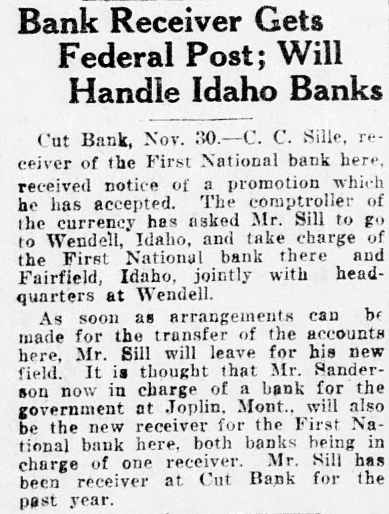 Bank Receiver Gets Federal Post; Will Handle Idaho Banks Cut Bank, Nov. 30.-C. C. Sille, receiver of the First National bank here, received notice of a promotion which he has accepted. The comptroller of the currency has asked Mr. Sill to go to Wendell, Idaho, and take charge of the First National bank there and Fairfield, Idaho, jointly with headquarters at Wendell. As soon as arrangements can be made for the transfer of the accounts here, Mr. Sill will leave for his new field. It is thought that Mr. Sanderson now in charge of a bank for the government at Joplin, Mont., will also be the new receiver for the First National bank here, both banks being in charge of one receiver. Mr. Sill has been receiver at Cut Bank for the past year.