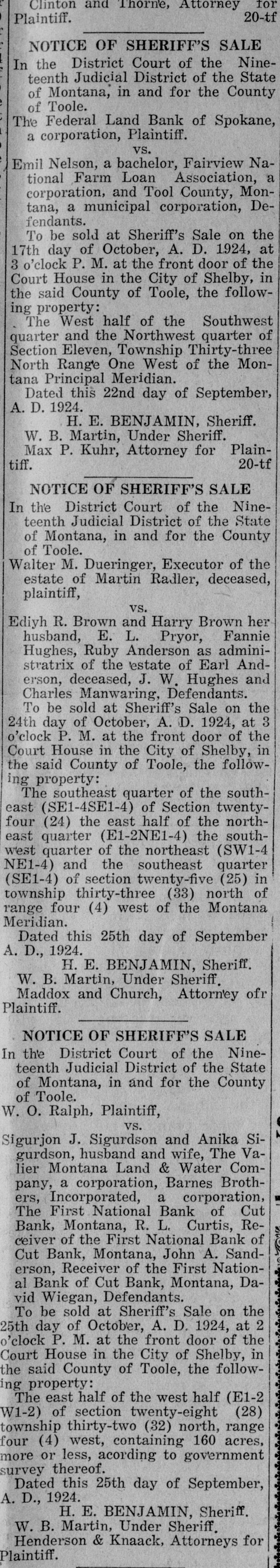 Clinton and Thorne, Attorney for 20-tf Plaintiff. NOTICE OF SHERIFF'S SALE In the District Court of the Nineteenth Judicial District of the State of Montana, in and for the County of Toole. The Federal Land Bank of Spokane, a corporation, Plaintiff. vs. Emil Nelson, a bachelor, Fairview National Farm Loan Association, a corporation, and Tool County, Montana, a municipal corporation, Defendants. To be sold at Sheriff's Sale on the 17th day of October, A. D. 1924, at 3 o'clock P. M. at the front door of the Court House in the City of Shelby, in the said County of Toole, the following property: The West half of the Southwest quarter and the Northwest quarter of Section Eleven, Township Thirty-three North Range One West of the Montana Principal Meridian. Dated this 22nd day of September, A. D. 1924. H. E. BENJAMIN, Sheriff. W. B. Martin, Under Sheriff. Max P. Kuhr, Attorney for Plain20-tf tiff. NOTICE OF SHERIFF'S SALE In the District Court of the Nineteenth Judicial District of the State of Montana, in and for the County of Toole. Walter M. Dueringer, Executor of the estate of Martin Radler, deceased, plaintiff, VS. Ediyh R. Brown and Harry Brown her husband, E. L. Pryor, Fannie Hughes, Ruby Anderson as administratrix of the estate of Earl Anderson, deceased, J. W. Hughes and Charles Manwaring, Defendants. To be sold at Sheriff's Sale on the 24th day of October, A. D. 1924, at 3 o'clock P. M. at the front door of the Court House in the City of Shelby, in the said County of Toole, the following property: The southeast quarter of the southeast (SE1-4SE1-4) of Section twentyfour (24) the east half of the northeast quarter (E1-2NE1-4) the southwest quarter of the northeast (SW1-4 NE1-4) and the southeast quarter (SE1-4) of section twenty-five (25) in township thirty-three (33) north of range four (4) west of the Montana Meridian. Dated this 25th day of September A. D., 1924. H. E. BENJAMIN, Sheriff. W. B. Martin, Under Sheriff. Maddox and Church, Attorney ofr Plaintiff. NOTICE OF SHERIFF'S SALE In the District Court of the Nineteenth Judicial District of the State of Montana, in and for the County of Toole. W. O. Ralph, Plaintiff, VS. Sigurjon J. Sigurdson and Anika Sigurdson, husband and wife, The Valier Montana Land & Water Company, a corporation, Barnes Brothers, Incorporated, a corporation, The First National Bank of Cut Bank, Montana, R. L. Curtis, Receiver of the First National Bank of Cut Bank, Montana, John A. Sanderson, Receiver of the First National Bank of Cut Bank, Montana, David Wiegan, Defendants. To be sold at Sheriff's Sale on the 25th day of October, A. D. 1924, at 2 o'clock P. M. at the front door of the Court House in the City of Shelby, in the said County of Toole, the following property: The east half of the west half (E1-2 W1-2) of section twenty-eight (28) township thirty-two (32) north, range four (4) west, containing 160 acres, more or less, acording to government survey thereof. Dated this 25th day of September, A. D., 1924. H. E. BENJAMIN, Sheriff. W. B. Martin, Under Sheriff. Henderson & Knaack, Attorneys for