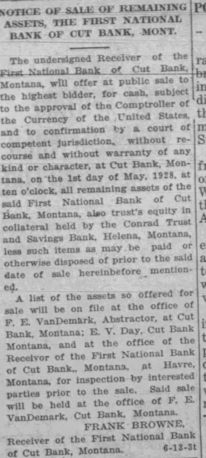 NOTICE OF SALE OF REMAINING assets, THE FIRST NATIONAL BANK OF CUT BANK, MONT. The undersigned Receiver of the First National Bank of Cut Bank, Montana, will offer at public sale to the highest bidder, for cash, subject to the approval of the Comptroller of the Currency of the United States, and to confirmation by a court of competent jurisdiction, without recourse and without warranty of any kind or character, at Cut Bank, Montana, on the 1st day of May, 1928. at ten o'clock, all remaining assets of the said First National Bank of Cut Bank, Montana, also trust's equity in collateral held by the Conrad Trust and Savings Bank, Helena, Montana, less such items as may be paid or otherwise disposed of prior to the said date of sale hereinbefore mentioned. A list of the assets so offered for sale will be on file at the office of F. E. VanDemark, Abstractor, at Cut Bank, Montana: E. V. Day, Cut Bank Montana, and at the office of the Receivor of the First National Bank of Cut Bank, Montana, at Havre, Montana, for inspection by interested parties prior to the sale. Said sale will be held at the office of F. E. VanDemark, Cut Bank, Montana. FRANK BROWNE, Receiver of the First National Bank 6-13-3t of Cut Bank, Montana.