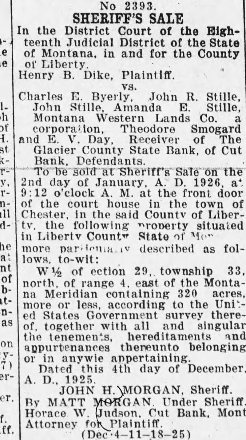 No 2393. SHERIFF'S SALE In the District Court of the Eighteenth Judicial District of the State of Montana. in and for the County Liberty Henry B. Dike, Plaintiff. Charles E. Byerly John R. Stille, John Stille, Amanda E. Stille, Montana Western Lands Co. a corpora Theodore Smogard and E.V. Day, Receiver of The Glacier County State Bank, of Cut To be sold at Sheriff's Sale on the 2nd day of January. A. D. 1926, a 12 o'clock A M at the front door of the court house in the town of Chester in the said County of Libertv the following property situated in Libertv County State more par icua described as folto-wit: W½ of ection 29, township 33, north of range 4. east of the Montana Meridian containing 320 acres, more or less, according to the Uni:ed States Government survey thereof. together with all and singular the tenements, hereditaments and appurtenances thereunto belonging or in anywie appertaining Dated this 4th day of December. A. D., 1925 JOHN H \MORGAN, Sheriff. By MATT MORGA Under Sheriff. Horace W. Judson. Cut Bank, Mont Attorney for Plaintiff.