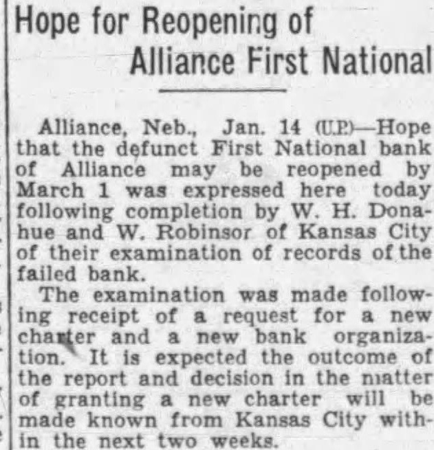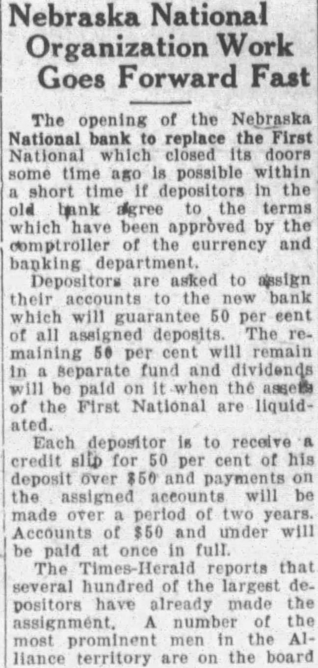 The opening of the Nebraska National bank is possible within three weeks, to succeed the defunct First National bank in Alliance, if the depositors in the First National agree to the plan laid out by the comptroller of currency and accepted by the banking department and stockholders. Briefly, the plan is: The new bank guarantees the payment of 50 percent of every assigned deposit. The remaining 50 percent of the total deposit will remain in separate fund supervised by national bank receiver and will remain the sole property of the depositors. This percent totals $680,000, and the face value of all the assets remaining in the hands of the receiver from which this amount can be paid total $1,100,000. It is believed that by this method the confidence of the community will be restored and each depositor will be better off than would be possible the entire assets were liquidated without any guarantee except as to collections made by the receiver.