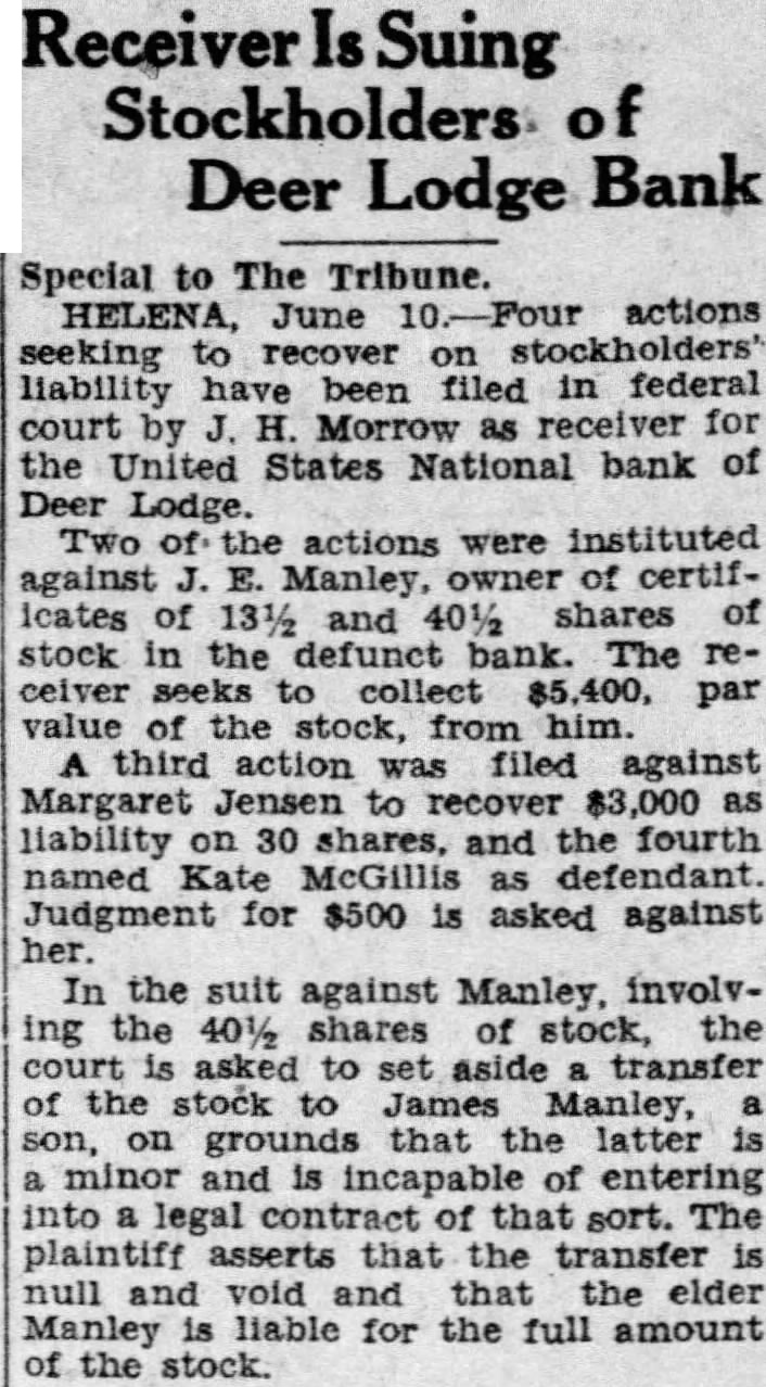 Receiver Is Suing Stockholders of Deer Lodge Bank Special to The Tribune. HELENA, June Four actions seeking to recover on stockholders' liability have been filed in federal court by J. H. Morrow as receiver for the United States National bank of Deer Lodge. Two of the actions were instituted against J. E. Manley, owner of certificates of 13½ and 401/2 shares of stock in the defunct bank. The receiver seeks to collect $5,400, par value of the stock, from him. A third action was filed against Margaret Jensen to recover $3,000 as liability on 30 shares, and the fourth named Kate McGillis as defendant. Judgment for $500 is asked against her. In the suit against Manley, involving the 401/2 shares of stock, the court is asked to set aside transfer of the stock to James Manley, son, on grounds that the latter is minor and is incapable of entering into legal of that sort. The plaintiff asserts that the transfer is null and void and that the elder Manley liable for the full amount of the stock.