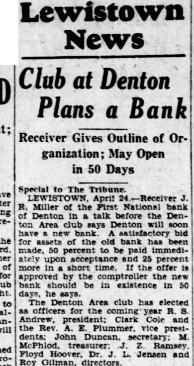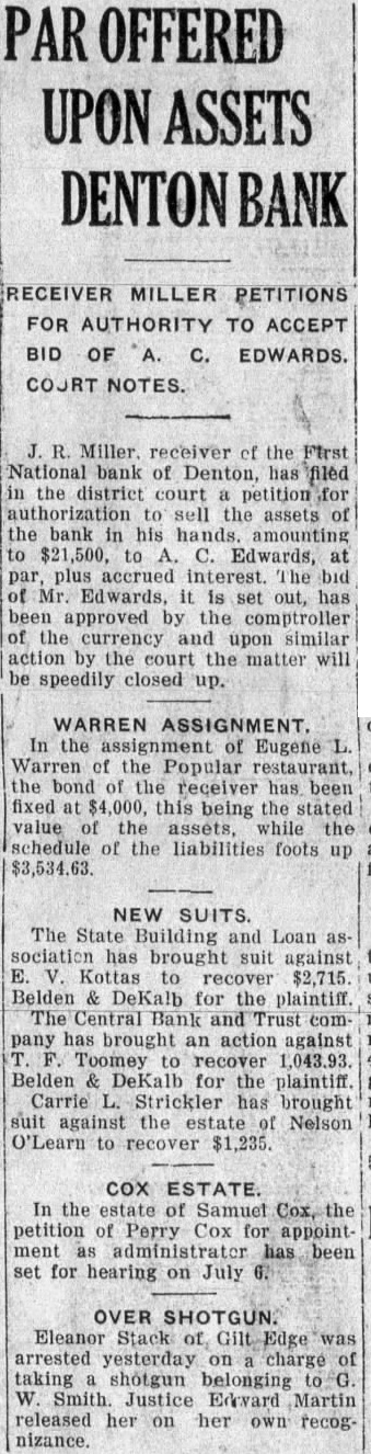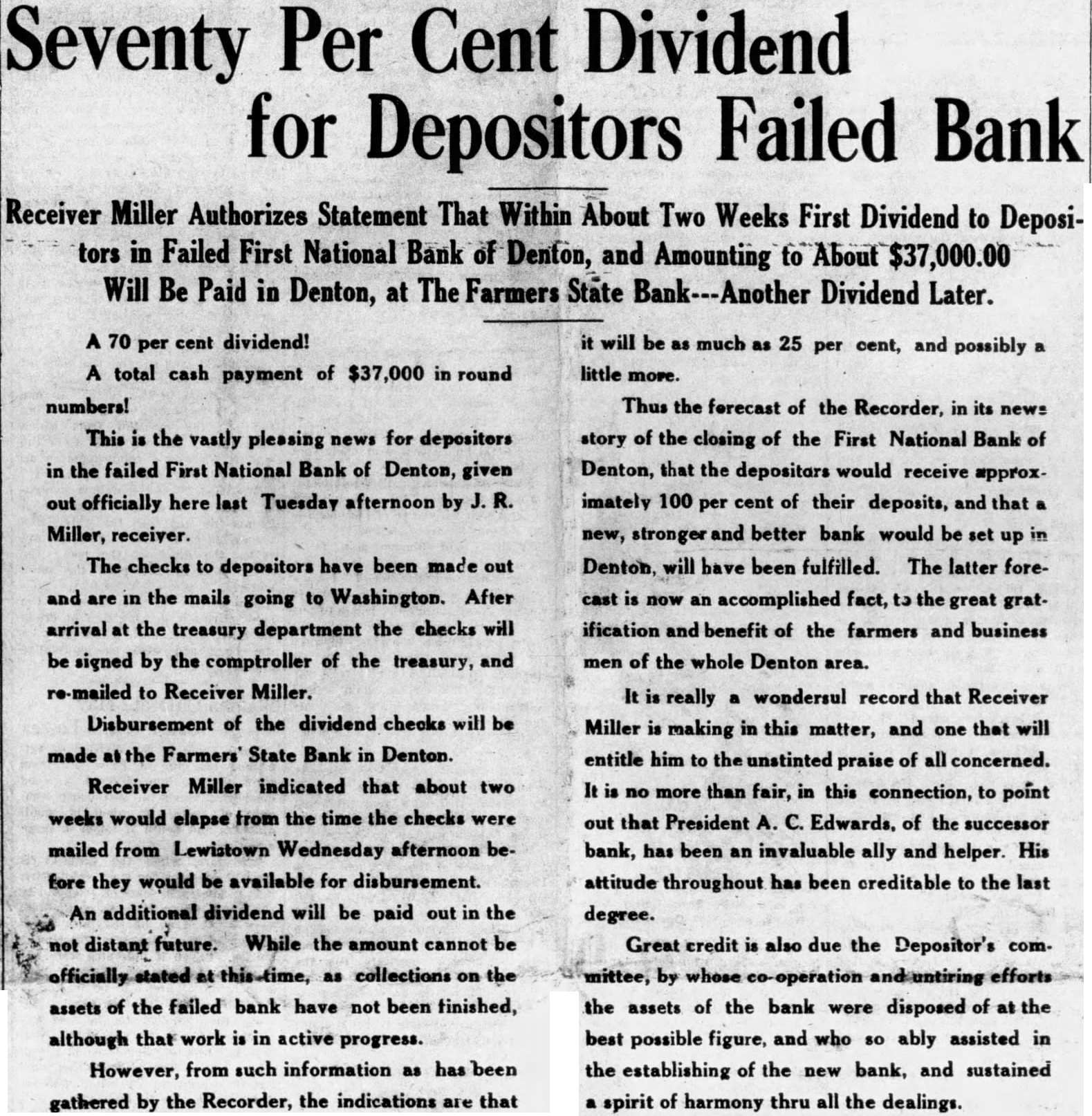 Receiver Miller Authorizes Statement That Within About Two Weeks First Dividend to Depositors in Failed First National Bank of Denton, and Amounting to About $37,000.00 Will Be Paid in Denton, at The Farmers State Bank---Another Dividend Later.