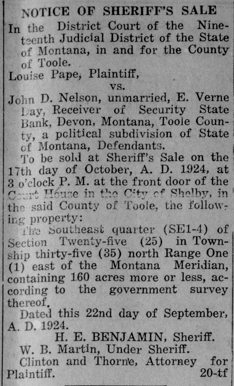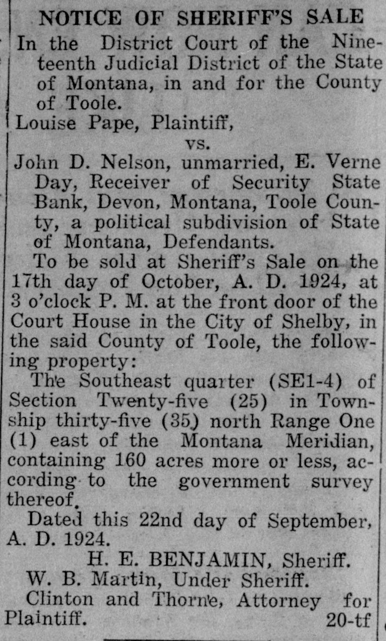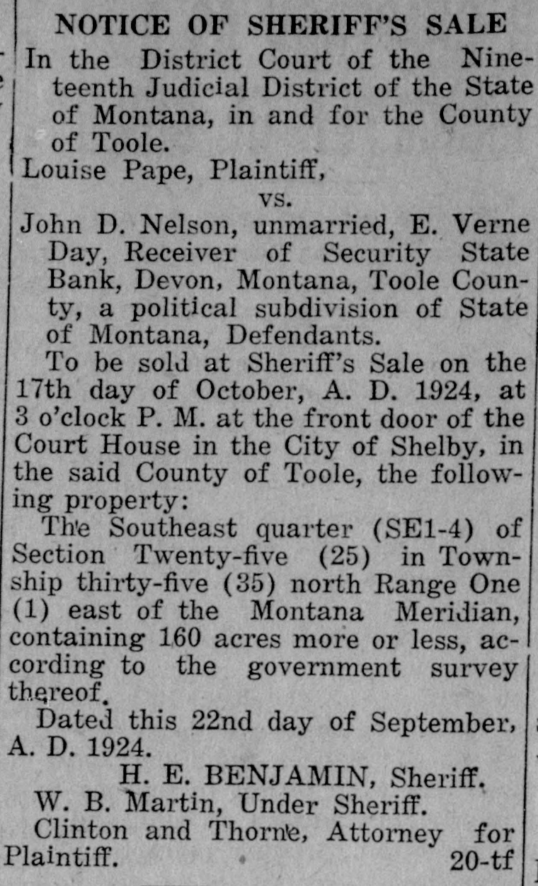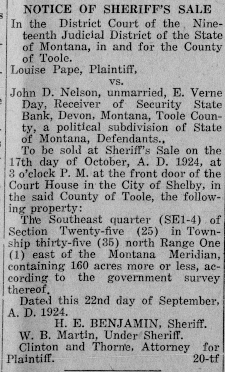 NOTICE OF SHERIFF'S SALE In the District Court of the Nineteenth Judicial District of the State of Montana, in and for the County of Toole. Louise Pape, Plaintiff, vs. John D. Nelson, unmarried, E. Verne Day, Receiver of Security State Bank, Devon, Montana, Toole County, a political subdivision of State of Montana, Defendants., To be sold at Sheriff's Sale on the 17th day of October, A. D. 1924, at 3 o'clock P. M. at the front door of the Court House in the City of Shelby, in the said County of Toole, the following property: The Southeast quarter (SE1-4) of Section Twenty-five (25) in Township thirty-five (35) north Range One (1) east of the Montana Meridian, containing 160 acres more or less, according to the government survey thereof. Dated this 22nd day of September, A. D. 1924. H. E. BENJAMIN, Sheriff. W. B. Martin, Under Sheriff. Clinton and Thorn'e, Attorney for 20-tf Plaintiff.