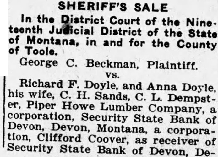 SHERIFF'S SALE In the District Court of the Nineteenth Judicial District of the State of Montana, in and for the County of Toole. George C. Beckman, Plaintiff. Richard F. Doyle, and Anna Doyle, his wife, C. H. Sands, C. L. Dempster, Piper Howe Lumber Company, corporation, Security State Bank of Devon, Devon, Montana, corporation, Clifford Coover, as receiver of Security State Bank of Devon, De-