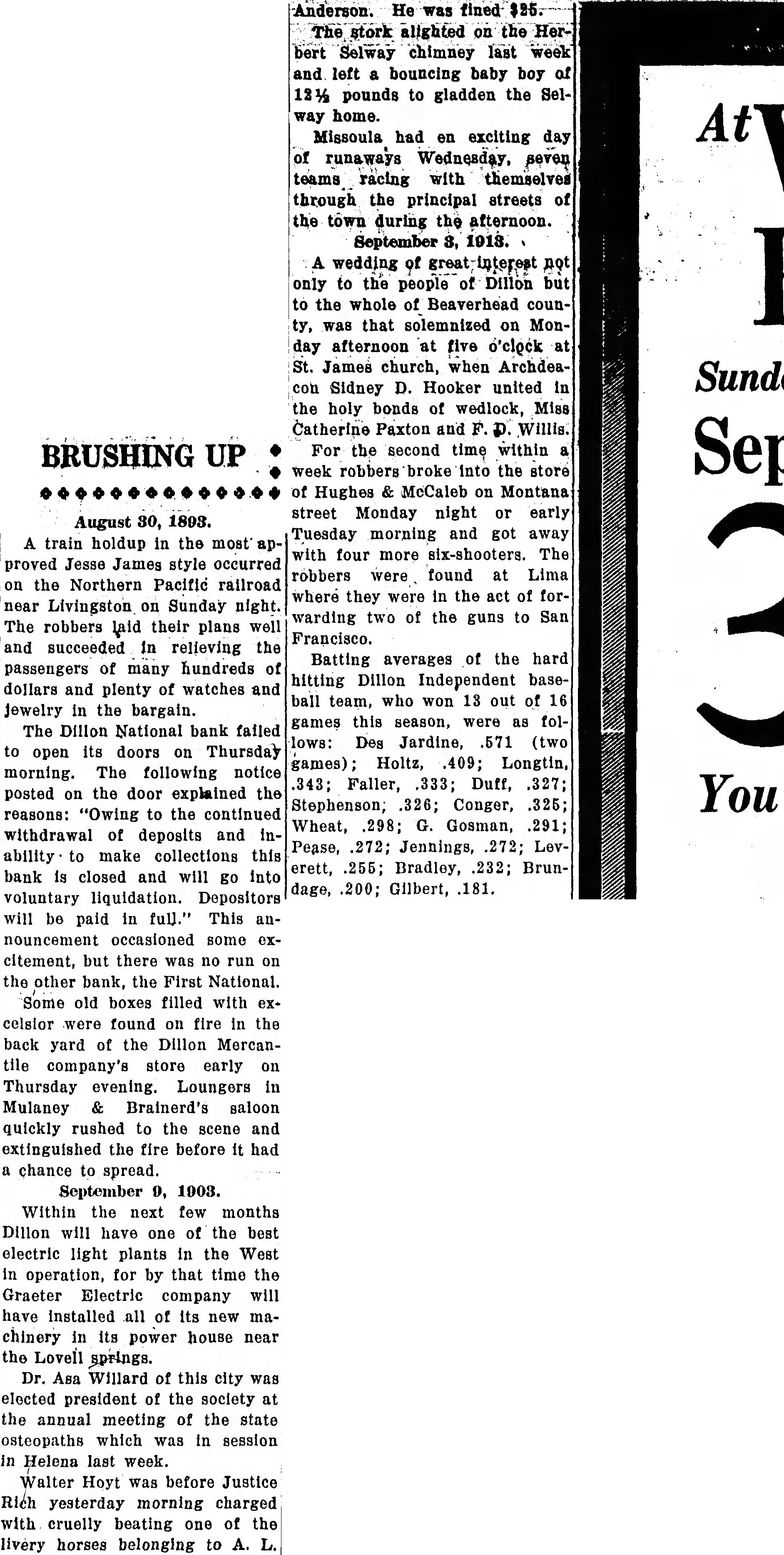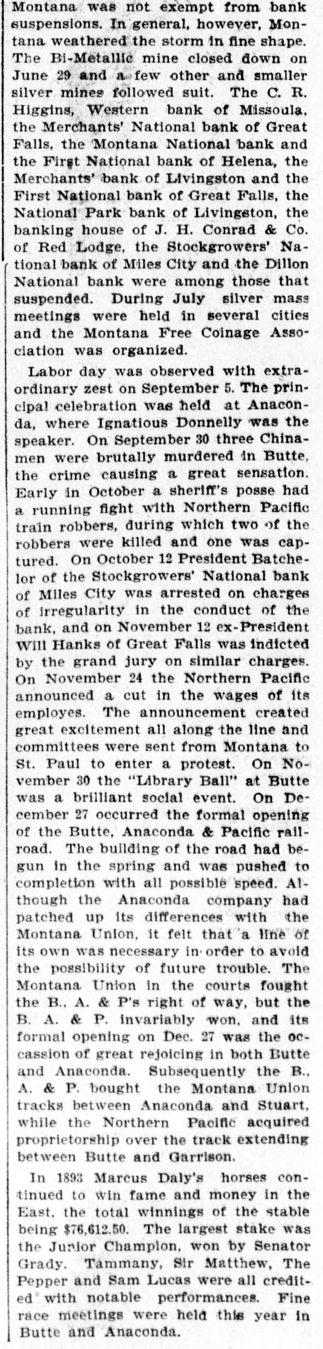 Montana was not exempt from bank suspensions. In general, however, Montana weathered the storm in fine shape. The Bi-Metallic mine closed down on June 29 and a few other and smaller silver mines followed suit. The C. R. Higgins, Western bank of Missoula, the Merchants' National bank of Great Falls, the Montana National bank and the First National bank of Helena, the Merchants' bank of Livingston and the First National bank of Great Falls, the National Park bank of Livingston, the banking house of J. H. Conrad & Co. of Red Lodge, the Stockgrowers' National bank of Miles City and the Dillon National bank were among those that suspended. During July silver mass meetings were held in several cities and the Montana Free Coinage Association was organized. Labor day was observed with extraordinary zest on September 5. The principal celebration was held at Anaconda, where Ignatious Donnelly was the speaker. On September 30 three Chinamen were brutally murdered in Butte, the crime causing a great sensation. Early in October a sheriff's posse had a running fight with Northern Pacific train robbers, during which two of the robbers were killed and one was captured. On October 12 President Batchelor of the Stockgrowers' National bank of Miles City was arrested on charges of irregularity in the conduct of the bank, and on November 12 ex-President Will Hanks of Great Falls was indicted by the grand jury on similar charges. On November 24 the Northern Pacific announced a cut in the wages of its employes. The announcement created great excitement all along the line and committees were sent from Montana to St. Paul to enter a protest. On November 30 the "Library Ball" at Butte was a brilliant social event. On December 27 occurred the formal opening of the Butte, Anaconda & Pacific railroad. The building of the road had begun in the spring and was pushed to completion with all possible speed. A1though the Anaconda company had patched up its differences with the Montana Union, it felt that a line of its own was necessary in order to avoid the possibility of future trouble. The Montana Union in the courts fought the B., A. & P's right of way, but the B. A. & P. invariably won, and its formal opening on Dec. 27 was the OCcassion of great rejoicing in both Butte and Anaconda. Subsequently the B., A. & P. bought the Montana Union tracks between Anaconda and Stuart, while the Northern Pacific acquired proprietorship over the track extending between Butte and Garrison. In 1893 Marcus Daly's horses continued to win fame and money in the East, the total winnings of the stable being $76,612.50. The largest stake was the Junior Champion, won by Senator Grady. Tammany, Sir Matthew, The Pepper and Sam Lucas were all credited with notable performances. Fine race meetings were held this year in Butte and Anaconda.