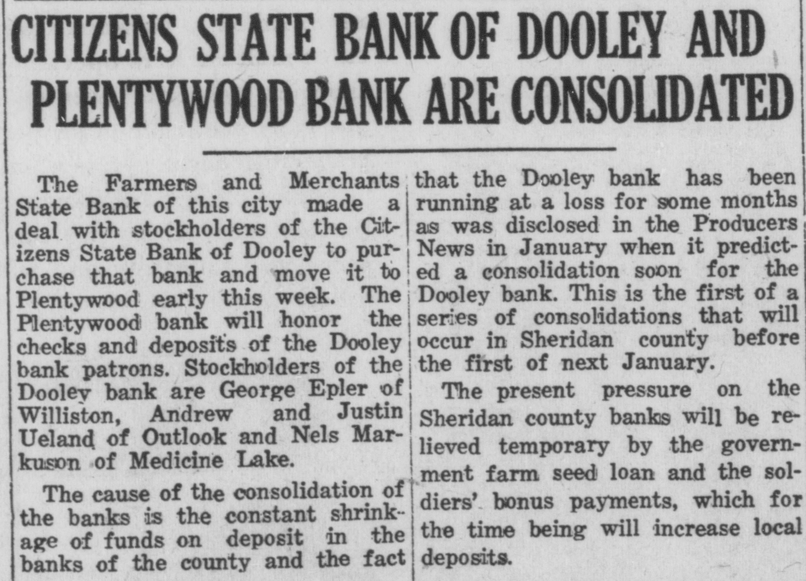 CITIZENS STATE BANK OF DOOLEY AND PLENTYWOOD BANK ARE CONSOLIDATED The Farmers and Merchants that the Dooley bank has been running at a loss for some months State Bank of this city made a as was disclosed in the Producers deal with stockholders of the CitNews in January when it predictizens State Bank of Dooley to pured a consolidation soon for the chase that bank and move it to Dooley bank. This is the first of a Plentywood early this week. The series of consolidations that will Plentywood bank will honor the occur in Sheridan county before checks and deposits of the Dooley the first of next January. bank patrons. Stockholders of the The present pressure on the Dooley bank are George Epler of Williston, Andrew and Justin Sheridan county banks will be reUeland of Outlook and Nels Marlieved temporary by the governkuson of Medicine Lake. ment farm seed loan and the solThe cause of the consolidation of diers'. bonus payments, which for the banks is the constant shrinkthe time being will increase local age of funds on deposit in the deposits. banks of the county and the fact