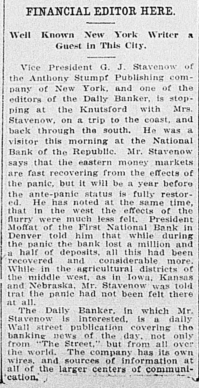 # FINANCIAL EDITOR HERE. Well Known New York Writer a Guest in This City. Vice President G. J. Stavenow of the Anthony Stumpf Publishing company of New York, and one of the editors of the Daily Banker, is stopping at the Knutsford with Mrs. Stavenow, on a trip to the coast, and back through the south. He was a visitor this morning at the National Bank of the Republic. Mr. Stavenow says that the eastern money markets are fast recovering from the effects of the panic, but it will be a year before the ante-panic status is fully restored. He has noted at the same time, that in the west the effects of the flurry were much less felt. President Moffat of the First National Bank in Denver told him that while during the panic the bank lost a million and a half of deposits, all this had been recovered and considerable more. While in the agricultural districts of the middle west, as in Iowa, Kansas and Nebraska, Mr. Stavenow was told trat the panic had not been felt there at all. The Daily Banker, in which Mr. Stavenow is interested, is a daily Wall street publication covering the banking news of the day, not only from "The Street," but from all over the world. The company has its own wires, and sources of information at all of the larger centers of communication.