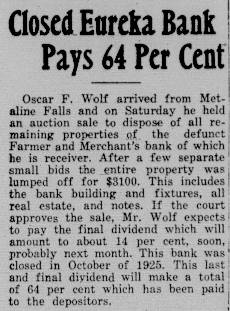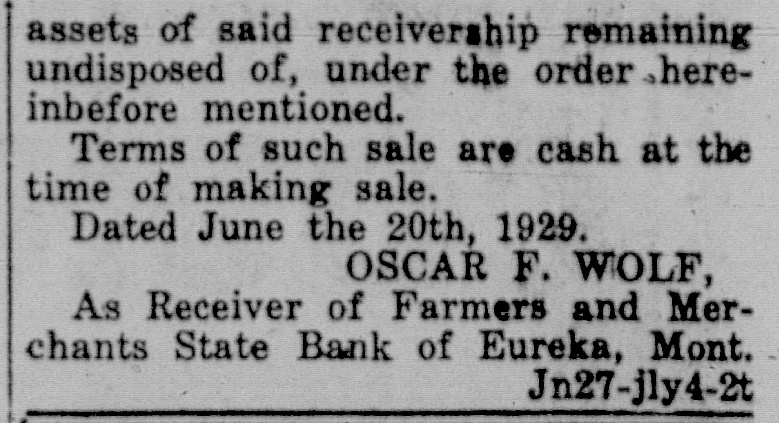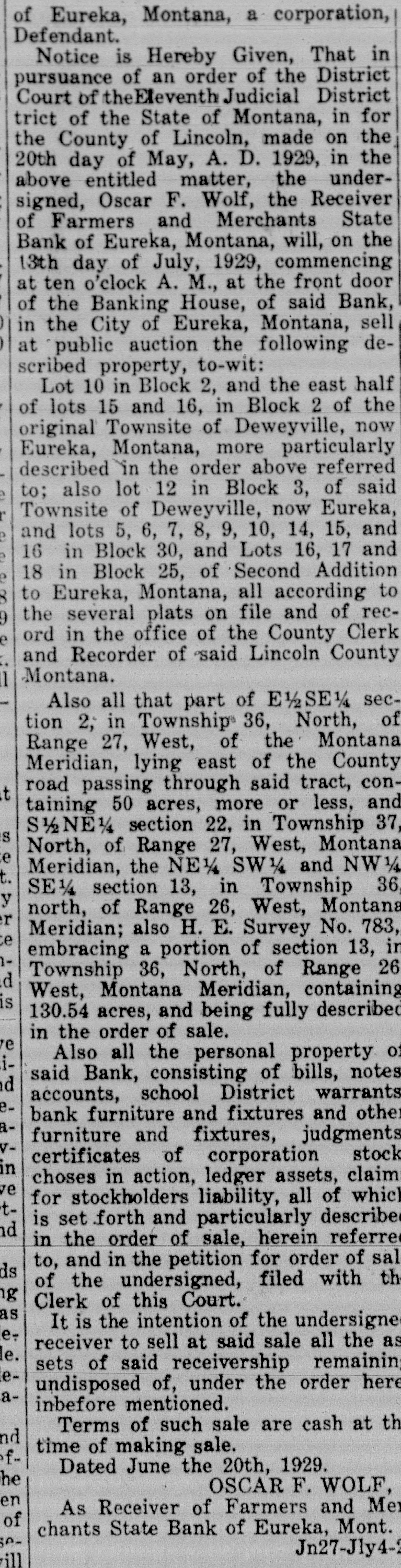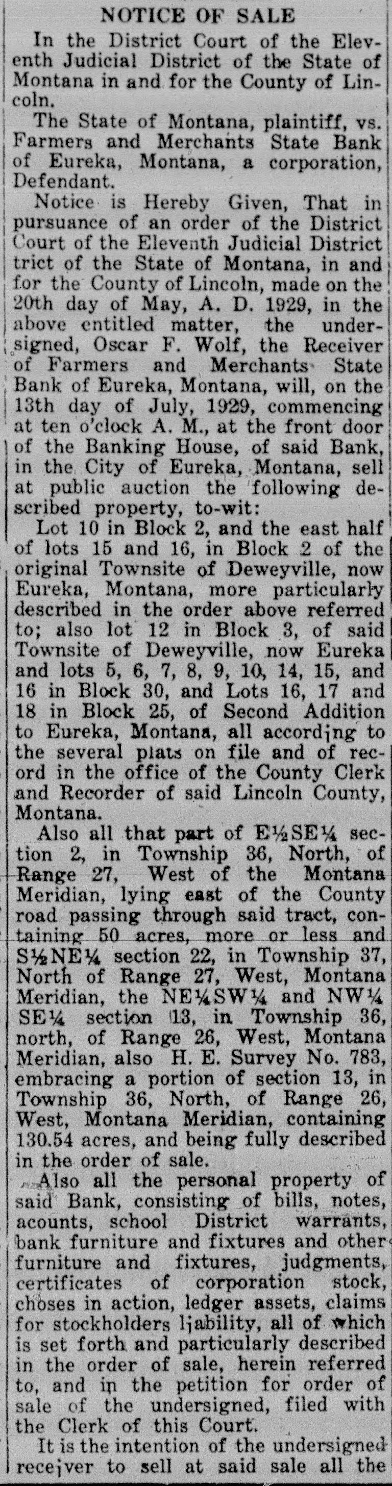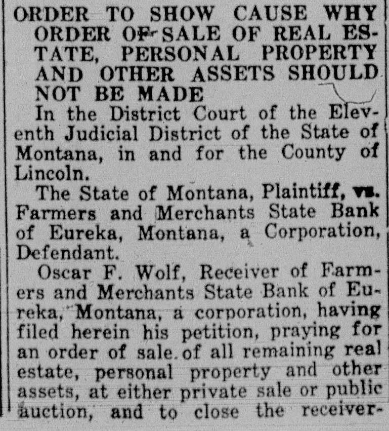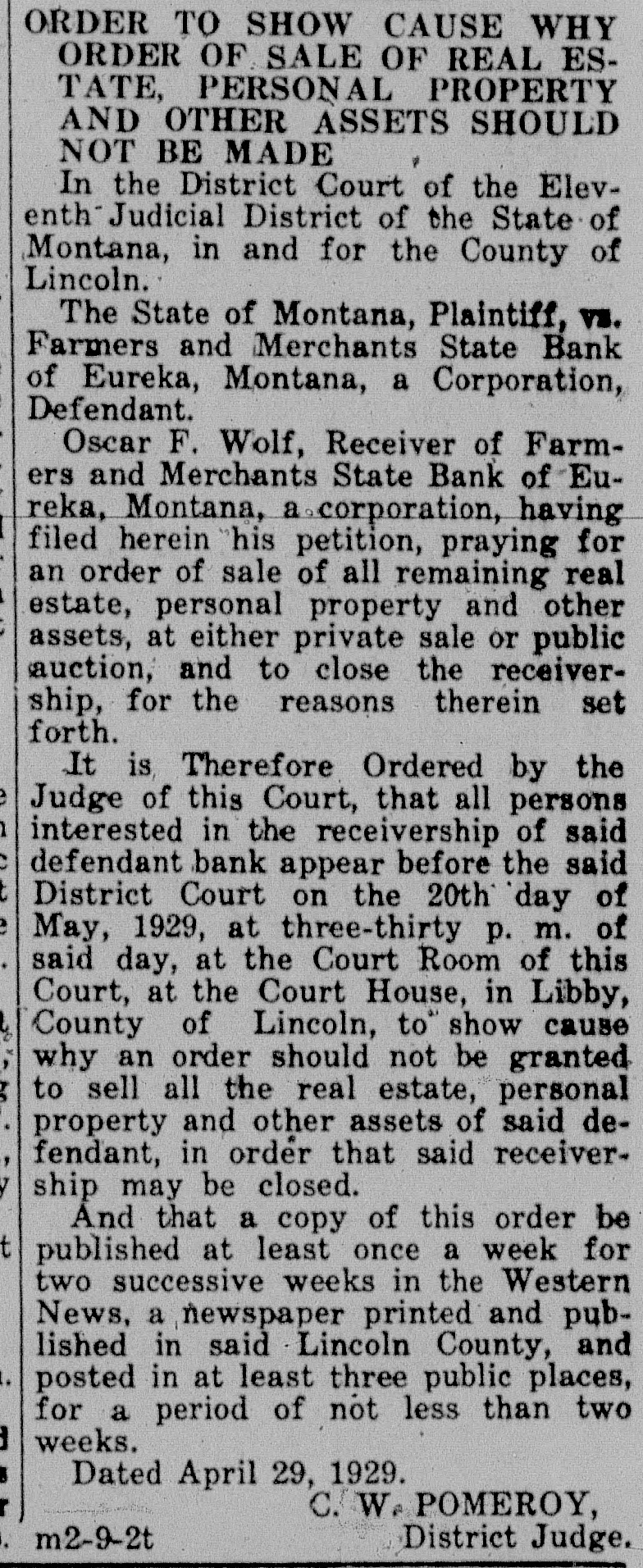 ORDER TO SHOW CAUSE WHY ORDER OF SALE OF REAL ESTATE, PERSONAL PROPERTY AND OTHER ASSETS SHOULD NOT BE MADE In the District Court of the Eleventh Judicial District of the State of Montana, in and for the County of Lincoln. The State of Montana, Plaintiff, vs. Farmers and Merchants State Bank of Eureka, Montana, a Corporation, Defendant. Oscar F. Wolf, Receiver of Farmers and Merchants State Bank of Eureka, Montana, a corporation, having filed herein his petition, praying for an order of sale of all remaining real estate, personal property and other assets, at either private sale or public auction, and to close the receivership, for the reasons therein set forth. It is Therefore Ordered by the Judge of this Court, that all persons interested in the receivership of said defendant bank appear before the said District Court on the 20th day of May, 1929, at three-thirty p. m. of said day, at the Court Room of this Court, at the Court House, in Libby, County of Lincoln, to" show cause why an order should not be granted to sell all the real estate, personal property and other assets of said defendant, in order that said receivership may be closed. And that a copy of this order be published at least once a week for two successive weeks in the Western News, a newspaper printed and published in said Lincoln County, and posted in at least three public places, for a period of not less than two weeks. Dated April 29, 1929. C.W. POMEROY, m2-9-2t District Judge.