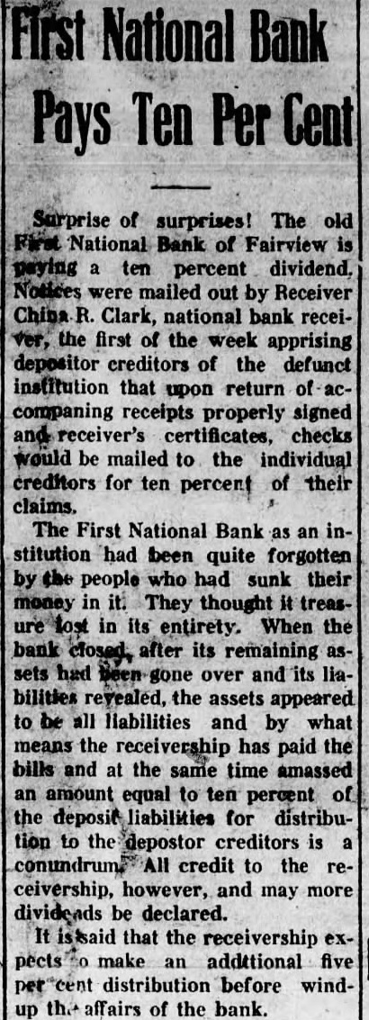 First National Bank Pays Ten Per Cent Surprise of surprises! The old First National Bank of Fairview is paying a ten percent dividend. Notices were mailed out by Receiver China R. Clark, national bank receiver, the first of the week apprising depositor creditors of the defunct institution that upon return of accompaning receipts properly signed and receiver's certificates, checks would be mailed to the individual creditors for ten percent of their claims. The First National Bank as an institution had been quite forgotten by the people who had sunk their money in it. They thought it treasure lost in its entirety. When the bank closed, after its remaining assets had been gone over and its liabilities revealed, the assets appeared to be all liabilities and by what means the receivership has paid the bills and at the same time amassed an amount equal to ten percent of the deposit liabilities for distribution to the depostor creditors is a conundrum, All credit to the receivership, however, and may more dividends be declared. It is said that the receivership expects make an additional five per cent distribution before windup the affairs of the bank.