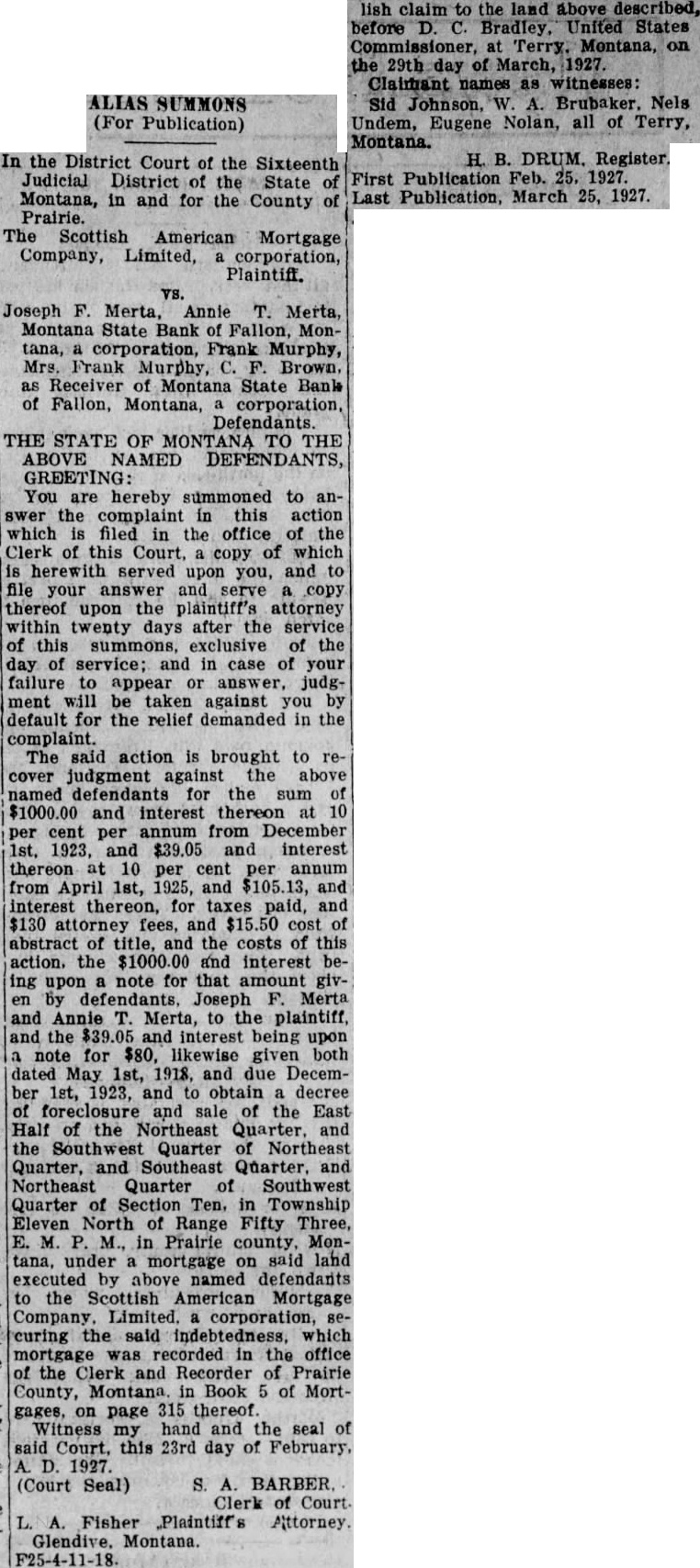 SUMMONS (For Publication) In the District Court of the Sixteenth Judicial District of the State Montana, in and for the County Prairie. The Scottish American Mortgage Company, Limited, corporation, Plaintiff. Joseph Merta, Annie T. Merta, Montana State Bank of Fallon, Montana, corporation, Frank Murphy, Mrs. Frank Murphy, Brown. as Receiver of Montana State Bank of Fallon, Montana, corporation, THE STATE OF TO THE ABOVE NAMED DEFENDANTS, GREETING: You are hereby summoned to answer the complaint in this action which filed in the office of the Clerk of this Court, copy of which herewith served upon you, and file your answer and serve copy thereof upon the plaintiff's attorney twenty days after the service this summons, exclusive of the day of service; and case of your failure appear or judgment be taken against you by default for the relief demanded in the complaint. The said action is brought to cover judgment against the above named defendants for the sum and interest thereon cent per annum from December 1923, and $39.05 and interest thereon at 10 per cent per annum from April 1st, 1925, and and interest thereon, for taxes paid, and $130 fees, and cost of abstract of title, the costs of this action. the $1000.00 and interest ing upon note for that amount by Joseph Merta Annie Merta, to the plaintiff, the $39.05 and interest being upon note for likewise given both dated May 1st, 1918, and due December 1st, 1923, and to obtain decree foreclosure and sale the East Half the Northeast Quarter, and Quarter of Northeast Quarter, and Southeast Quarter. Northeast Quarter of Southwest Quarter of Section Ten. in Township Eleven North of Range Fifty Three, Prairie county, Montana, under mortgage on said land executed by above named defendants to the Scottish American Mortgage curing the said which was recorded in the office of the Clerk and Recorder of Prairie County, Montana in Book of Mortgages, on page 315 thereof. Witness my hand and the seal of Court, this 23rd day of (Court Seal) BARBER. Clerk Court Fisher Plaintiff's Attorney Glendive. Montana. lish claim to the land above before Bradley, United States Commissioner, at Terry. Montana, on 29th day of March, Claimant names as witnesses: Sid Johnson, Nels Undem, Eugene Nolan, all of Terry, Montana. DRUM. Register. First Publication Feb. 25. 1927. Last March 25, 1927.