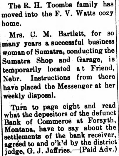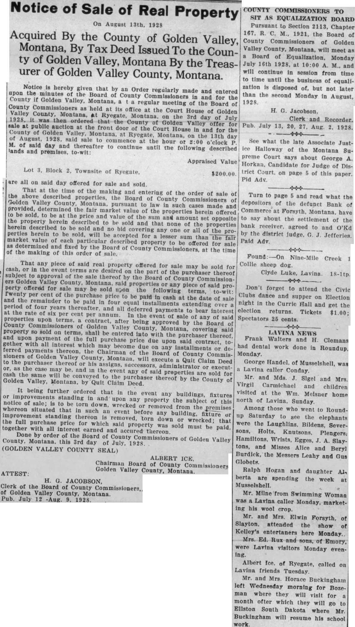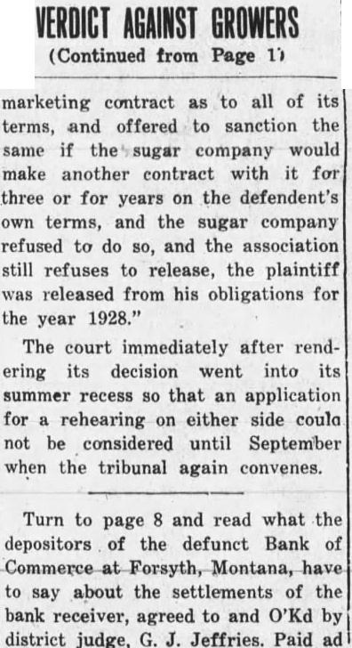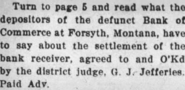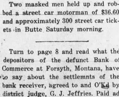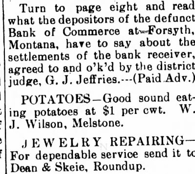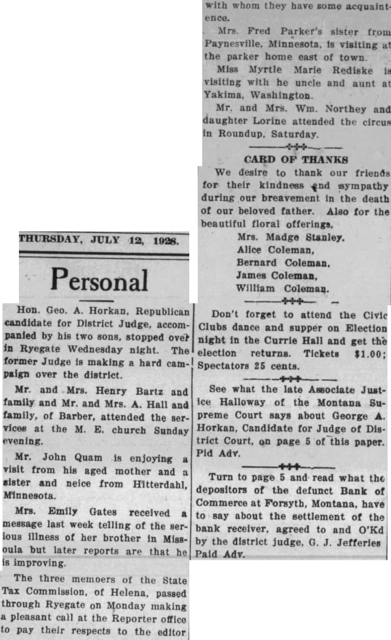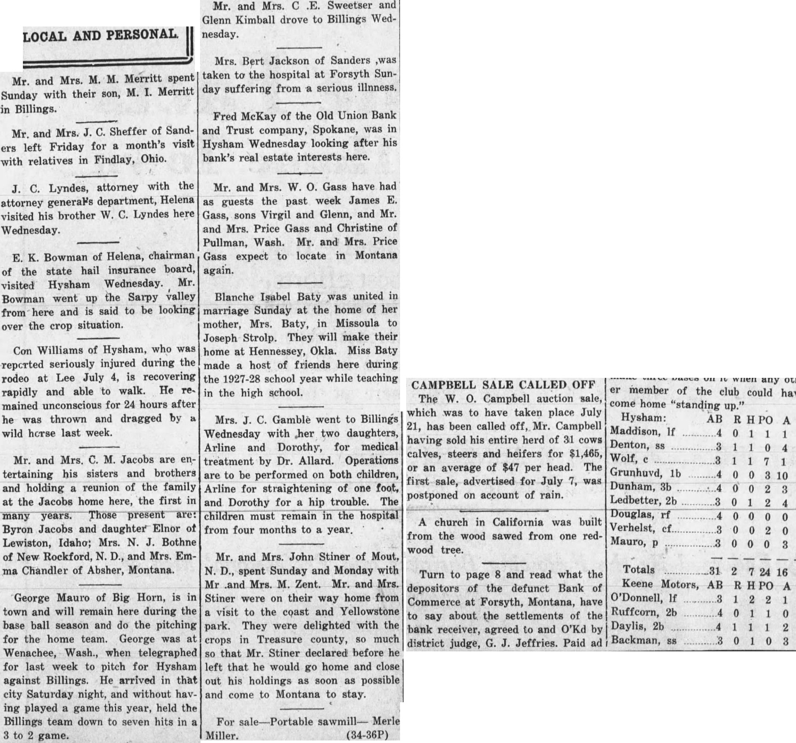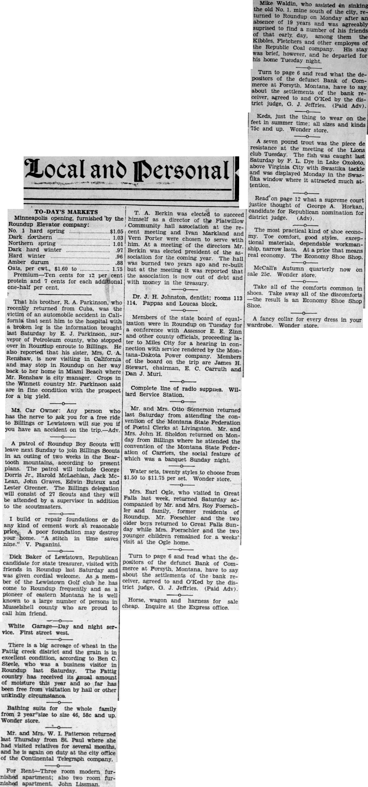 Local and Personal Despite the weirdest kind of umpiring Roundup defeated Hardin at Hardin last Sunday by a score of 14 to 13. The umpiring was so bad that in justice to Roundup Claud Mays was called to oversee the bases while Hardin tried out two men at the plate. The grounds were wet and the day was far from ideal for baseball. Next Sunday the Keene Motors, the strong Billings team, will meet the locals at the fair grounds, the game beginning at 3 o'clock. The Keene Motors is the team that played the House of David club in Billings recently and made the best showing against the bewhiskered gentlemen of any team in the state. Negotiations are on for a game in Roundup on July 29 with a team of Crow Indians as opponents. A number of the Indians are Carlyle graduates and are finished players. Round trip bus fare to Lewistown $8.25; to Billings $7.50. Phone 93. A large crowd attended the Christy Bros. circus last Saturday afternoon and evening and witnessed the best wild animal and acrobatic performance ever seen in Roundup. The show is clean and interesting from start to finish and the performance was highly praised by all who saw it. The Christy production is not on as large a scale as some circuses which have come to Roundup but it lacks nothing in quality and was well worth the price, even though the admission charge seemed to some to be high. Complete line of radio supplies. Willard Service Station. Mr. and Mrs. Joseph Kenda, accompanied by Anna Tosic, who has been working in Bozeman for the last year, motored to Billings last week and spent the week end with their sister, Mrs. Frank Gregory, and Antoinette Tosic who is spending the summer with Mr. and Mrs. Gregory. Miss Anna Tosic has been spending the last month in Klein and Roundup visiting relatives and friends and will return to Bozeman next week where she will resume her work in the hospital. Try Ford ammonium sulphate for the lawn and garden; 10 pound package $1. F. T. McCormick Co. Norman M. Moody was elected second vice president of the Loyal Order of Moose in Montana at the state convention in Livingston last week and Roundup was selected as the place of meeting next year. Butte, the only other candidate, withdrew in order to make the decision unanimous The selection of Roundup was in recognition of the fact that from here went the largest delegation sent by any local lodge in the state. Read on page 12 what supreme court justice thought of George A. Horkan. candidate for Republican nomination for district judge. (Adv). Best wishes for the success of the Democratic party in Musselshell county and for the national ticket are expressed in a letter received Monday from J. M. Mulligan. Mr. Mulligan stated that at the time of writing a heavy rain was falling in the Billings country, and declares it "is the first this season." By recommendation of the state high school inspector the high schools at Roundup, Klein, Musselshell, Melstone, Lavina, Ryegate and Winnett have been placed on the accredited list for the coming year. They don't make automobiles that you can run to Billings and back for $7.50. Ride the stage. Phone 93. John Elich left Monday for Seattle to assist in the completion of a contract in which he had previously become interested and will remain for at least three Furnished apartments, also furnished four room cottage, for rent. Phone 34-W. Fever caused by the bite of a tick is given as the cause of the death last Friday of Frank Gordon, aged 62 years. Gordon came from Martinsdale two months ago to take charge of the George Johnson ranch in the Bull mountains. He came the previous Saturday to the Johnson home near Gibbtown to consult Mrs Johnson as to a strawberry bed at the farm and was so ill that he could not return, remaining at the Johnson home until death came. A brother arrived from Winona, Minn., and made arrangements with Undertaker J. A. Smith for shipment of the body to that place for burial. Gordon is survived by two other brothers and two sisters. none of them resididents of Montana. Turn to page 6 and read what the depositors of the defunct Bank of Commerce at Forsyth, Montana, have to say about the settlements of the bank receiver, agreed to and O'Ked by the district judge, G. J. Jeffries. (Paid Adv). A proposal for enactment of a state prohibition law will be found on the ballot at the November election, a sufficient number of signers having been obtained to petitions and Governor Erickson having issued the proclamation last Saturday. The measure. known as No. 32, reads: "A law to enact all the provisions of the Volstead act relating to pleading, evidence, definitions, prohibitions and penalties as the law of the state of Montana, to provide for the enforcement thereof and defining the term Volstead act." No enforcement bureau will be created and all work along this line will be done by county and city officials. Dr. E. G. Vedova, dentist, X-ray examInation. Roundup, Montana. Miss Mary P. Vertin has arrived safely in Spokane, where she was met by her cousin, Gene M. Shukle, and the following day they left for Kellogg, Ida., to visit relatives and friends. and they are now visiting at Miss Shukle's home in Elk. Wash. Within a few days they will leave by automobile for Seattle. Tacoma, and Portland and later in the season both will accept employment in Spokane For Sale-New and used washing machines. Electric range, Delco-Light Plant, automatic. N. H. Mees. Dr. C. G. Stocker, dentist. room 104, Wall building, phone 104. Mr. and Mrs. H. L. Allen and their son Nat left last Friday for an automobile trip to Indiana, Pennsylvania and possibly New York. expecting to be absent until about September 1. During his absence Mr. Allen will visit eastern market centers and purchase his winter stock of men's goods. Meanwhile Tyner Allen will carry on at the establishment on Main street. One day battery service. Willard Service Station. D. J. Dundas, assistant cashier of the Miners and Merchants bank who left by autom