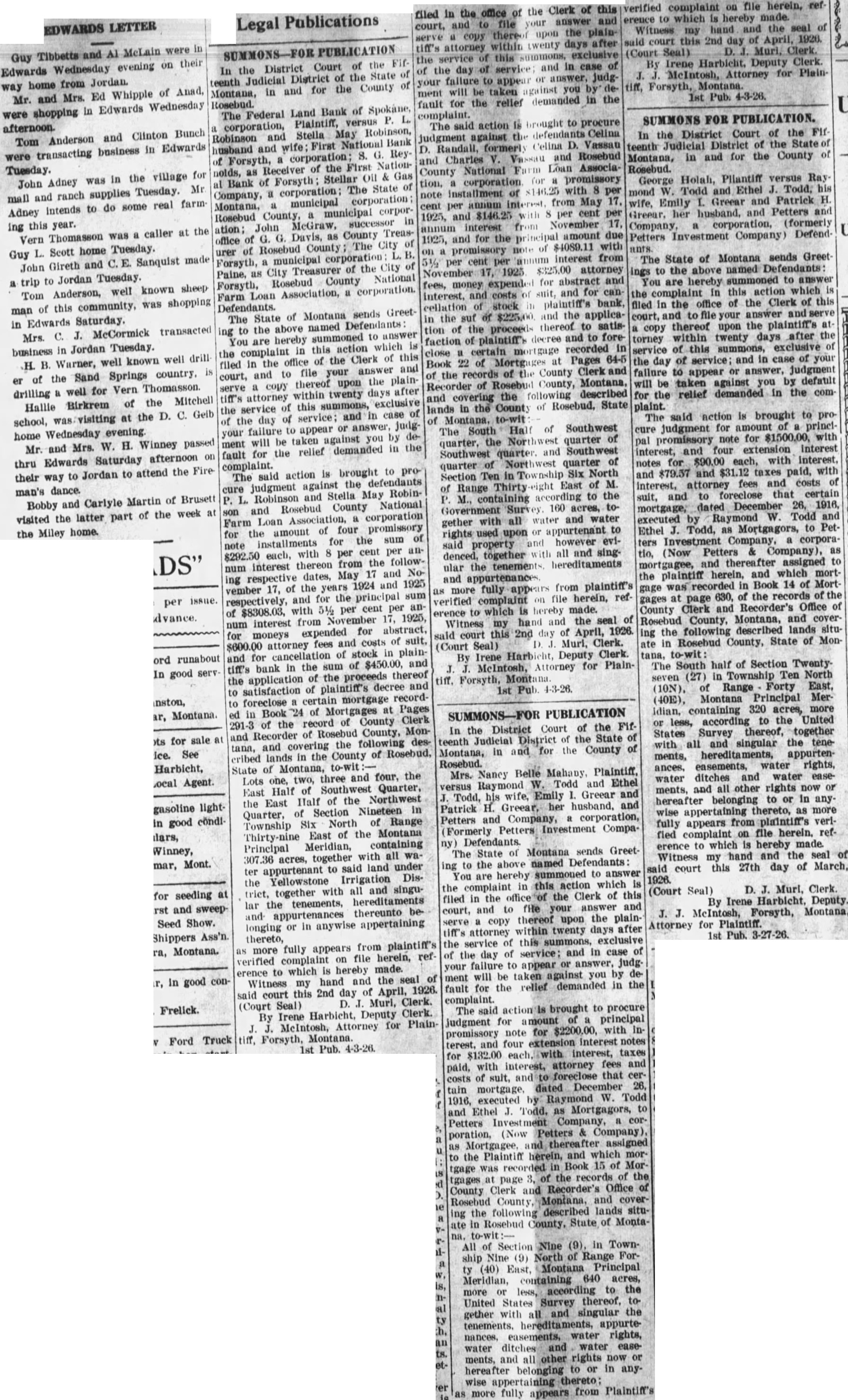 SUMMONS-FOR PUBLICATION In the District Court of the Fifteenth Judicial District of the State of Montana, in and for the County of Rosebud. Mrs. Nancy Belle Mahany, Plaintiff, versus Raymond W. Todd and Ethel J. Todd, his wife, Emily I. Greear and Patrick H. Greear, her husband, and Petters and Company, a corporation, (Formerly Petters Investment Company) Defendants. The State of Montana sends Greeting to the above named Defendants You are hereby summoned to answer the complaint in this action which is filed in the office of the Clerk of this court, and to file your answer and serve a copy thereof upon the plaintiff's attorney within twenty days after the service of this summons, exclusive of the day of service: and in case of your failure to appear or answer, judg ment will be taken against you by default for the relief demanded in the complaint. The said action's brought to procure judgment for amount of a principal promissory note for $2200.00, with interest, and four extension Interest notes for $132.00 each, with interest, taxes paid, with interest, attorney fees and costs of suit, and foreclose that certain mortgage, dated December 26, 1916, executed by Raymond W. Todd and Ethel J. Todd, as Mortgagors, to Petters Investment Company, a corporation, (Now Petters & Company), as Mortgagee, and thereafter assigned to the Plaintiff herein, and which mortgage was recorded in Book 15 of Mortgages at page 3, of the records of the County Clerk and Recorder's Office of Rosebud County, Montana, and covering the following described lands situate in Rosebud County, State of Montana. to-wit All of Section Nine (9), in Township Nine (9) North of Range Forty (40) East, Montana Principal Meridian, containing 640 acres, more or less, according to the United States Survey thereof, together with all and singular the tenements. hereditaments, appurtenances, easements, water rights, water ditches and water easements, and all other rights now or hereafter belonging to or in anywise appertaining thereto; as more fully appears from Plaintiff's verified complaint on file herein, ref erence to which is hereby made. Witness my hand and the seal of said court this 2nd day of April, 1926. (Court Seal) D. J. Muri, Clerk. By Irene Harbicht, Deputy Clerk. J. J. McIntosh, Attorney for Plaintime, Forsyth, Montana. 1st Pub. 4-3-26.