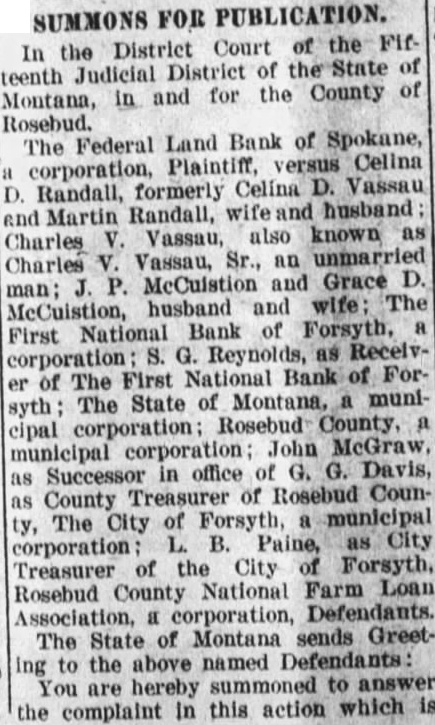 SUMMONS-FOR PUBLICATION In the District Court of the Fifteenth Judicial District of the State of Montana, in and for the County of Rosebud. The Federal Land Bank of Spokane, corporation, Plaintiff, versus P. L. a Robinson and Stella May Robinson, husband and wife; First National Bank of Forsyth, a corporation; S. G. Reynolds, as Receiver of the First National Bank of Forsyth ; Stellar Oil & Gas Company, a corporation; The State of Montana, a municipal corporation; Rosebud County, a municipal corporation; John McGraw, successor in office of G. G. Davis, as County Treasurer of Rosebud County The City of Forsyth, a municipal corporation: L. B. Paine, as City Treasurer of the City of Forsyth, Rosebud County National Farm Loan Association, a corporation. Defendants. The State of Montana sends Greeting to the above named Defendants: You are hereby summoned to answer the complaint in this action which is filed in the office of the Clerk of this court, and to file your answer and serve a copy thereof upon the plaintiff's attorney within twenty days after the service of this summons, exclusive of the day of service; and in case of your failure to appear or answer, judgment will be taken against you by default for the relief demanded in the complaint. The said action is brought to procure judgment against the defendants P. L. Robinson and Stella May Robinson and Rosebud County National Farm Loan Association, a corporation for the amount of four promissory note installments for the sum of $292.50 each, with 8 per cent per annum interest thereon from the following respective dates, May 17 and November 17, of the years 1924 and 1925 respectively, and for the principal sum of $8308.03, with 5½ per cent per annum interest from November 17, 1925, for moneys expended for abstract, $600.00 attorney fees and costs of suit, and for cancellation of stock in plaintiff's bank in the sum of $450.00, and the application of the proceeds thereof to satisfaction of plaintiff's decree and to foreclose a certain mortgage recorded in Book 24 of Mortgages at Pages 291-3 of the record of County Clerk and Recorder of Rosebud County, Montana, and covering the following described lands in the County of Rosebud, State of Montana, to-wit Lots one, two, three and four, the East Half of Southwest Quarter, the East Half of the Northwest Quarter, of Section Nineteen in Township Six North of Range Thirty-nine East of the Montana Principal Meridian, containing 307.36 acres, together with all water appurtenant to said land under the Yellowstone Irrigation District, together with all and singular the tenements, hereditaments and appurtenances thereunto belonging or in anywise appertaining as thereto, more fully appears from plaintiff's verified complaint on file herein, reference to which is hereby made. Witness my hand and the seal of said court this 2nd day of April, 1926. (Court Seal) D. T. Muri, Clerk. By Irene Harbicht, Deputy Clerk. J. J. McIntosh, Attorney for Plaintiff, Forsyth, Montana. 1st Pub. 4-3-26. filed in the office of the Clerk of this court, and to file your answer and serve a copy thereo upon the plaintiff's attorney within twenty days after the service of this summons, exclusive of the day of service and in case of your failure to appear or answer, judgment will be taken gainst you by default for the relief demanded in the complaint. The said action is brought to procure judgment against the defendants Celina D. Randall, formerl 'elina D. Vassau and Charles V. Vassau and Rosebud County National Farm Loan Association, a corporation for a promissory note installment of $146.25 with 8 per cent per annum interest, from May 17. 1925, and $146.25 with 8 per cent per annum interest from November 17, 1925, and for the principal amount due on a promissory note of $4089.11 with 5½ per cent per annum interest from November 17, 1925 $325.00 attorney fees, money expendo for abstract and interest, and costs suit, and for can cellation of stock in plaintiff's bank, in the suf of $225.00 and the application of the proceeds thereof to satisfaction of plaintiff's decree and to fore close a certain mortgage recorded in Book 22 of Mortguges at Pages 64-5 of the records of the County Clerk and Recorder of Rosebud County, Montana, and covering the following described lands in the County of Rosebud, State of Montana, to-wit The South Half of Southwest quarter, the Northwest quarter of Southwest quarter and Southwest quarter of Northwest quarter of Section Ten in Township Six North of Range Thirty eight East of M. P. M., containing according to the Government Survey 160 acres, together with all water and water rights used upon or appurtenant to said property and however evidenced, together with all and singular the tenements hereditaments as more fully appears from plaintiff's verified complaint on file herein, reference to which is hereby made. Witness my hand and the seal of said court this 2nd day of April, 1926. (Court Seal) D. J. Muri, Clerk. By Irene Harbicht, Deputy Clerk. J. J. McIntosh, Attorney for Plaintiff. Forsyth, Montana. 1st Pub. 4-3-26.