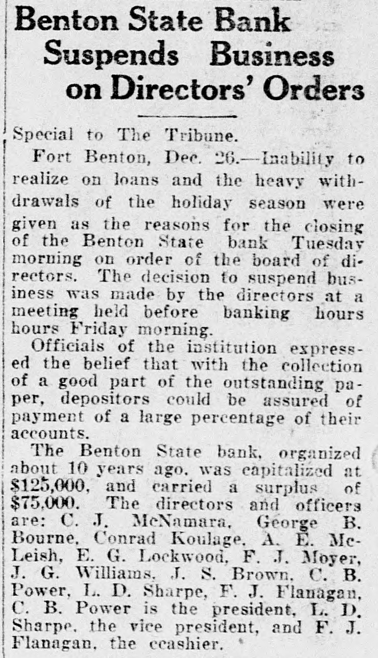 Benton State Bank Suspends Business on Directors' Orders Special to The Tribune. Fort Benton, Dec. 26.-Inability to realize on loans and the heavy withdrawals of the holiday season were given as the reasons for the closing of the Benton State bank Tuesday morning on order of the board of directors. The decision to suspend business was made by the directors at a meeting held before banking hours hours Friday morning. Officials of the institution expressed the belief that with the collection of a good part of the outstanding paper, depositors could be assured of payment of a large percentage of their accounts. The Benton State bank, organized about 10 years ago. was capitalized at $125,000, and carried a surplus of $75,000. The directors and officers are: C. J. McNamara, George B. Bourne, Conrad Koulage, A. E. McLeish, E. G. Lockwood, F. J. Moyer, J. G. Williams, J. S. Brown, C. B. Power, L. D. Sharpe, F. J. Flanagan, C. B. Power is the president, L. D. Sharpe. the vice president, and F. J. Flanagan, the ceashier.