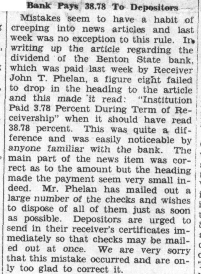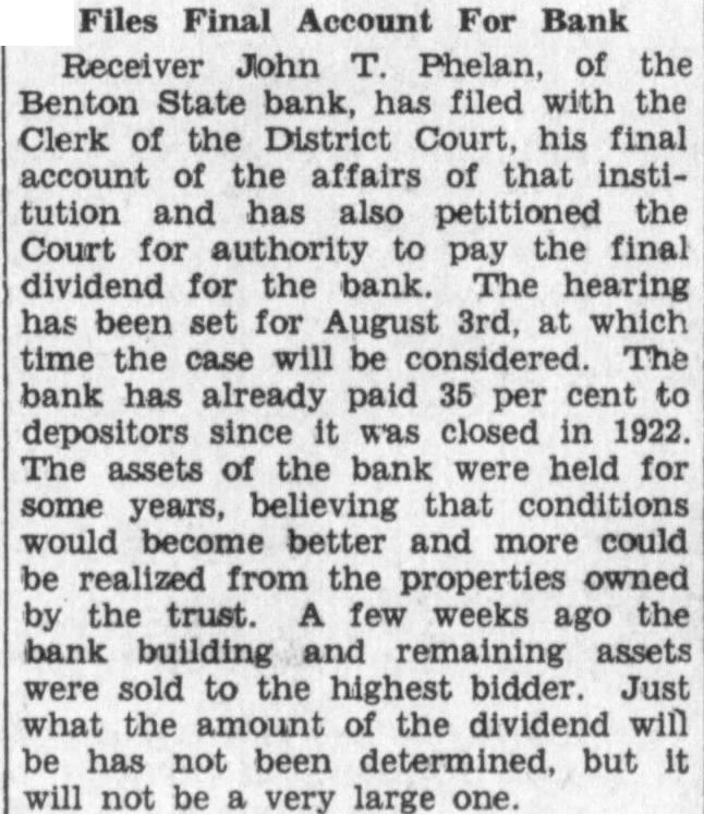 Chouteau county the largest gainer by the recent payment of final dividend to depositors the Benton State bank Receiver John Phelan. county treasurer, received check for as the county's share in the dividend. This county had on deposit approximately the the the bank 1922. Some time bank the closed the county was forced to the pay state, and school district in full for their share the money kept in the bank deposit and this county showed of in the might be interest our readers know just how that vided into the various funds belonging the county. The general fund ceived total of the poor fund the bridge fund the bond sinking and interest fund ceived largest of the this amounting to the library fund received $133.94; the road fund $875.55 and the gopher fund the amount. will now be possible for Chouteau county to charge off the balance this account and get their books straightened out. The money right this time will come in pretty handy several of the funds to which