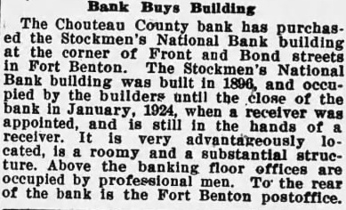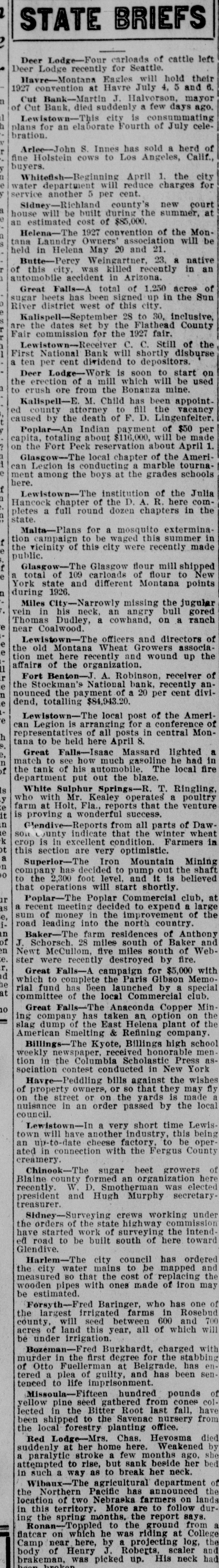 STATE BRIEFS Deer Lodge-Four carloads of cattle left Deer Lodge recently for Seattle. Havre-Montana Eagles will hold their 1927 convention at Havre July 4, 5 and 6. n Cut Bank-Martin J. Halvorson, mayor of Cut Bank, died suddenly a few days ago. Lewistown-This city is consummating plans for an elaborate Fourth of July celebration. Arlee-John S. Innes has sold a herd of fine Holstein cows to Los Angeles, Calif., buyers. Whitefish-Beginning April 1. the city water department will reduce charges for service another 5 per cent. Sidney-Richland county's new court house will be built during the summer, at an estimated cost of $85,000. Helena-The 1927 convention of the Montana Laundry Owners' association will be held in Helena May 20 and 21. Butte-Percy Weingartner, 23, a native of this city, was killed recently in an automobile accident in Arizona. Great Falls-A total of 1,250 acres of sugar beets has been signed up in the Sun River district west of this city. Kallspell-September 28 to 30, inclusive, are the dates set by the Flathead County Fair commission for the 1927 fair. Lewistown--Recelver C. C. Still of the First National Bank will shortly disburse a ten per cent dividend to depositors. Deer Lodge-Work is soon to start on the erection of a mill which will be used to crush ore from the Bonanza mine. Kalispell-E. M. Child has been appointed county attorney to fill the vacancy caused by the death of F. D. Lingenfelter. Poplar-An Indian payment of $50 per capita, totaling about $116,000, will be made on the Fort Peck reservation about April 1. Glasgow-The local chapter of the American Legion is conducting a marble tournament among the boys at the grades schools here. Lewistown-The institution of the Julia Hancock chapter of the D. A. R. here completes a full round dozen chapters in the state. Malta-Plans for a mosquito extermination campaign to be waged this summer in the vicinity of this city were recently made public. Glasgow-The Glasgow flour mill shipped a total of 109 carloads of flour to New York state and different Montana points n during 1926. Miles City-Narrowly missing the jugular vein in his neck, an angry bull gored Thomas Dudley, a cowhand, on a ranch e near Coalwood. Lewistown-The officers and directors of the old Montana Wheat Growers association met here recently and wound up the affairs of the organization. r Fort Benton-J. A. Robinson, receiver of the Stockman's National bank, recently announced the payment of a 20 per cent dividend, totalling $84,943.20. Lewistown-The local post of the Amerie can Legion is arranging for a conference of representatives of all posts in central Monh tana to be held here April 8. a Great Falls-Isaac Massard lighted match to see how much gasoline he had in the tank of his automobile. The local fire department put out the blaze. White Sulphur Springs-R. T. Ringling, y who with Mr. Kealey operates a poultry farm at Holt, Fla., reports that the venture is proving a wonderful success. n Glendive-Reports from all parts of DawSON County indicate that the winter wheat crop is in excellent condition. Farmers in this section are very optimistic. a Superior-The Iron Mountain Mining company has decided to pump out the shaft to the 2,300 foot level, and it is believed that operations will start shortly. ir Poplar-The Poplar Commercial club, at IS a recent meeting decided to expend a large e, sum of money in the improvement of the road leading into the north country. n Baker-The farm residences of Anthony J. Schorsch. 28 miles south of Baker and n Newt McCullom, five miles south of Webe. ster were recently destroyed by fire. Great Falls-A campaign for $5,000 with d which to complete the Paris Gibson Memo1e rial fund has been launched by a special at committee of the local Commercial club. 10 Great Falls-The Anaconda Copper Mining company has taken an option on the slag dump of the East Helena plant of the American Smelting & Refining company. Billings-The Kyote, Billings high school weekly newspaper, received honorable mention in the Columbia Scholastic Press association contest conducted in New York Havre-Peddling bills against the wishes of property owners, or so that they may fly on the street or on the yards is made a nuisance in an order passed by the local council. Lewistown-In a very short time Lewistown will have another industry, this being an up-to-date cheese factory, to be operated in connection with the Fergus County creamery. Chinook-The sugar beet growers of Blaine county formed an organization here recently. W. D. Smotherman was elected president and Hugh Murphy secretarytreasurer. Sidney-Surveying crews working under the orders of the state highway commission have started work of surveying the intended road to be built south of here toward Glendive. Harlem-The city council has ordered