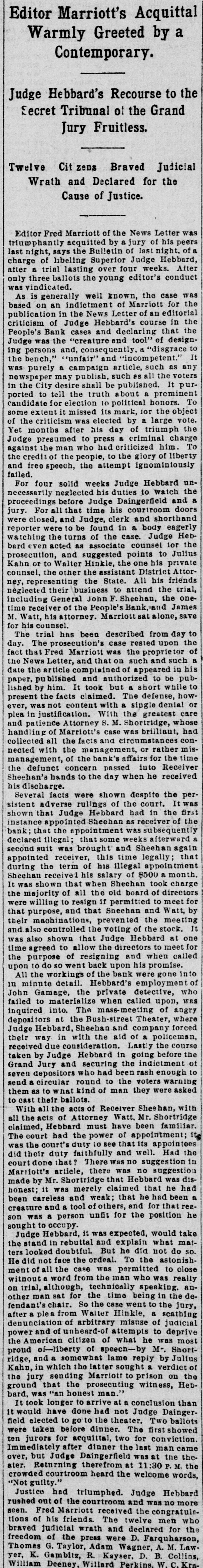 Warmly Greeted Editor Marriott's Acquittal by Contemporary. to the Judge Recourse Hebbard's of the secret Grand Tribunal Jury Fruitless. Cit zens Braved Twelve Judicial for the and Wrath Declared Cause of Justice. of Fred Editor Marriott triumphanily last the night. night, of Hebbard, charge libeling After trial lasting after the ballots only three editor's young conduct was vindicated. is case the As well generally for of on an based of in an the News Letter the in course Hebbard's the that Bank People's was the Judge and, ing criticism publicati of Judge cases and declaring of design persons It the bench,' "unfair" as was such article, purely the may such # newspi publish It in purthe shall City desire published the truth about promi ported To for honors. election political candidate the for mark, missed some a of the by vote. large of the Yet triumph to charge Judge criminal presumed TO him had man criticized against of the the the libert glory people, and the free speech, ignominiously failed. unFor solid four weeks Judge Hebbard the to watch duties cessarily neglected and before Judge Daingerfeld time doors and were closed, be to eagerly of case the turns watching jury. proceedings For and that Judge, found clerk in body Judge Heb the ior as acted counsel associate to Julius and points suggested prosecution, his or Kahn private Walter the the Attorother District counsel, the his All State. friends ney, the trial, their attend business neglected the oneJohn Sheehan, General including the of James time People's Bank,and M. his alone, Watt, attorney. Marriotti for his to day has The trial from been the The upon day. rosecution's of fact Marriott and the such and News Letter, in his date article appeared be to and pub paper. blished to It but while took him. short The the howdefense, present or not denial ever, content in the With plea justifi lished by facts claimed. single greatest M. and ortridge, Attorney patience was had of case brilliant, Marriott's handling all the collected or the with rather nected for the of the time the into passed concern defunct to day Sheehan's his discharge. the perwere Several shown despite of the court sistent rulings in had the first Judge Hebbard of the receiver was subsequent illegal; declared was and second st brought Sheehan that time receiver. legally; appointed of his the term illegal during of his salary $500 month. Sheehan It took was charge when shown Sheehan old of of the the board majority if meet were resign willing and and that Sneehan the their of the also and stock. was that shown Hebbard the meet allow directors agreed and when resigning his promise. in detail the time purpose to went of of back upon bank were employme gone who private upon the workings Hebbard's detective, was to failed upon, The into. inquired the Theater, John in minute Gamaterialize the when called of angry where Bush-street forced Judge company in with their way due depositors Hebbard, Sheehan the aid Lastly of the received consideration. in by going taken before Judge Hebbard the and Jury Grand securing indictment who rash been enough seven depositors the send voters warning round circular of were they kind man them a to their ballots of acts With of Mr. all Watt, the Attorney been have familiar Hebbard claimed, of the The had power court appointment; the was duty court's the and well Had did duty their no done There that? no there article, Marriott's was Mr. made Hebbard Shortridge he had that was claimed merely he had been that weak; for that creature he son was person to occupy sought honest; been careless and tool unfit fothers, for and the position it would expected, Hebbard, and what explain do not so. ters looked He did ordeal. was case the ment permitted the Judge stand in doubtful rebuttal But he To did the to close word from really without anon speaking. although, technically in the detime the being for the So the went 's chair. jury, from plea Walter Hinkle, scathing of of misuse judicial arbitrary of to attempts deprive of the he was what most citizen of by M-. Shortspeechproud by and lame reply Julius ridge, somewhat a the Kahn, verdict which on to the jury sending Marriott prison the Hebwitness, prosecuting than ground the that "an honest to arrive conclusion it would Judge Dainger to field elected The taken were before dinner. bard, It took have longer done had theater. not Two ballots howed for ten for jurors acquittal, the after man but the theover, Judge M. ater. the 11:30 therefrom Returning aed crow heard words, welcome courtroom "Not guilty." Judge Hebbard triumphed. and no was more tions twelve Justice out had of the courtroom received the congratuis. men the wrath judicial D. were M. seen. rushed of Fred his Marriott friends. The and declared Farq for arson, Law ver, freedom G. Taylor, R Kayser. D. W. c. Kra braved of the press Adam Wagner, B. A. Collins, Thomas K. Gambitz, Willard Perkins, Deeney