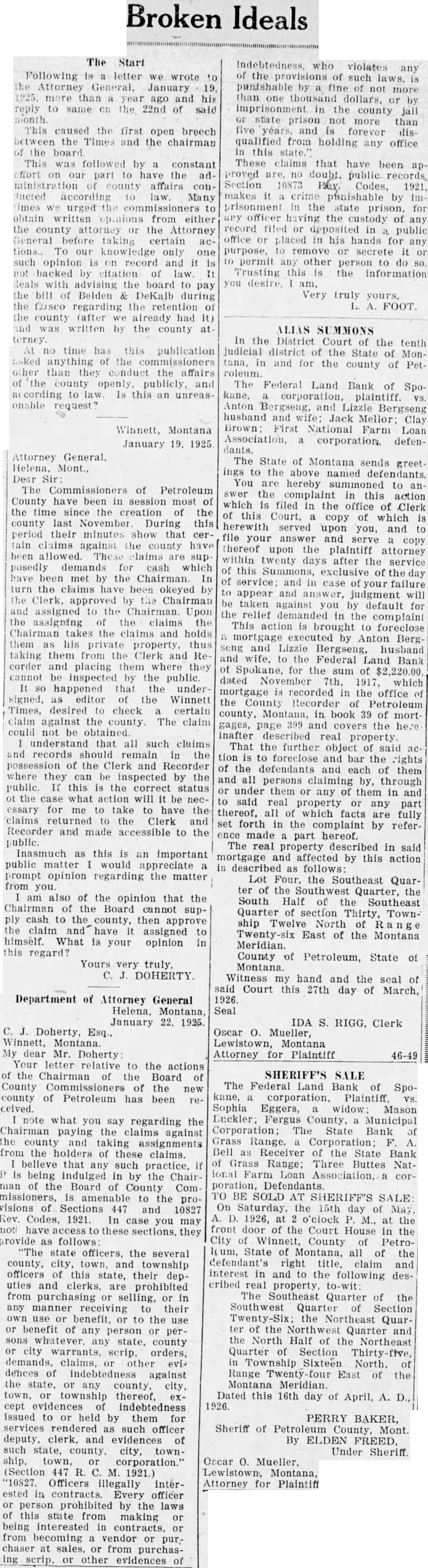 In the District Court of the Tenth Judi cial District of the State of Montana, in and for the County of M. Ellis: Viola M Ellis his Doer Ing Mercantile Company Hawkins. and Arrow Creek Develop ment Company corporation. defendants. Alias State of Montana sends greeting The the defendants You are hereby summoned the complaint in this action is filed in the office of the Clerk this Court copy of which is upon and and to file your you. copy thereof upon the plaintiff's after ney within twenty days after the of this Summons exclusive of the day service and in case of your failure to appear and answer judgment will be tn against you by default for the relief demanded in the complaint The purpose of this action is to fore close certain mortgage dated May 31st M made and Ellis and Viola M Ellis his to AT Blodgett. Jr. the plaintiff herein. and which mortgage was recorded in the of fice of the County Clerk and Recorder of Fergus County Montana June 3rd 1918. in Book 07 of at page 218: and which mortgage secures bal ance of and interest thereon. and the costs of suit an fee to be fixed and determined by the Plaintiff further seeks to have said mortgage enforced and moon the described land in Fergus Montana. Lots three (3) and four (1) and the southeast quarter of the southwest quar ter (SEM of eighteen and lots three (3) and four (4). the east and the northeast quarter of the southwest quarter of section 18) north. nineteen of eighteen (19). range sixteen township east. of the M. in M containing acres. more or less. cording to the Government Reference hereby made to the com plaint file herein for further partieu lars of the nature of the within seal suit. of said and the hand my Court. this 5th day of March 1925. BERT Clerk (Court Seal) Deputy B. HEDGE By FRED torney for plaintiff.