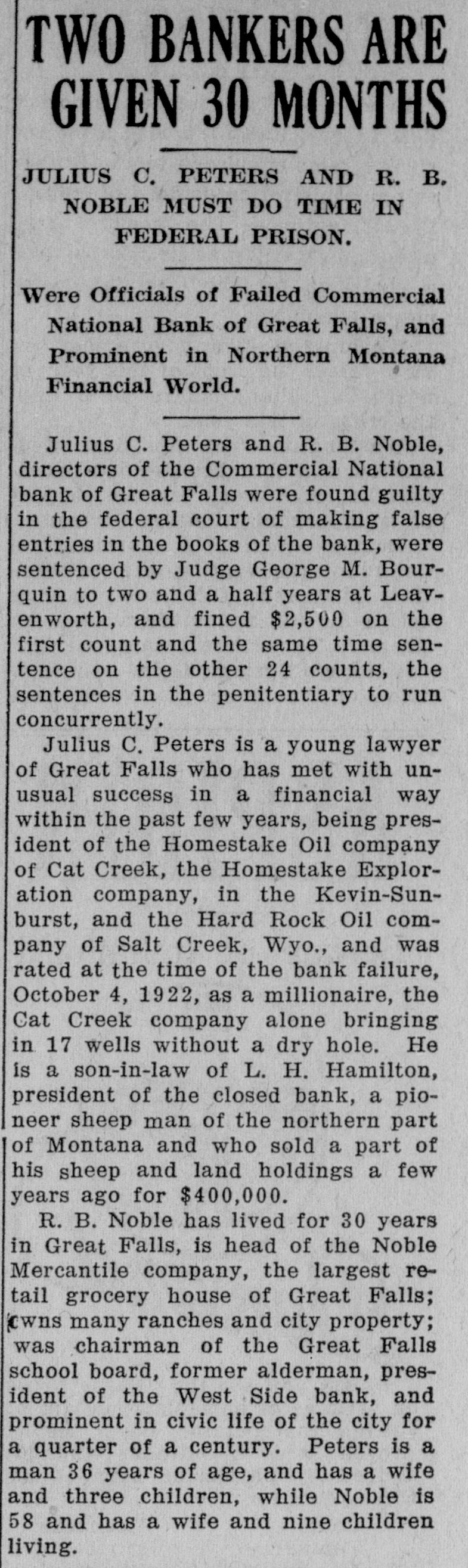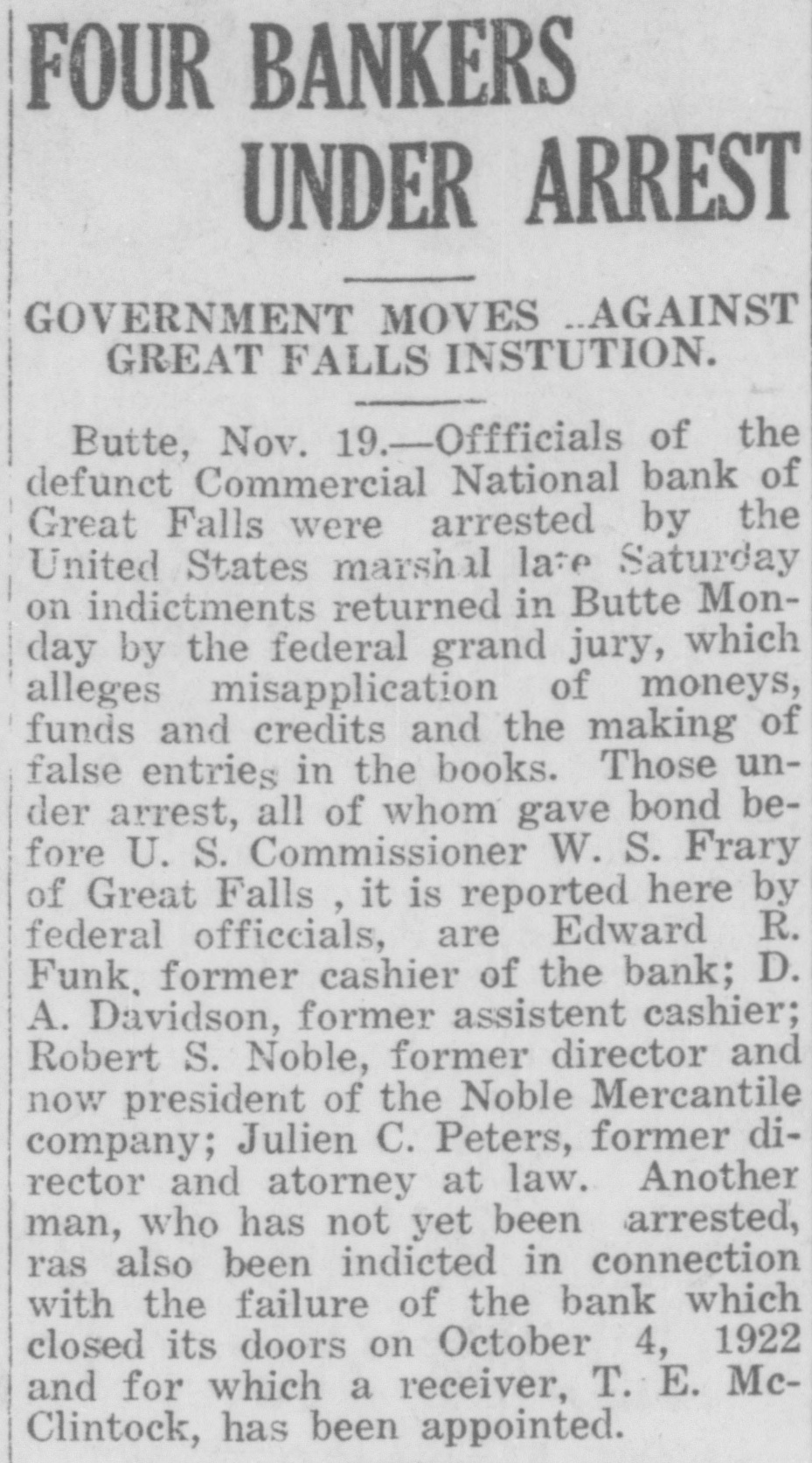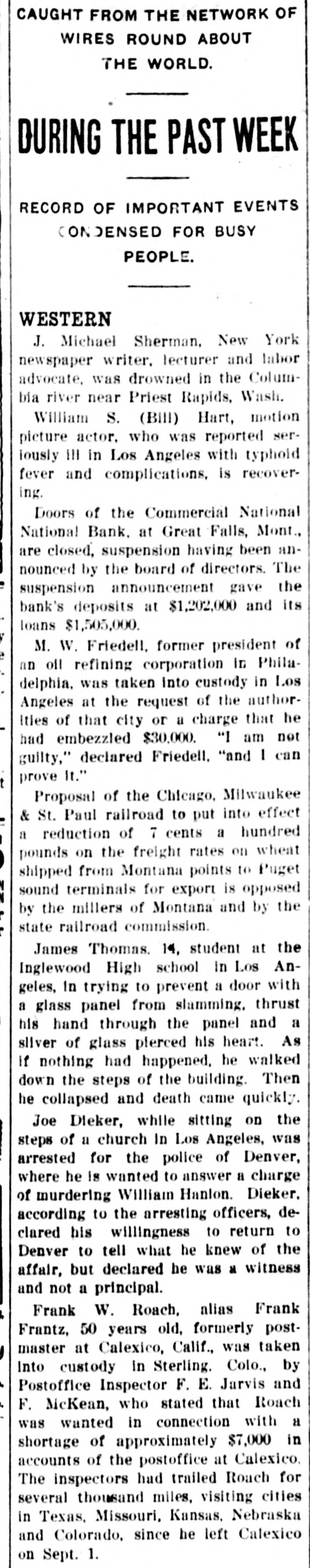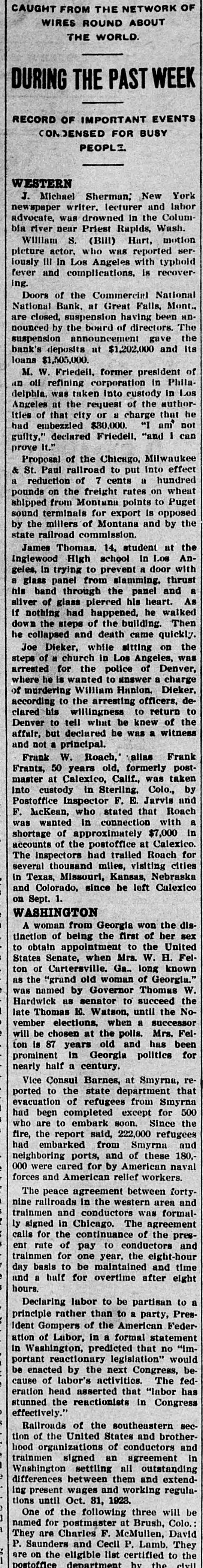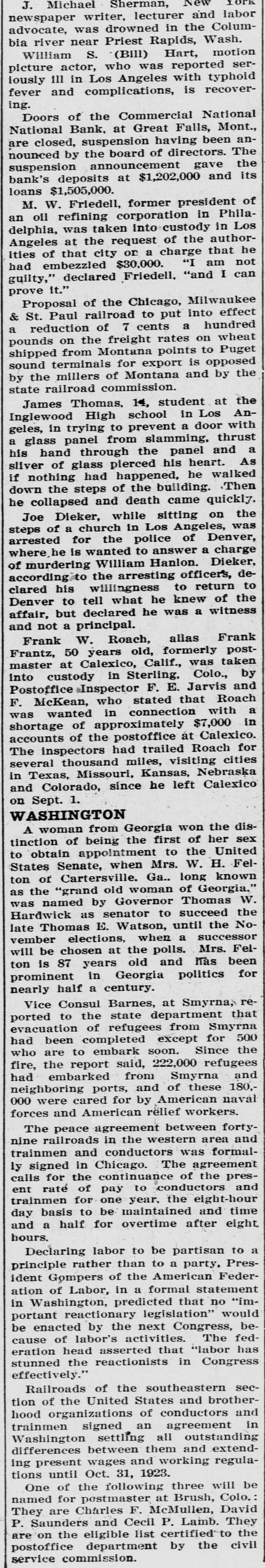 J. Michael Sherman, New YORK newspaper writer, lecturer and labor advocate, was drowned in the Columbia river near Priest Rapids, Wash. William S. (Bill) Hart, motion picture actor, who was reported seriously ill in Los Angeles with typhoid fever and complications, is recovering. Doors of the Commercial National National Bank, at Great Falls, Mont., are closed, suspension having been announced by the board of directors. The suspension announcement gave the bank's deposits at $1,202,000 and its loans $1,505,000. M. W. Friedell, former president of an oil refining corporation in Philadelphia, was taken into custody in Los Angeles at the request of the authorities of that city or a charge that he had embezzled $30,000. "I am not guilty," declared Friedell, "and I can prove it." Proposal of the Chicago, Milwaukee & St. Paul railroad to put into effect a reduction of 7 cents a hundred pounds on the freight rates on wheat shipped from Montana points to Puget sound terminals for export is opposed by the millers of Montana and by the state railroad commission. James Thomas, 14, student at the Inglewood High school in Los Angeles, in trying to prevent a door with a glass panel from slamming, thrust his hand through the panel and a sliver of glass pierced his heart. As if nothing had happened, he walked down the steps of the building. Then he collapsed and death came quickly. Joe Dieker, while sitting on the steps of a church in Los Angeles, was arrested for the police of Denver, where.he is wanted to answer a charge of murdering William Hanlon. Dieker, according to the arresting officers, declared his willingness to return to Denver to tell what he knew of the affair, but declared he was a witness and not a principal. Frank W. Roach, allas Frank Frantz, 50 years old, formerly postmaster at Calexico, Calif., was taken into custody in Sterling, Colo., by Postoffice Inspector F. E. Jarvis and F. McKean, who stated that Roach was wanted in connection with a shortage of approximately $7,000 in accounts of the postoffice at Calexico. The inspectors had trailed Roach for several thousand miles, visiting cities in Texas, Missouri, Kansas, Nebraska and Colorado, since he left Calexico on Sept. 1. WASHINGTON A woman from Georgia won the distinction of being the first of her sex to obtain appointment to the United States Senate, when Mrs. W. H. Felton of Cartersville. Ga.. long known as the "grand old woman of Georgia." was named by Governor Thomas W. Hardwick as senator to succeed the late Thomas E. Watson, until the November elections, when a successor will be chosen at the polls. Mrs. Felton is 87 years old and has been prominent in Georgia politics for nearly half a century. Vice Consul Barnes, at Smyrna, reported to the state department that evacuation of refugees from Smyrna had been completed except for 500 who are to embark soon. Since the fire, the report said, 222,000 refugees had embarked from Smyrna and neighboring ports, and of these 180,000 were cared for by American naval forces and American relief workers. The peace agreement between fortynine railroads in the western area and trainmen and conductors was formally signed in Chicago. The agreement calls for the continuance of the present rate of pay to conductors and trainmen for one year. the eight-hour day basis to be maintained and time and a half for overtime after eight hours. Declaring labor to be partisan to a principle rather than to a party. President Gompers of the American Federation of Labor, in a formal statement in Washington, predicted that no "important reactionary legislation" would be enacted by the next Congress, because of labor's activities. The federation head asserted that "labor has stunned the reactionists in Congress effectively.' Railroads of the southeastern section of the United States and brotherhood organizations of conductors and trainmen signed an agreement in Washington settling all outstanding differences between them and extending present wages and working regulations until Oct. 31, 1923. One of the following three will be named for postmaster at Brush, Colo. They are Charles F. McMullen, David P. Saunders and Cecil P. Lamb. They are on the eligible list certified to the postoffice department by the civil service commission.
