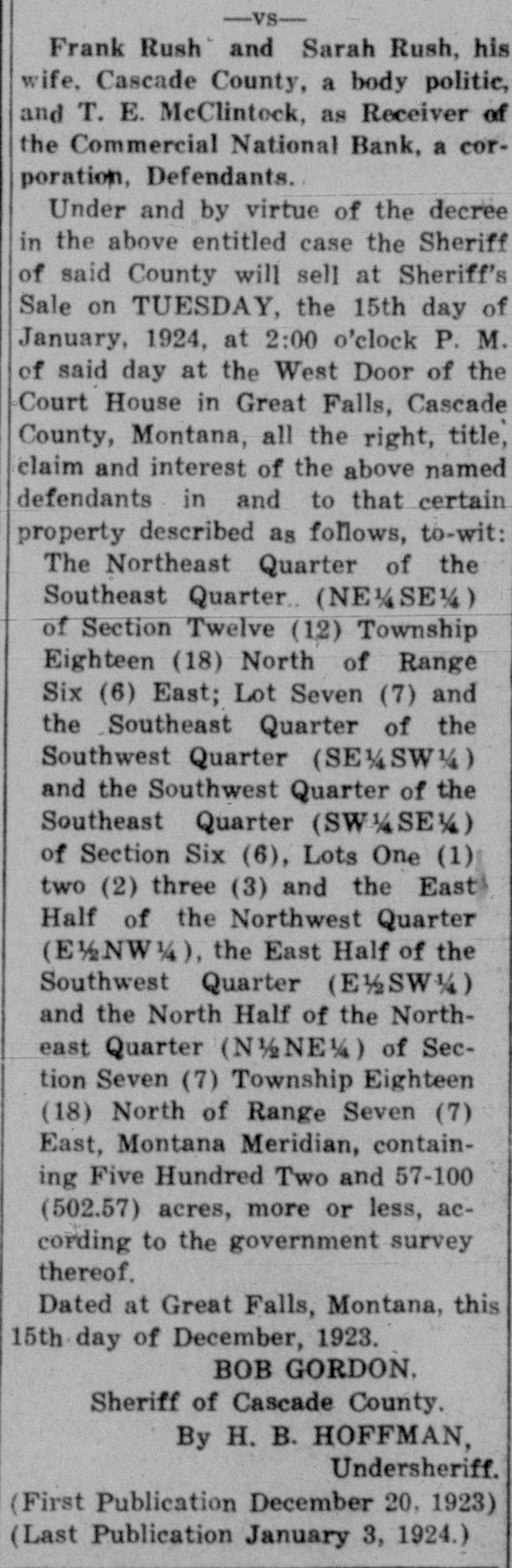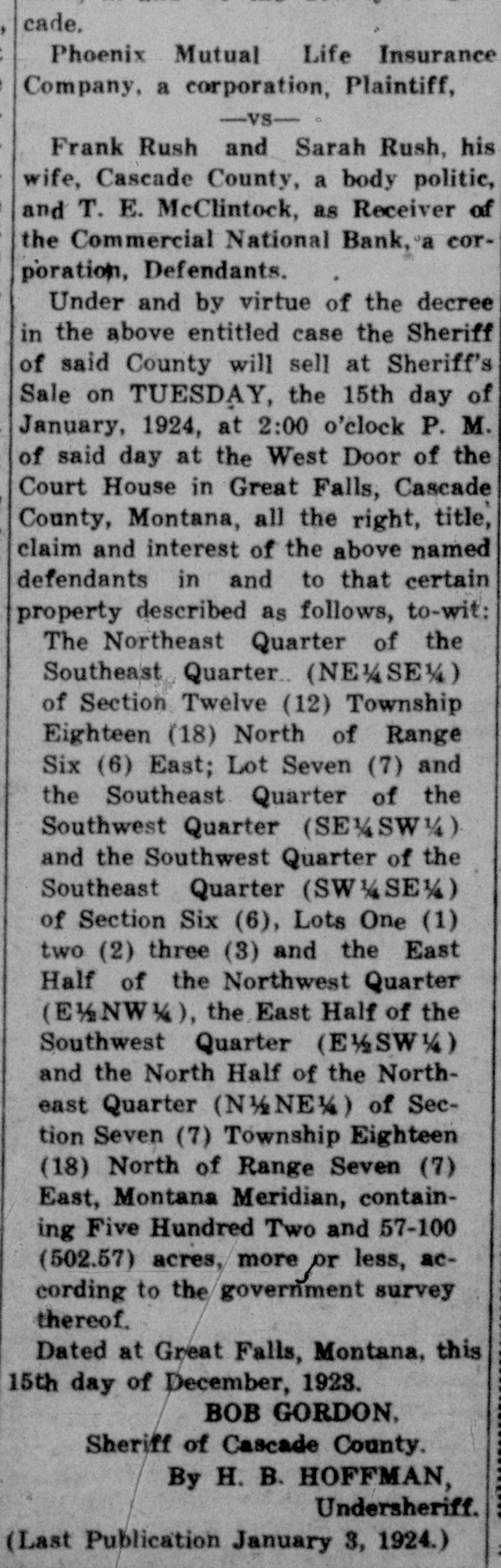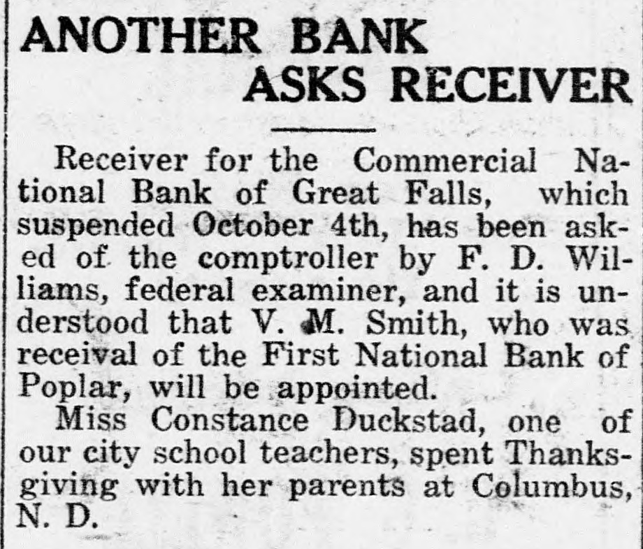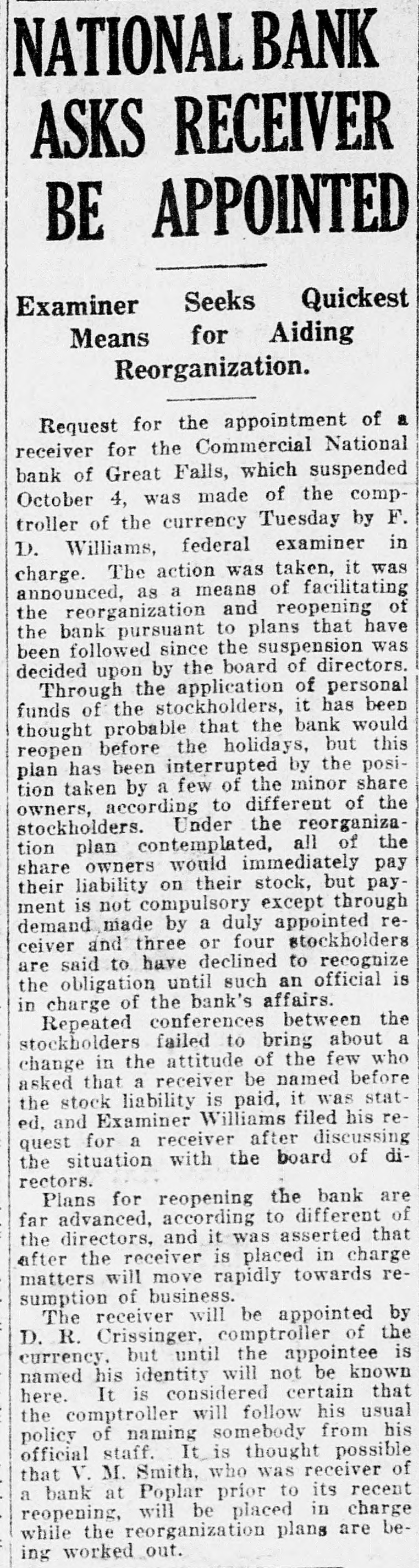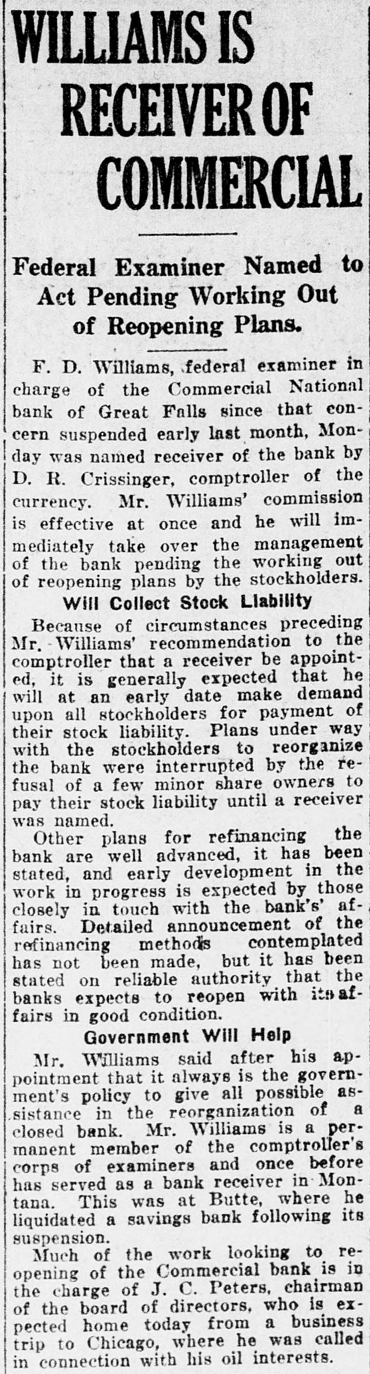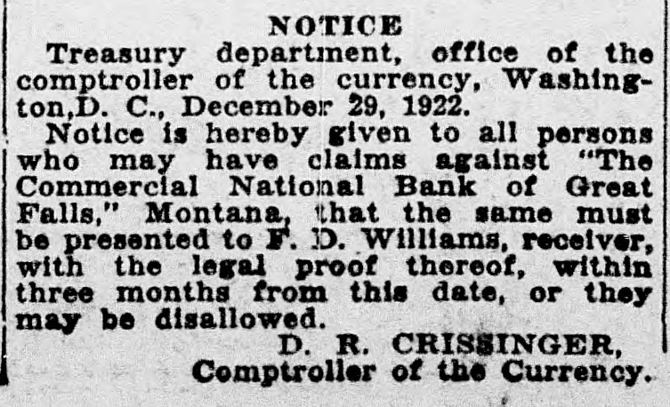J. Michael Sherman, New YORK newspaper writer, lecturer and labor advocate, was drowned in the Columbia river near Priest Rapids, Wash. William S. (Bill) Hart, motion picture actor, who was reported seriously ill in Los Angeles with typhoid fever and complications, is recovering. Doors of the Commercial National National Bank, at Great Falls, Mont., are closed, suspension having been announced by the board of directors. The suspension announcement gave the bank's deposits at $1,202,000 and its loans $1,505,000. M. W. Friedell, former president of an oil refining corporation in Philadelphia, was taken into custody in Los Angeles at the request of the authorities of that city or a charge that he had embezzled $30,000. "I am not guilty," declared Friedell, "and I can prove it." Proposal of the Chicago, Milwaukee & St. Paul railroad to put into effect a reduction of 7 cents a hundred pounds on the freight rates on wheat shipped from Montana points to Puget sound terminals for export is opposed by the millers of Montana and by the state railroad commission. James Thomas, 14, student at the Inglewood High school in Los Angeles, in trying to prevent a door with a glass panel from slamming, thrust his hand through the panel and a sliver of glass pierced his heart. As if nothing had happened, he walked down the steps of the building. Then he collapsed and death came quickly. Joe Dieker, while sitting on the steps of a church in Los Angeles, was arrested for the police of Denver, where.he is wanted to answer a charge of murdering William Hanlon. Dieker, according to the arresting officers, declared his willingness to return to Denver to tell what he knew of the affair, but declared he was a witness and not a principal. Frank W. Roach, allas Frank Frantz, 50 years old, formerly postmaster at Calexico, Calif., was taken into custody in Sterling, Colo., by Postoffice Inspector F. E. Jarvis and F. McKean, who stated that Roach was wanted in connection with a shortage of approximately $7,000 in accounts of the postoffice at Calexico. The inspectors had trailed Roach for several thousand miles, visiting cities in Texas, Missouri, Kansas, Nebraska and Colorado, since he left Calexico on Sept. 1. WASHINGTON A woman from Georgia won the distinction of being the first of her sex to obtain appointment to the United States Senate, when Mrs. W. H. Felton of Cartersville. Ga.. long known as the "grand old woman of Georgia." was named by Governor Thomas W. Hardwick as senator to succeed the late Thomas E. Watson, until the November elections, when a successor will be chosen at the polls. Mrs. Felton is 87 years old and has been prominent in Georgia politics for nearly half a century. Vice Consul Barnes, at Smyrna, reported to the state department that evacuation of refugees from Smyrna had been completed except for 500 who are to embark soon. Since the fire, the report said, 222,000 refugees had embarked from Smyrna and neighboring ports, and of these 180,000 were cared for by American naval forces and American relief workers. The peace agreement between fortynine railroads in the western area and trainmen and conductors was formally signed in Chicago. The agreement calls for the continuance of the present rate of pay to conductors and trainmen for one year. the eight-hour day basis to be maintained and time and a half for overtime after eight hours. Declaring labor to be partisan to a principle rather than to a party. President Gompers of the American Federation of Labor, in a formal statement in Washington, predicted that no "important reactionary legislation" would be enacted by the next Congress, because of labor's activities. The federation head asserted that "labor has stunned the reactionists in Congress effectively.' Railroads of the southeastern section of the United States and brotherhood organizations of conductors and trainmen signed an agreement in Washington settling all outstanding differences between them and extending present wages and working regulations until Oct. 31, 1923. One of the following three will be named for postmaster at Brush, Colo. They are Charles F. McMullen, David P. Saunders and Cecil P. Lamb. They are on the eligible list certified to the postoffice department by the civil service commission.