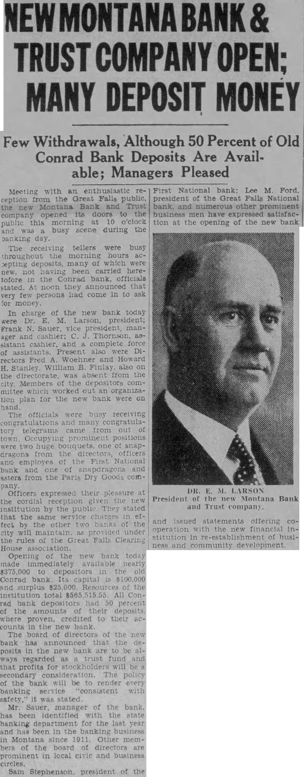 MONTANA BANK & TRUST COMPANY OPEN; MANY DEPOSIT MONEY Few Withdrawals, Although 50 Percent of Old Conrad Bank Deposits Are Available; Managers Pleased Meeting with an enthusiastic reception from the Great Falls public, the Montana Bank and Trust company opened the this o'clock public busy scene during the day The tellers were busy the hours bepting many of which were new. having been carried heretofore the Conrad bank, officials stated. noon they that very few persons had come in to ask for money. In charge of the new bank today Dr. M. Larson, president; Frank Sauer, vice manager and Thornson, sistant cashier, and complete of assistants. Present also were Directors Fred Woehner and Stanley. William B. Finlay. also the directorate was absent from the Members the mittee out an tion plan for the new were on hand. The officials were busy receiving congratulatory telegrams came from town Occupying positions two huge bouquets. one of snapdragons from the officers and employes of the First National bank and one snapdragons and asters from the Paris Dry Goods comOfficers expressed their pleasure the cordial by the stated that the charges fect by the other two banks of the city will under the rules the Great Falls Clearing House Opening of the new bank today made immediately available nearly $375,000 to depositors the Conrad capital and surplus of the total All Conrad bank depositors had percent the where proven. credited to their counts the bank The board of directors of the new bank has announced that the posits the new bank are be regarded fund that profits for stockholders will secondary The policy the bank will be to render every banking service "consistent with safety, was stated. Mr. Sauer, manager of the bank, has been identified with the state banking department for the last year and in the banking business Montana since Other memof the board are prominent in local civic and business circles. Sam Stephenson. president of the First National bank: Lee M. Ford. president of the Great Falls National bank, and other prominent have satisfaction at the opening of the new bank and issued statements offering the financial stitution in of ness community development.