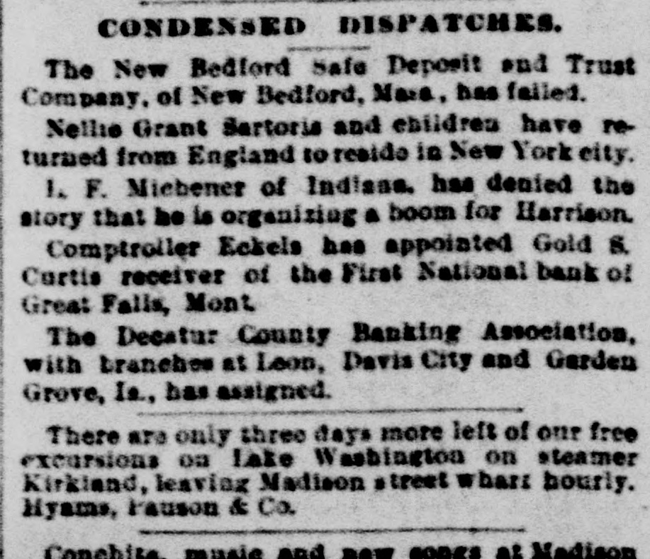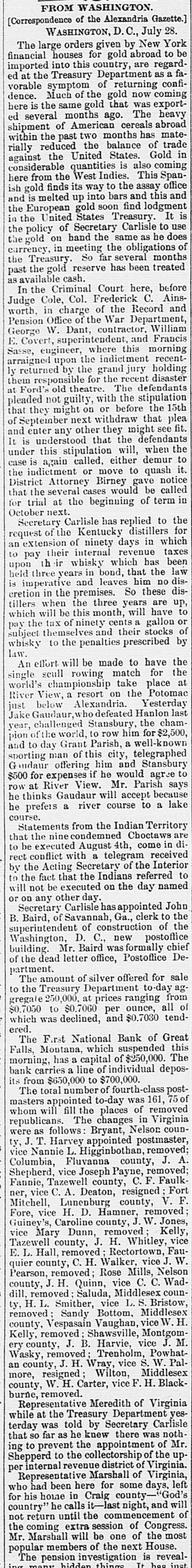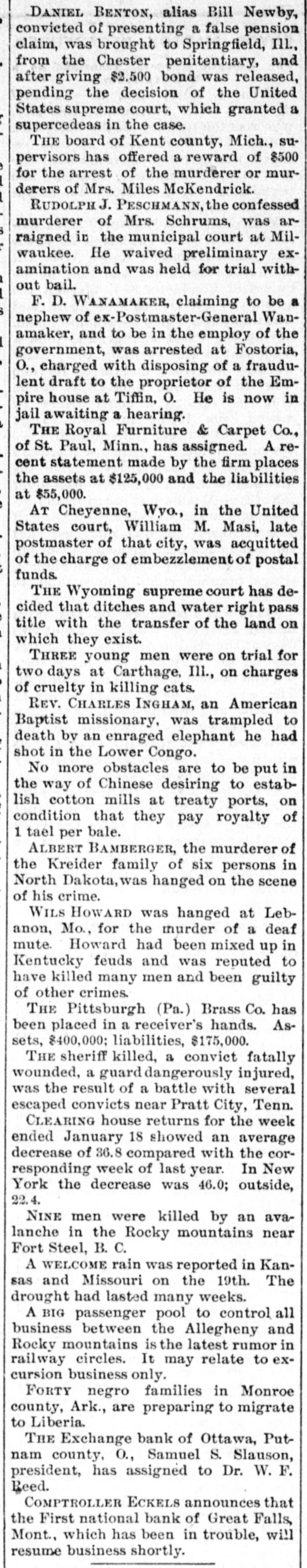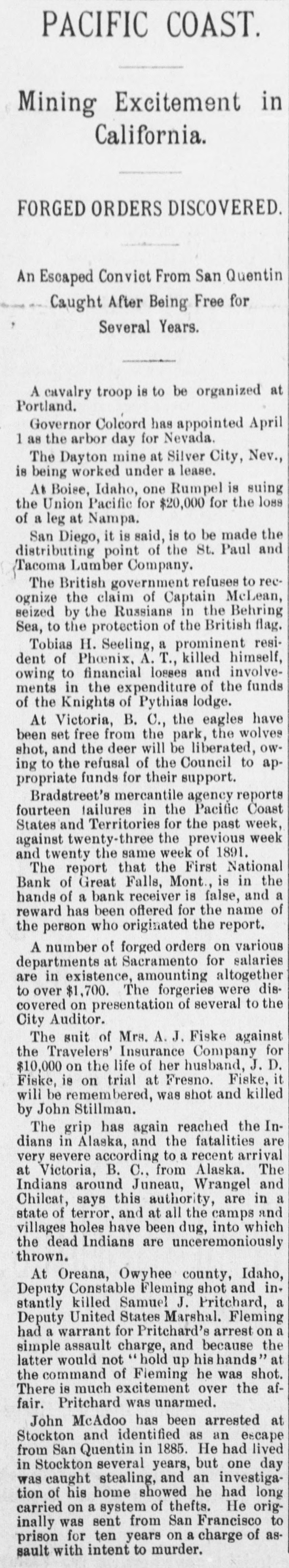 PACIFIC COAST. Mining Excitement in California. FORGED ORDERS DISCOVERED. An Escaped Convict From San Quentin Caught After Being Free for Several Years. A cavalry troop is to be organized at Portland. Governor Colcord has appointed April 1 as the arbor day for Nevada. The Dayton mine at Silver City, Nev., is being worked under a lease. At Boise, Idaho, one Rumpel is suing the Union Pacific for $20,000 for the loss of a leg at Nampa. San Diego, it is said, is to be made the distributing point of the St. Paul and Tacoma Lumber Company. The British government refuses to recognize the claim of Captain McLean, seized by the Russians in the Behring to the of Sea, protection the British flag. Tobias H. Seeling, a prominent resident of A. Phoenix, T., killed himself, to financial losses and involvein the funds owing ments expenditure of the of the Knights of Pythias lodge. At Victoria, B. C., the eagles have been set free from the park, the wolves and the deer will be owto the refusal of the apshot, ing Council liberated, to propriate funds for their support. Bradstreet's mercantile agency reports fourteen failures in the Pacific Coast States and Territories for the past week, week against twenty-three the week previous of 1891. and twenty the same The report that the First National Bank of Great Falls, Mont., is in the receiver a reward been name of the who of on hands A person number of has a bank forged originated offered orders for is the the false, report. various and departments at Sacramento for salaries are in existence, amounting altogether to $1,700. The forgeries were discovered on of the over presentation several to City Auditor. The suit of Mrs. A. J. Fiske against Travelers' Insurance Company for on the life of her $10,000 the husband, Fiske, J.D. Fiske, is on trial at Fresno. it will be was shot remembered, and killed by John Stillman. The grip has again reached the Indians in Alaska, and the fatalities are severe to a very according recent arrival at Victoria, B. C., from Alaska. The Indians around Juneau, Wrangel and Chilcat, says this authority, are in a state of terror, and at all the camps and villages holes have been dug, into which the dead Indians are unceremoniously thrown. At Oreana, Owyhee county, Idaho, Deputy Constable Fleming shot and instantly killed Samuel J. Pritchard, a Deputy United States Marshal. Fleming had a warrant for Pritchard's arrest on a charge, simple assault "hold and his hands" because the latter would not up at the command of Fieming he was shot. There is much excitement over the affair. Pritchard was unarmed. John McAdoo has been arrested at Stockton and identified as an escape from San Quentin in 1885. He had lived one day an in was Stockton caught several stealing, years, and but investigahome showed he had long carried on a tion of his system of thefts. He originally was sent from San Francisco to for ten on a asprison years charge of sault with intent to murder.