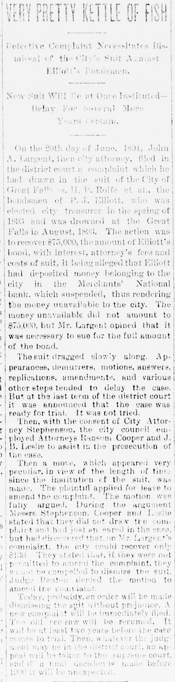 VERY PRETTY KETTLE OF FISH Defective Complaint Necessitates Disunissal of the City's Snit Acainst Elliott's Bondsmen. New Suit Will Be at Once InstitutedDelay For Several More Years Certain On the 20th day of June, 1891, John A. Largent, then city attorney, filed in the district court a complaint which he had drawn in the suit of the City of Great Falls VS. II. P. Rolle et al., the bondsmen of P. J. Elliott. who was elected city treasurer in the spring of 1893 and was drowned at the Great Falls in August, 1893. The action was to recover $75,000, the amount of Elliott's bond, with interest, attorney's fees and costs of suit, it being alleged that Elliott had deposited money belonging to the city in the Merchants' National bank, which suspended, thus rendering the money unavailable to the city. The money unavailable did not amount to $75,000, but Mr. Largent opined that it was necessary to sue for the full amount of the bond. The suit dragged slowly along. Ap. pearances, demurrers, motions, answers, replications, amendments, and various other steps tended to delay the case. But at the last term of the district court it was announced that the case was ready for trial. It was not tried. Then, with the consent of City Attorney Stephenson. the city council em. ployed Attorneys Ransom Cooper and J. B. Leslie to assist in the prosecution of the case. Then a move. which appeared very peculiar. in view of the length of time since the institution of the suit, was made. The plaintifi applied for leave to amend the complaint. The motion was fully argued. During the argument Mesere. Stephenson. Cooper and Leslie stated that they did out draw the com3 plaint and had just an eared in the case. but had discovered that on Mr. Largent's complaint. the city could recover only 8130 They stated that. if they were not permitted to amend the complaint. they would be compelled to dismiss the suit. Judge Benton denied the motion to amend the complaint. Today. probably. an order will be made dismissing the syit without prejudice. A new complaint will be immediately filed. The old see-aaw will be resumed. It will be at least two years before the case comes to trial. Then. whatever the judg1 ment may be in the district court. as uppeal will be taken to the supreme court. I and if a final decision is made before 1900 it will be unexpected.