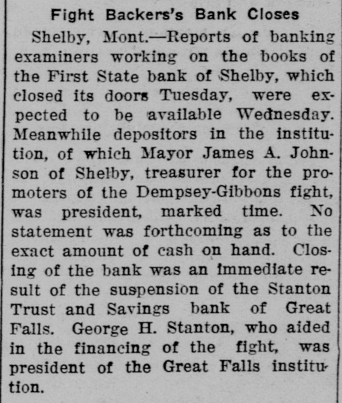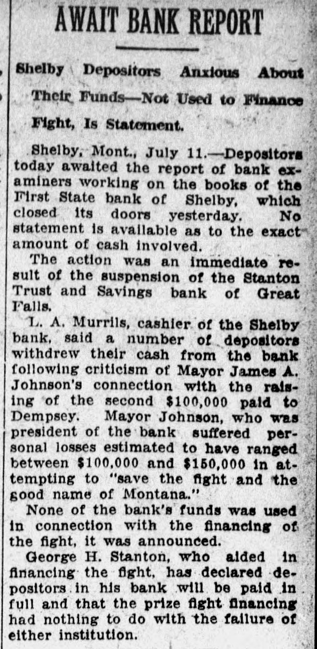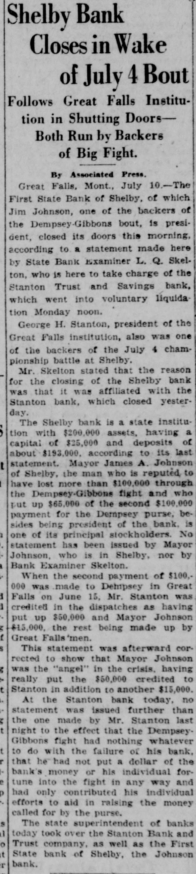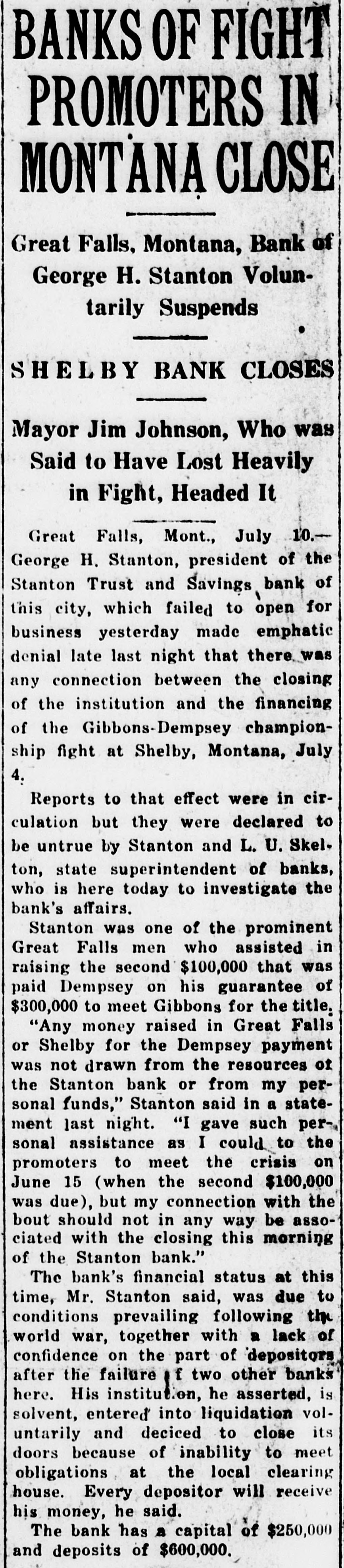BANKS OF FIGHT PROMOTERS IN MONTANA CLOSE Great Falls, Montana, Bank of George H. Stanton Voluntarily Suspends SHELBY BANK CLOSES Mayor Jim Johnson, Who was Said to Have Lost Heavily in Fight, Headed It Great Falls, Mont., July 10.George H. Stanton, president of the Stanton Trust and Savings bank of this city, which failed to open for business yesterday made emphatic denial late last night that there was any connection between the closing of the institution and the financing of the Gibbons-Dempsey championship fight at Shelby, Montana, July 4. Reports to that effect were in circulation but they were declared to be untrue by Stanton and L. U. Skel. ton, state superintendent of banks, who is here today to investigate the bank's affairs. Stanton was one of the prominent Great Falls men who assisted in raising the second $100,000 that was paid Dempsey on his guarantee of $300,000 to meet Gibbons for the title, "Any money raised in Great Falls or Shelby for the Dempsey payment was not drawn from the resources of the Stanton bank or from my personal funds," Stanton said in a statement last night. "I gave such personal assistance as I could to the promoters to meet the crisis on June 15 (when the second $100,000 was due), but my connection with the bout should not in any way be associated with the closing this morning of the Stanton bank." The bank's financial status at this time, Mr. Stanton said, was due to conditions prevailing following the world war, together with a lack of confidence on the part of depositors after the failure f two other banks here. His institution, he asserted, is solvent, entered into liquidation voluntarily and deciced to close its doors because of inability to meet obligations at the local clearing house. Every depositor will receive his money, he said. The bank has a capital of $250,000 and deposits of $600,000.