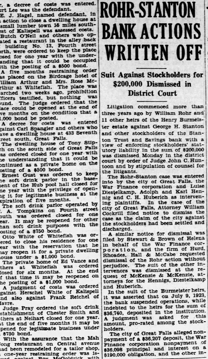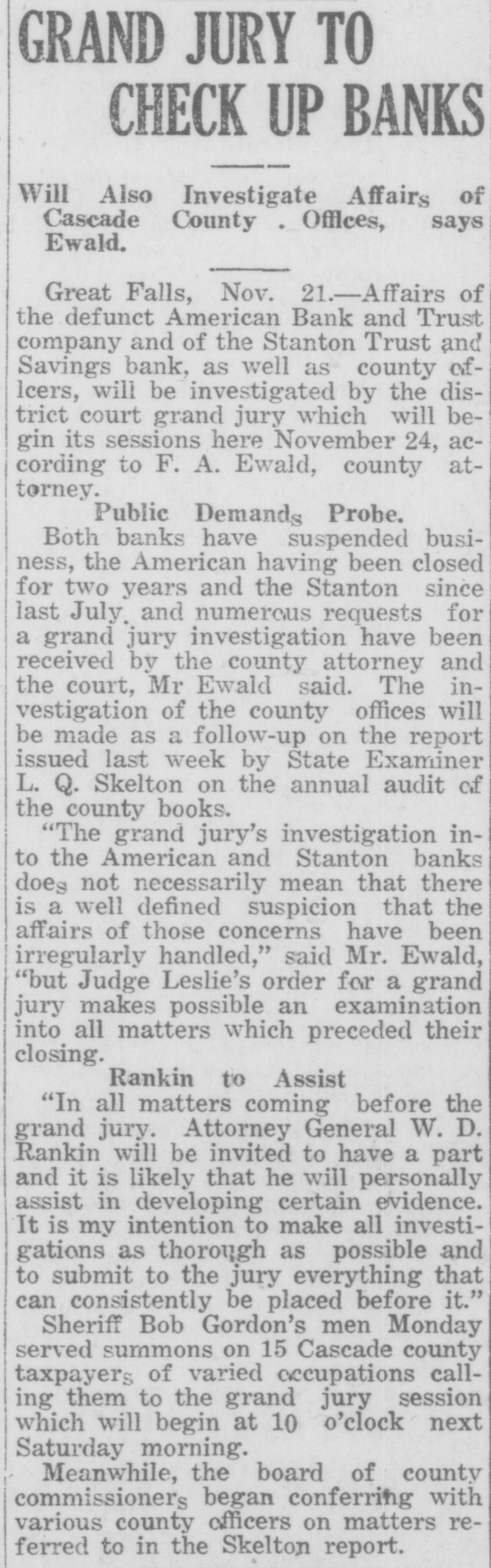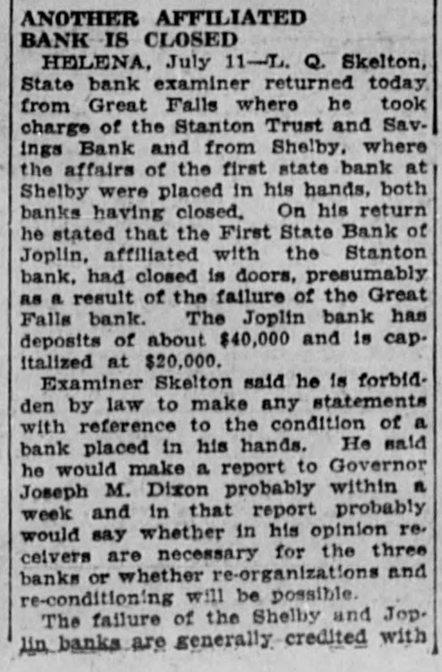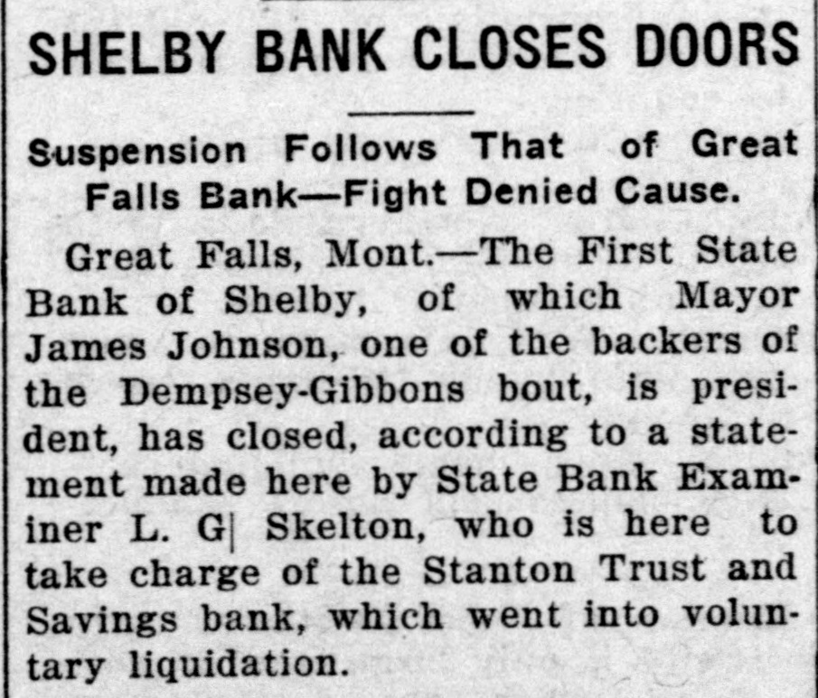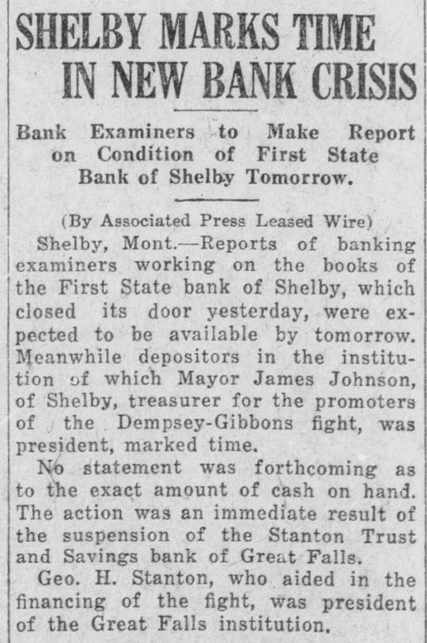 BANKS OF FIGHT PROMOTERS IN MONTANA CLOSE Great Falls, Montana, Bank of George H. Stanton Voluntarily Suspends SHELBY BANK CLOSES Mayor Jim Johnson, Who was Said to Have Lost Heavily in Fight, Headed It Great Falls, Mont., July 10.George H. Stanton, president of the Stanton Trust and Savings bank of this city, which failed to open for business yesterday made emphatic denial late last night that there was any connection between the closing of the institution and the financing of the Gibbons-Dempsey championship fight at Shelby, Montana, July 4. Reports to that effect were in circulation but they were declared to be untrue by Stanton and L. U. Skel. ton, state superintendent of banks, who is here today to investigate the bank's affairs. Stanton was one of the prominent Great Falls men who assisted in raising the second $100,000 that was paid Dempsey on his guarantee of $300,000 to meet Gibbons for the title, "Any money raised in Great Falls or Shelby for the Dempsey payment was not drawn from the resources of the Stanton bank or from my personal funds," Stanton said in a statement last night. "I gave such personal assistance as I could to the promoters to meet the crisis on June 15 (when the second $100,000 was due), but my connection with the bout should not in any way be associated with the closing this morning of the Stanton bank." The bank's financial status at this time, Mr. Stanton said, was due to conditions prevailing following the world war, together with a lack of confidence on the part of depositors after the failure f two other banks here. His institution, he asserted, is solvent, entered into liquidation voluntarily and deciced to close its doors because of inability to meet obligations at the local clearing house. Every depositor will receive his money, he said. The bank has a capital of $250,000 and deposits of $600,000.