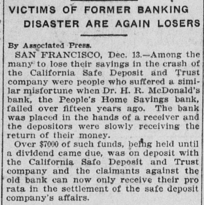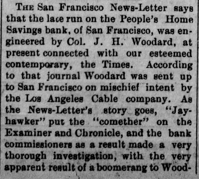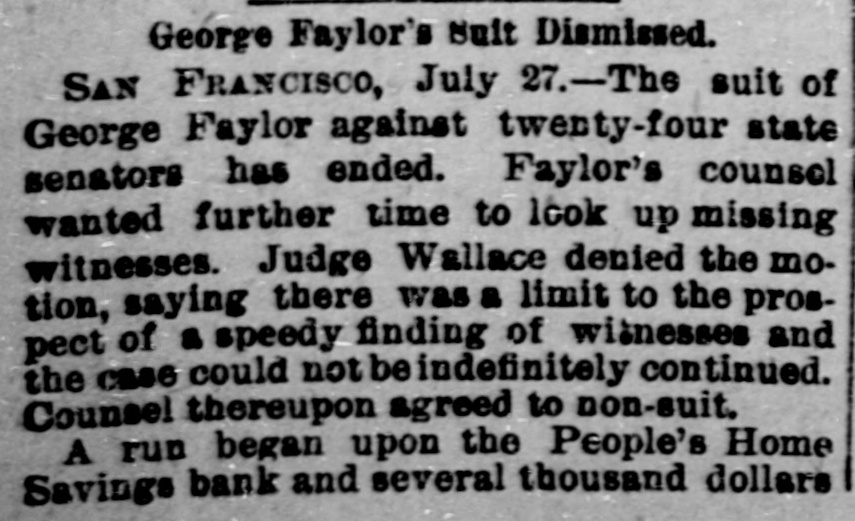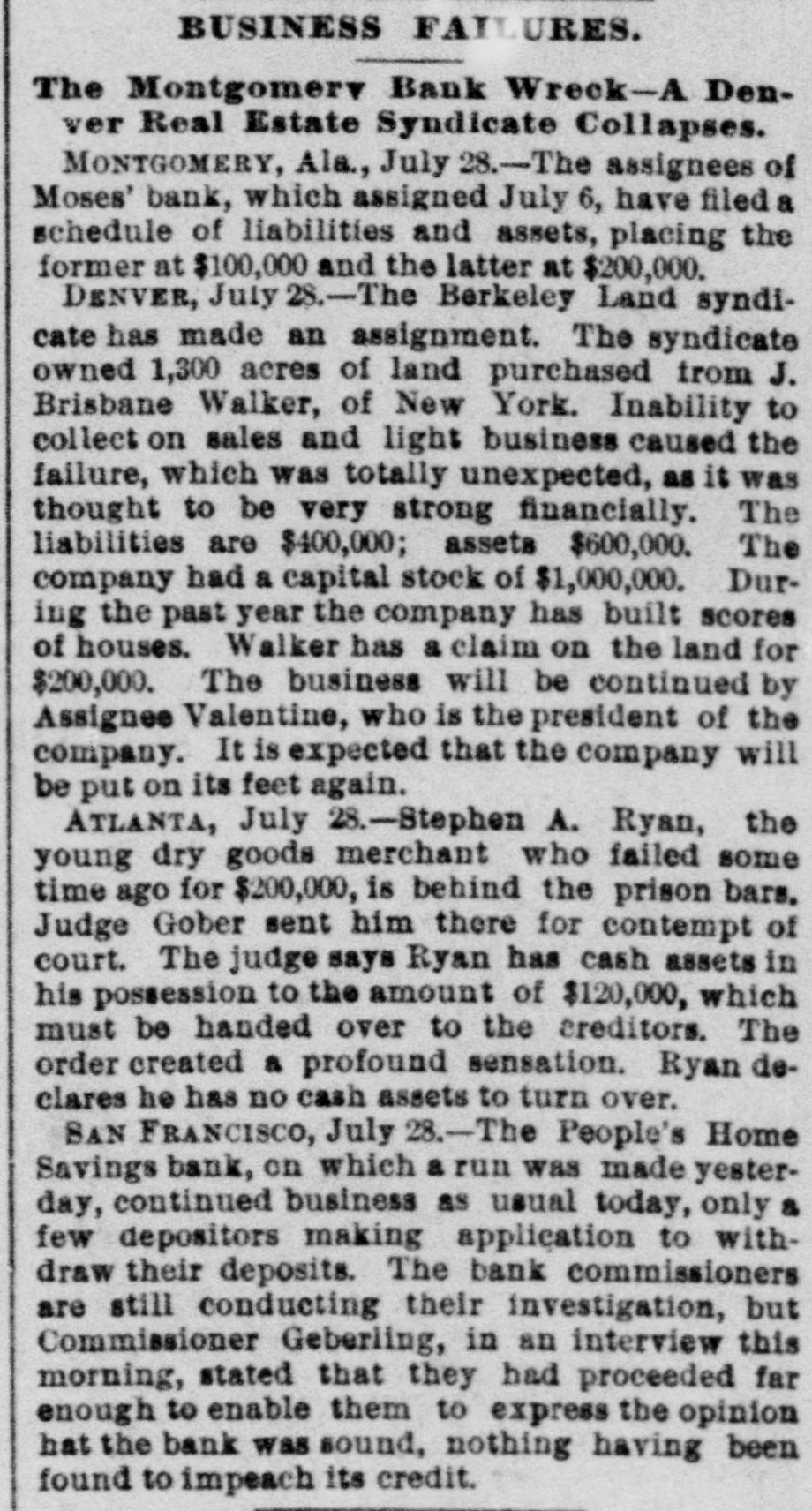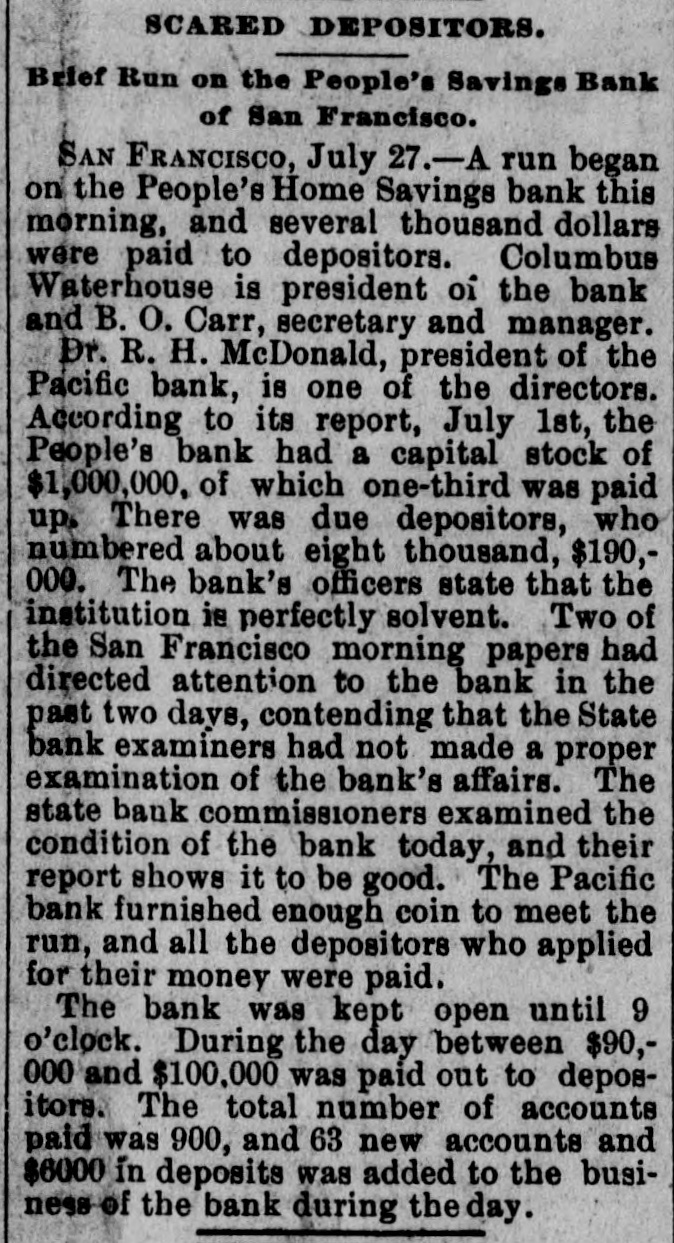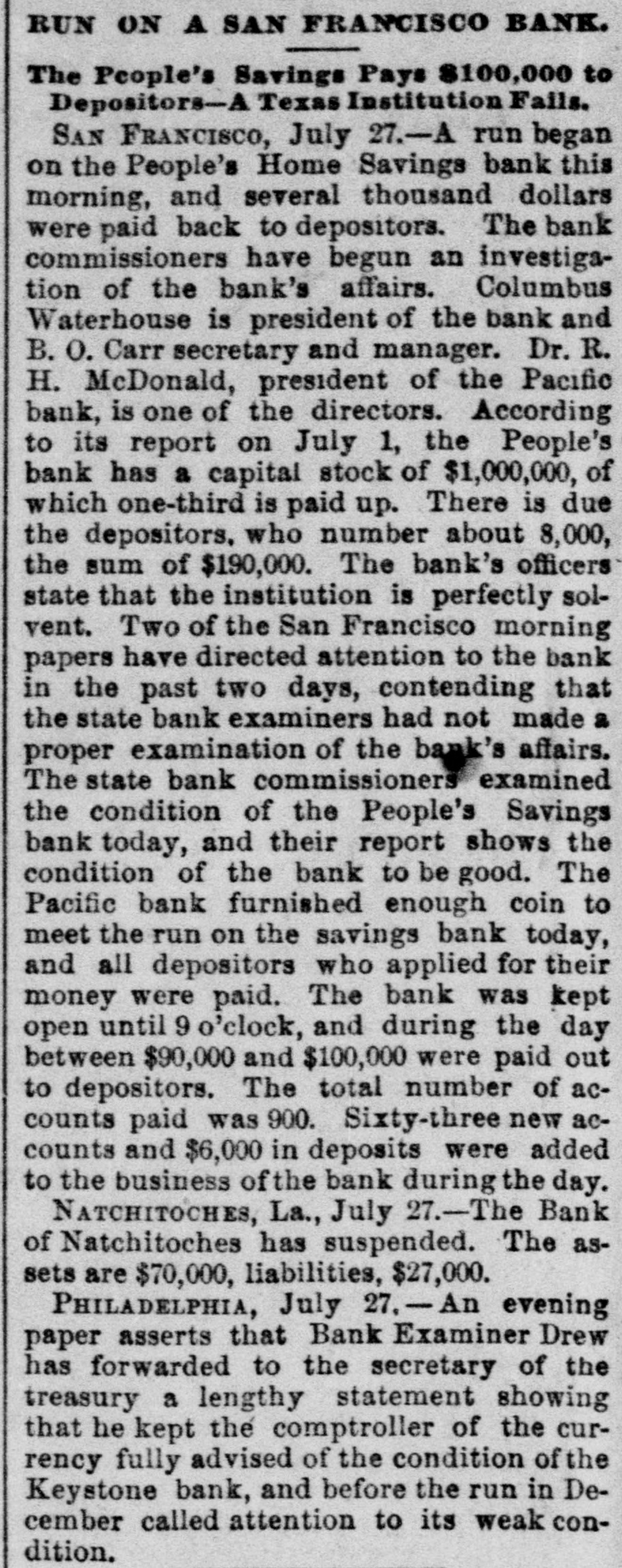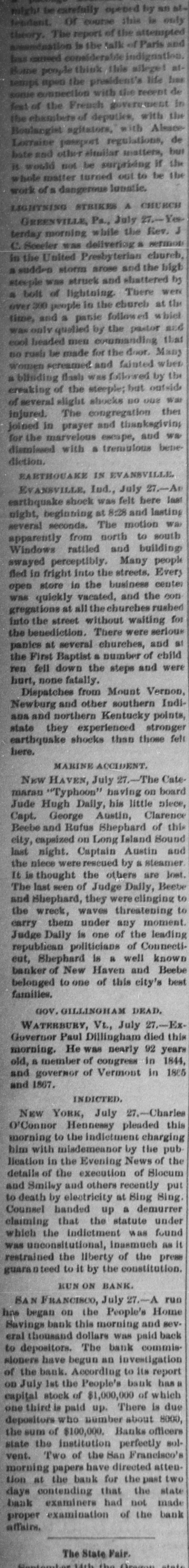repdent. or this in only theory. The report of the attempted americation is the talk of Paris and has oursed considerable indignation. Home people think this allege! attempt upon the president's life has some connection with the recent de fest of the French government in the ebansbere of deputies, with the Boulangist agitators, with AlsaceLorraine passport regulations, de bate and other sitular matters, but is would not be surpriéng if the whole matter turned out to be the work of a dangerous lunatic. LIGHTSING STRIKES A CHURCH GREENVILLE, Pa., July 27.terday morning while the Rev. J C. Sceeler was delivering a sermon in the United Presbyterian church, a sudden storm arose and the high steeple was struck and shattered by a bolt of lightoing. There wen over 300 people in the ebureb at the time, and a patie follow ed biel was only qualied by the pastor and eool headed men commanding that BO rush be made for the door. Many women screamed and fainted when a blinding flash was followed by the creaking of the steeple; but outside of several slight shocks BO 002 Wall injured. The congregation the joined in prayer and thanksgiving for the marvelous escape, and wa dismissed with a tremulous benediction. EARTHOUAKE IN EVANSVILLE, EVANSVILLE, Ind., July 27.-An earthquake shock was felt here last night, beginning at 8:28 and lasting several seconds. The motion was apparently from north to south Windows ratiled and building swayed perceptibly. Many people fled in fright into the streets, Every open store in the business center was quickly vacated, and the con gregations at all the churches rushed into the street without waiting for the benediction. There were serious panies at several churches, and at the First Baptist a number of child ren fell down the steps and were hurt, none fatally. Dispatches from Mount Vernon, Newburg and other southern Indiana and northern Kentucky points, state they experienced stronger earthquake shocks than those felt here. MARINE ACCIDENT. New HAVEN, July 27.-The Catemaran "Typhoon" having on board Jude Hugh Daily, his little niece, Capt. George Austin, Clarence Beebe and Rufus Shephard of this city, expsized on Long Island Sound last night. Captain Austin and the niece were rescued by a steamer It is thought the others are lost. The last seen of Judge Daily, Beebe and Shephard, they were elinging to the wreck, waves threatening to carry them under any moment. Judge Daily is one of the leading republican politicians of Connectieut, Shephard is a well known banker of New Haven and Beebe belonged to one of this city's best families. GOV. GILLINGHAM DEAD. WATERBURY, Vt., July 27.-ExGovernor Paul Dillingham died this morning. He was nearly 92 years old, a member of congress in 1844, and governor of Vermont in 1885 and 1867. INDICTED. NEW YORK, July 27.-Charles O'Connor Hennessy pleaded this morning to the indictment charging him with misdemeanor by the pub. lication in the Evening News of the details of the execution of Slocum and Smiley and others recently put to death by electricity at Sing Sing. Counsel handed up a demurrer claiming that the statute under which the indictment was found was unconsitutional, Inasmuch as It restrained the liberty of the press guaranteed to it by the constitution. RUN ON BANK. BA FRANCISCO, July 27.-A run has began on the People's Home Savings bank this morning and several thousand dollars was paid back to depositors. The bank commissioners have begun an investigation of the bank. According to its report OD July 1st the People's bank has # capital stock of $1,000,000 of which one third is paid up. There is due depositors who number about 8000, the sum of $100,000. Banks officers state the institution perfectly solvent. Two of the San Francisco's morning papers have directed attention at the bank for the past two days contending that the state bank examiners had not made proper examination of the bank affairs.