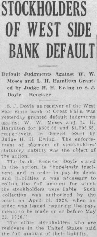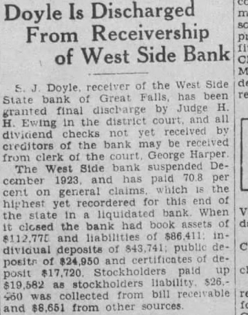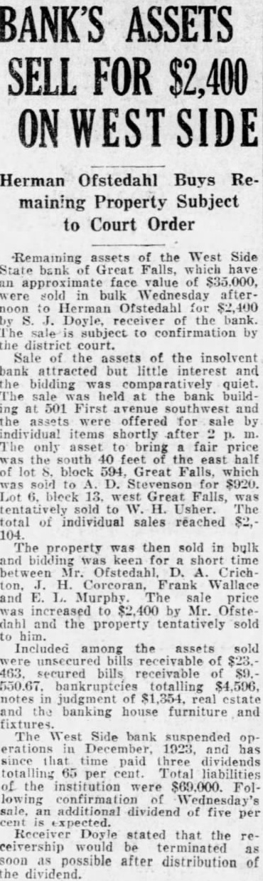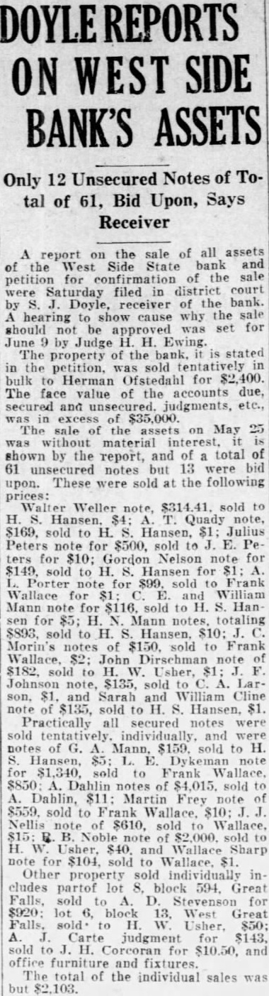 A report on the sale of all assets of the West Side State bank and petition for confirmation of the sale were Saturday filed in district court by S. J. Doyle, receiver of the bank. A hearing to show cause why the sale should not be approved was set for June by Judge H. H. Ewing. The property of the bank. it is stated in the petition, was sold tentatively bulk to Herman Ofstedahl for $2,400. The face value of the accounts due, secured and unsecured. judgments, etc., was in excess of $35,000. The sale of the assets on May 25 was without material interest, it shown by the report, and of a total of 61 notes but 13 were bid upon. These were sold at the following prices: Walter Weller note, $314.41. sold to H S. Hansen. $4: T. Quady note, $169. sold to H. S. Hansen, $1; Julius Peters note for $500, sold to J. E. Peters for $10; Gordon Nelson note for $149. sold to H. S. Hansen for $1; A. Porter note for $99. sold to Frank Wallace for E. and William Mann note for $116. sold to H. S. Han sen for $5; H Mann notes. totaling $893. sold to H. S. Hansen, $10: C. Morin's notes of $150. sold to Frank Wallace, $2: John Dirschman note $182, sold to H. W. Usher, $1; J. F. note, $135. sold to A. Larson. $1, and Sarah and William Cline note of $135, sold to H. S. Hansen, $1. Practically all secured notes were sold individually, and were notes of Mann, $159. sold to H. S. Hansen, $5: E. Dykeman note for $1,340 sold to Frank Wallace. $850 Dahlin notes of $4,015. sold to Dahlin, $11 Martin Frey note of $559. sold to Frank Wallace. $10: Nellis note of $610. sold to Wallace, $15: R. B. Noble note of $2,000. sold to H. W. Usher. $40. and Wallace Sharp note for $104 sold to Wallace, $1. Other property sold individually includes partof lot 8, block 594. Great Falls, sold to D. Stevenson for $920: lot 6, block 13. West Great Falls, sold to W. Usher. $50; A judgment for $143, sold to J. H. Corcoran for $10.50, and office furniture and fixtures. The of the individual sales was but $2,103.