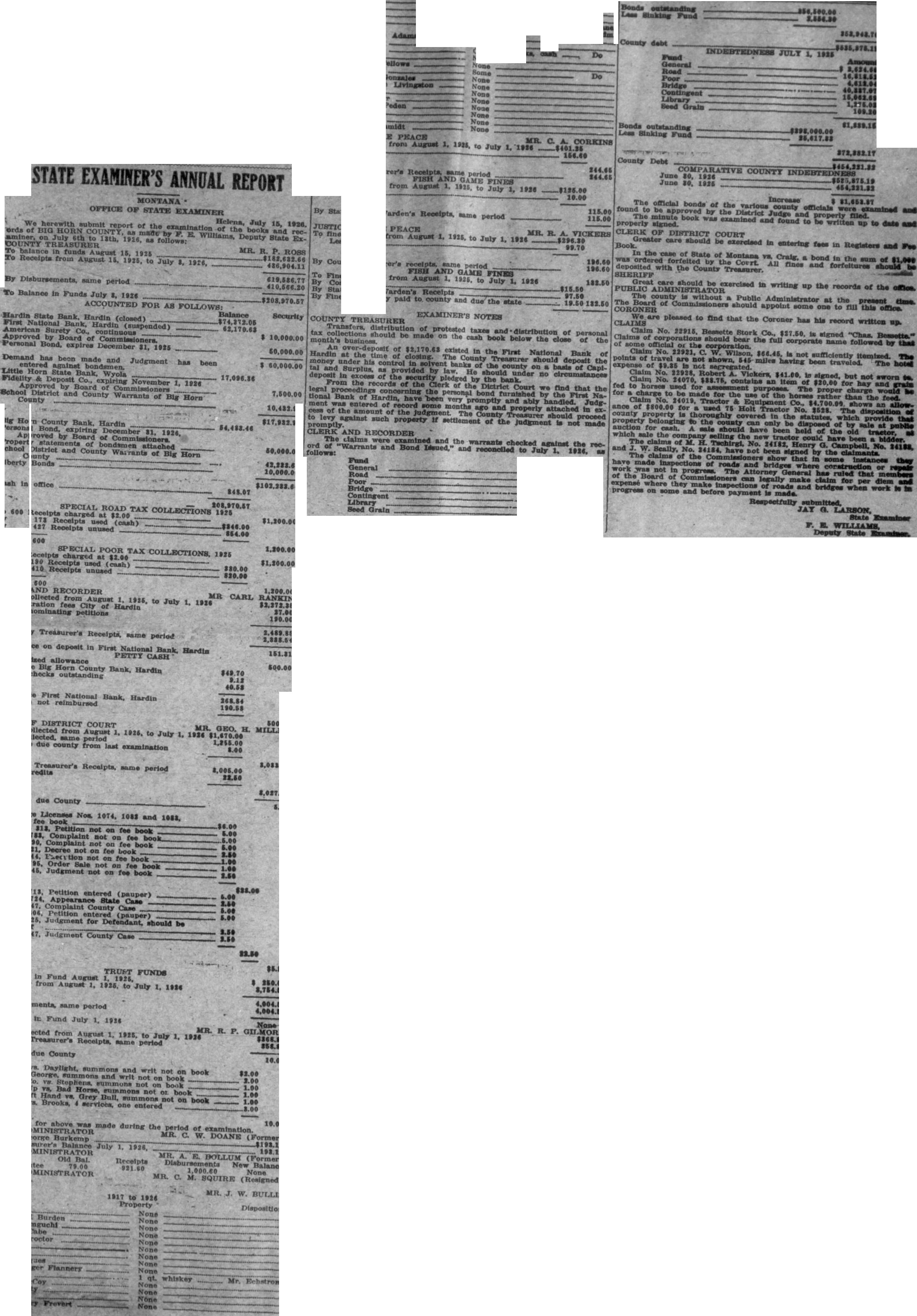 MONTANA OFFICE OF STATE EXAMINER We of herewith submit report of the examination Helena, of the books July 15, 1926. aminer, ords BIG on July HORN 6th COUNTY, to 13th, 1926, as made as follows: by F. E. Williams, Deputy State and rec- ExCOUNTY TREASURER To balance in funds August 15, 1925 MR. R. P. ROSS $182,632.66 To Receipts from August 15, 1925, to July 8, 1926,