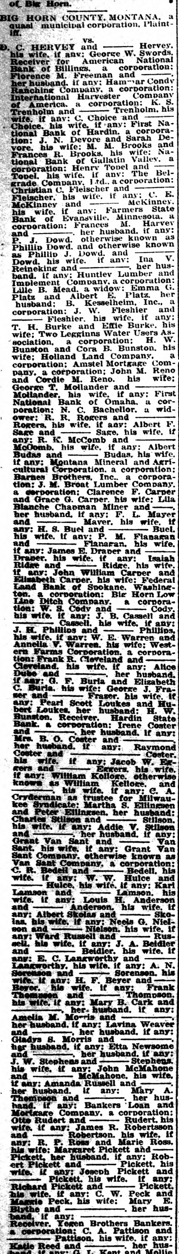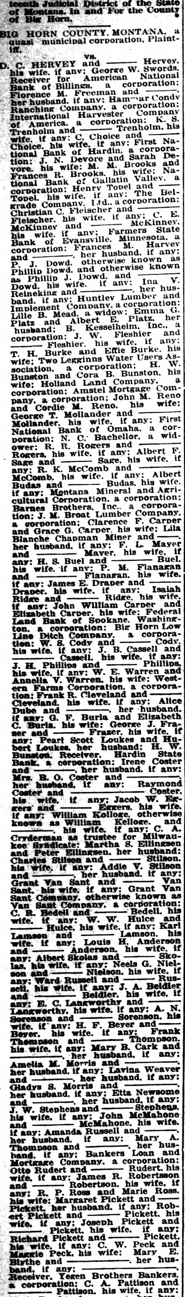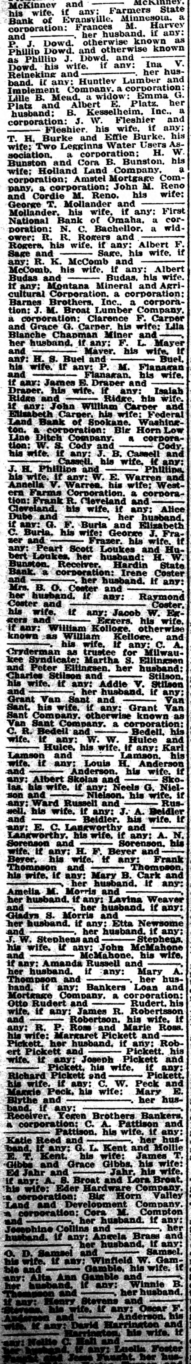 Mckinney. McKinnev and if any: Farmers State his wife. Bank of Evansville. M. Minnesota. Harvey a corporation: her Frances husband. if any: P. and J. Dowd. otherwise known as Phillip Dowd. and otherwise known Phillip J. Dowd. and Dowd. his as wife. if any: her Ina V. husReineking and band. if any: Huntlev Lumber and Implement Company. a corporation: Emma G. Lille B. Mead. a widow: Platz and Albert E. Platz. her husband: B. Kesselheim. Inc., a corporation: J. W. Fleshier and Fleshier. his wife. if any: T. H. Burke and Effie Burke. his wife: Two Legginns Water Users W Association. a corporation: H. Bunston and Cora B. Bunston. a his wife: Holland Land Company. corporation: Amstel Mortgage Company. a corporation: John M. Reno and Cordie M. Reno. his wife: George T. Mollander and Mollander. his wife, if any: First National Bank of Omaha. a corporation: N. C. Bachellor. a widower: R. R. Rogers and Rogers. his wife. if any: Albert F Sage and Sage, his wife. if any: R. K. McComb and and McComb. his wife. if any: his wife. Albert Budas. if Budas any: Montana Mineral and Agricultural Corporation. a corporation: Barnes Brothers. Inc.. a corporation: J. M. Broat Lumber Company. a corporation: Clarence F. Carper and Grace G. Carper his wife: Lila Blanche Chapman Miner and her husband. if any: F. L. Mayer and Maver. his wife. If any: H. S. Buel and Buel. his wife. if anv: P. M. Flanacan and Flanagan. his wife. if any: James E. Draper and Draper. his wife. if any: Isalah Ridge and Ridge his wife. if any: John William Carper and Elisabeth Carper. his wife: Federal Land Bank of Spokane. Washingof ton. corporation: Big Horn Low R corporaLine Ditch Company. tion: W. S. Cody and Cody. his wife. if any: J. B. Cassell and Cassell. his wife. if any: J. H. Phillips and Phillips, his wife. if any: W. E. Warren and Annella V. Warren. his wife: Western Farms Corporation. a corporation: Frank R. Cleveland and Cleveland. his wife. if any: Alice Dube and her husband. if any: G. F. Burla and Elizabeth C. Burla. his wife: George J. Frazer and Frazer. his wife. If any: Peart Scott Loukes and Hubert Loukes. her husband: H. W. Bunston. Receiver. Hardin State Bank. a corporation: Irene Coster and her husband. If any: Mrs. B. O. Coster and her husband. if any: Raymond Coster and Coster. his wife. if any: Jacob W. Eggers and Eggers. his wife. if any: William Kolloge. otherwise known as William Kelloge. and his wife. If any: C. A. Cryderman as trustee for Milwaukee Syndicate: Martha S. Ellingsen and Peter Ellingsen. her husband: Charles Stilson and Stilson. his wife. if any: Addie V. Stilson and her husband. if any: Grant Van Sant and Van Sant. his wife. if any: Grant Van Sant Company. otherwise known as Van Sant Company. a corporation: his C. R. Bedell and Bedell. wife. if any: W. W. Hulce and Hulce. his wife. If any: Karl Lamson and Lamson. his wife. if any: Louis H. Anderson and Anderson. his wife. if any: Albert Skolas and Skolas. his wife. if any: Neels G. Nielson and Nielson. his wife. if any: Ward Russell and Russell. his wife. if any: J. A. Beidler and Beidler. his wife. If any: E. C. Langworthy and Langworthy. his wife. if any: A. N. Sorenson and Sorenson. his wife. if any: H. F. Beyer and Bever. his wife. if any: Frank Thompson and Thompson. his wife. if any: Mary B. Cark and her husband. if any: Amelia M. Morris and her husband. if any: Lavina Weaver and her husband. if any: Gladys S. Morris and her husband. if any: Etta Newsome and her husband. if any: J. W. Stephens and Stephens. his wife. if any: John McMahone and McMahone, his wife. if any: Amanda Russell and her husband. if any: Mary A. Thompson and her hushand. if any: Bankers Loan and Mortgage Company. a corporation: his Otto Rudert and Rudert. wife. if any: James R. Robertsson and Robertson. his wife. if any: R. P. Rose and Marie Ross. his wife: Margaret Pickett and Pickett. her husband. if any: Robert Pickett and Pickett. his wife. if any: Joseph Pickett and Pickett. his wife. if any: Richard Pickett and Pickett. his wife. if any: C. W. Peck and Margie Peck. his wife: Mary E. her husBlythe and band. if any: Receiver. Yegen Brothers Bankers a corporation: C. A. Pattison and Pattison. his wife. if any: Katie Reed and her husband. If any: G. L. Kent and Mollie E. T. Kent. his wife: James T. Gibbs and Grace Gibbs. his wife: his wife. Ed Jahr and Jahr. if any: A. S. Broat and Lora Broat. his wife: Eder Hardware Company. a corporation: Big Horn Valley Land and Development Company. a corporation: Cora M. Compton and her husband. if any: her Josephine Collins and husband. if any: Angela If Brass any: and her husband, o. D. Samsel and Samsel. his wife. if any: Winfield W. Gambie and Gamble, his wife. if any: Alta Ann Gamble and her husband. if any: Winnie B. Themsson and - her husband. if Henry Stevens and any: his wife. if any: Oscar F. Anderson and Anderson his K any: David Harrington and " his wife. say: Nellie c. Hall and her any: Luella Foster Jesse her hus-