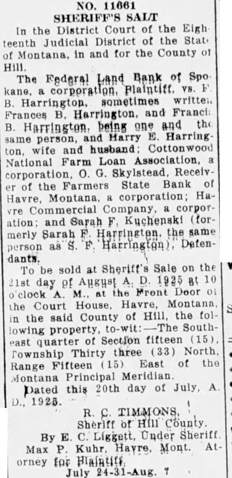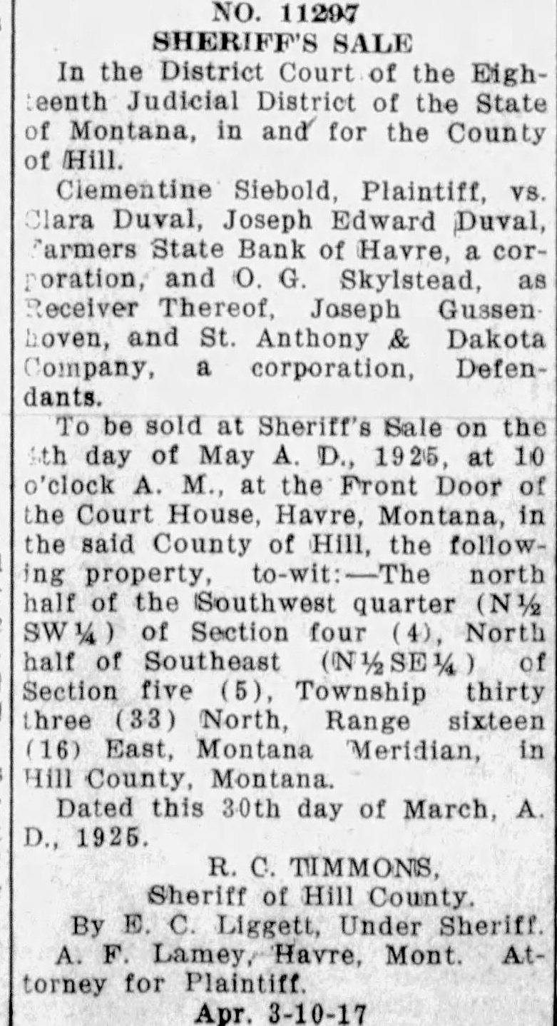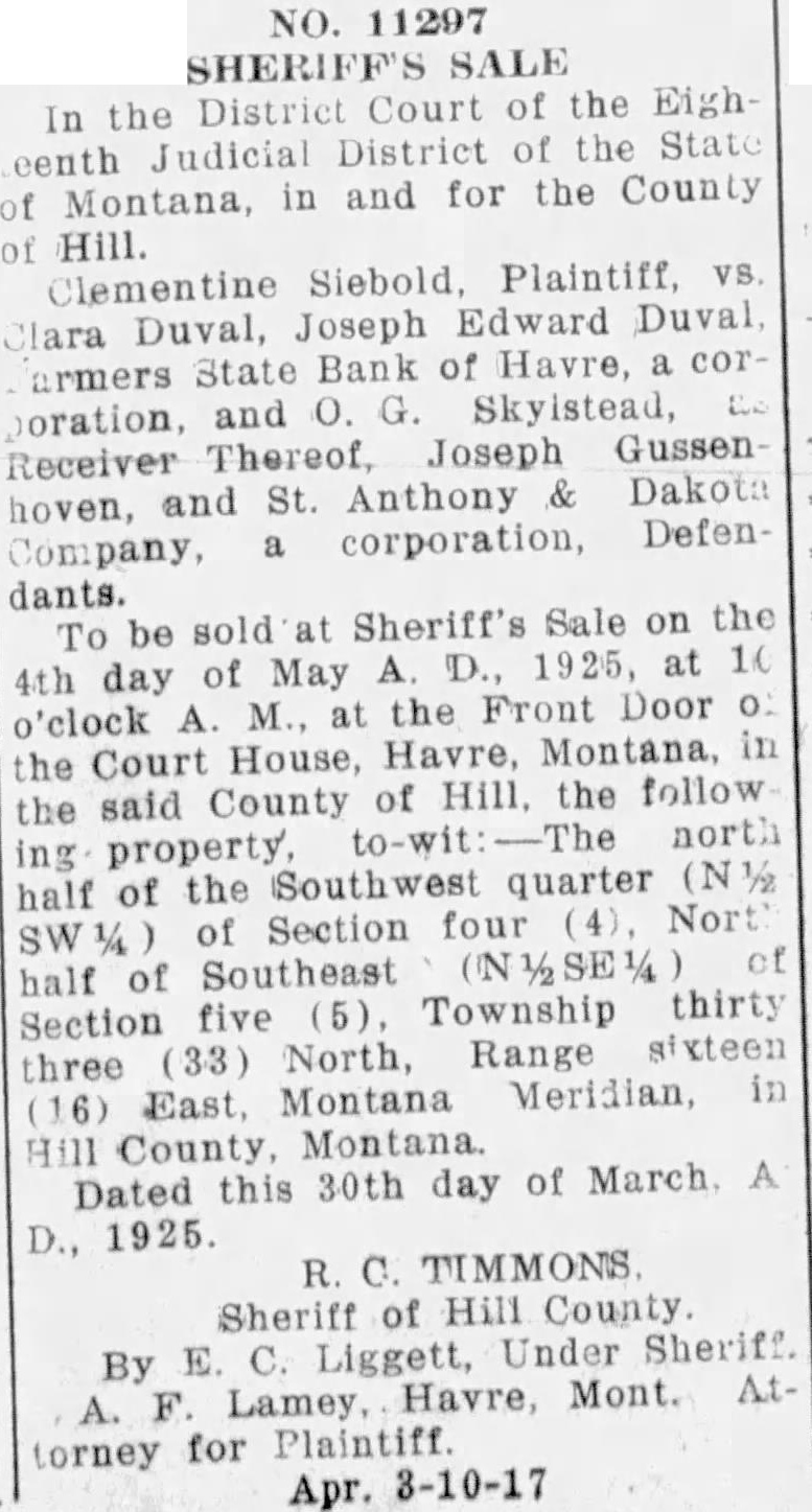 M. C. MacKenzie, Clerk. By (SEAL) Evelyn M. Boyle, Deputy Clerk. E. V. Ahern. Havre. Montana, Attorney for Plaintiffs. 9-21-