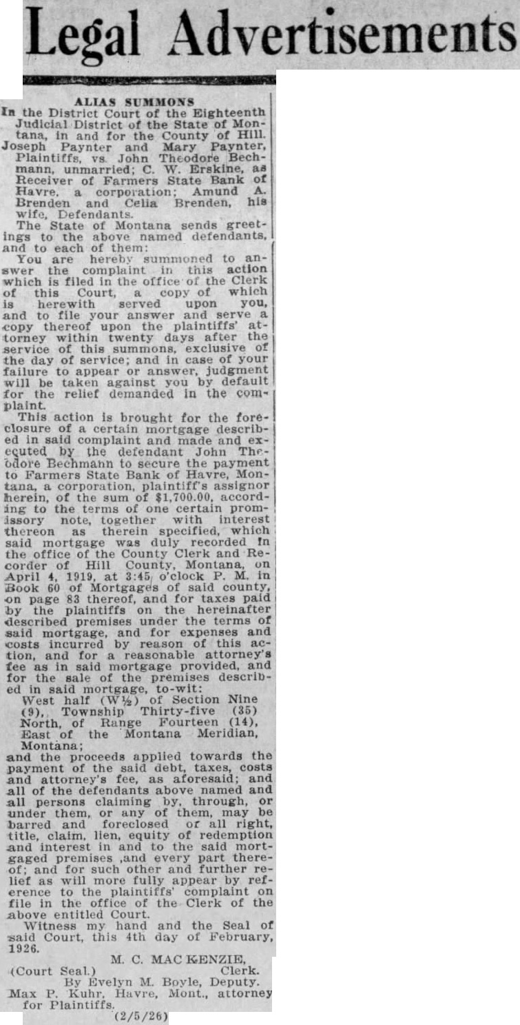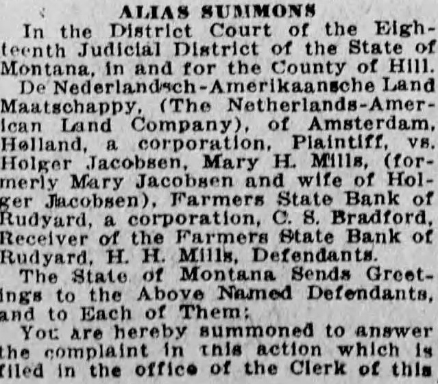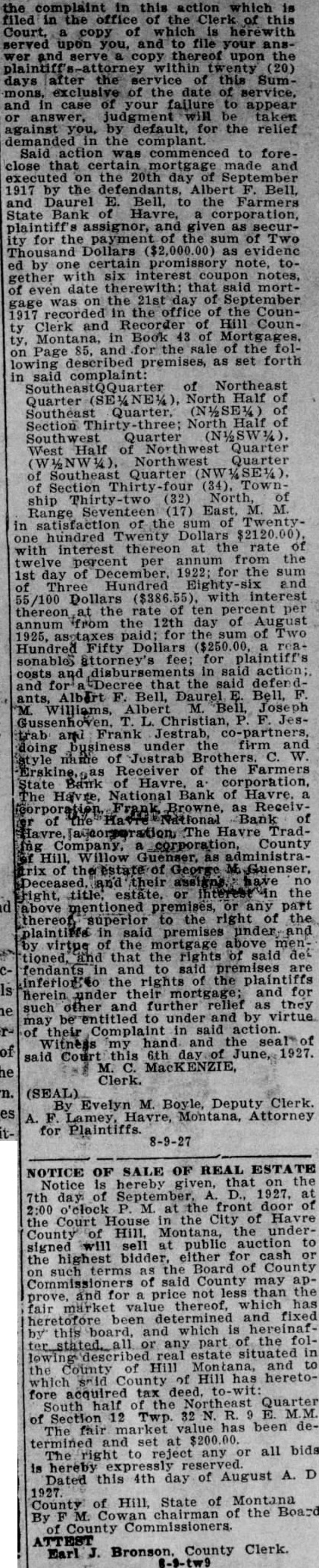 ALIAS SUMMONS In the District Court of the Eighteenth Judicial District of the State of Montana, In and for the County of Hill. Hattle Buxton and Finley Ross, Plaintiffs, vs., William C. Olson, and Mrs. William Olson, if any: John F Sinclair Company, a corporation: D. L. Case, as Receiver of John Sinclair Company: The Havre National Bank, corporation: Frank Brown, as Receiver of the Havre National Bank; The Farmers State Bank of Havre corporation; C. W. Erskine, as of the Farmers State Bank of Havre; The Security State Bank of Havre, corporation: Troy, P. F. Jestrab and B. F. Hillsabeck. as Trustees of the Security State Bank of Havre and the State of The State of Montana sends greetings to the above named defendants and to each of them: You are hereby summoned to answer the in this action, which is filed in the office of the Clerk of this Court, copy of which herewith served upon you, and to file your answer and copy thereof upon the plaintiffs attorney within twenty (20) days after the service of this summons exclusive of the day of service and in case of your failure to appear or answer, judgment will be taken against you, by default. for the relief demanded in the complaint That said action was commencea to foreclose that certain mortgage made and executed on the 10th day of September, 1917, the grantor of defendants William C. Olson and Mrs. William C. Olson, if any, to the John F. Sinclair & Company a and plaintiff's assignor, and given to secure the payment of One Thousand ($1 00) Dollars as evidenced by one certain promissory note and five interest coupon notes of even date therewith; that said mortgage was on the 25th day of September, 1917. recorded in the office of the County Clerk and Recorder of Hill County, Montana, in Book 12 of Mortgages, page 75, and for the sale of the following described premises, as set forth in said complaint: SW% of Section 17. Township 36, North, Range 11 East of the Monitana Meridian. in satisfaction of the sum of One Thousand 000 Dollars, with interest thereon at the rate of ten per cent per annum from the 1st day of October. 1922: for the sumi of Two Hundred ($200.00) Dollars reasonable attorney's fees; for plaintiffs costs and disbursements in said action ;and for decree that the said defendants, William Olson, and Mrs. William C. O1son, if any; John F. Sinclair Company, D. L. Case as Receiver of John F. Sinclair Company the Havre National Bank, a corporation; Frank Brown, Receiver the Havre National Bank The Farmers State Bank of Havre, corporation; C. W. Erskine as Receiver of the Farmers State Bank of Havre; The Security beck as Trustees of the Security State State Bank of Havre, T. Troy, Jestrab and B. F. HillsaBank of Havre, and the State of Montana,and their assigns, have no right, title, estate or interest in the above mentioned premises or any part thereof superior to the right of the plaintiffs in said premises under and by virtue of the mortgage above mentioned, and that the rights of said defendants in and to said premises are inferior to the rights the plaintiffs herein under their mortgage and for such other and further relief as he may be entitled to under and by virtue of his complaint in said action. Witness my hand and the seal of this court this 19th day of September, 1928.