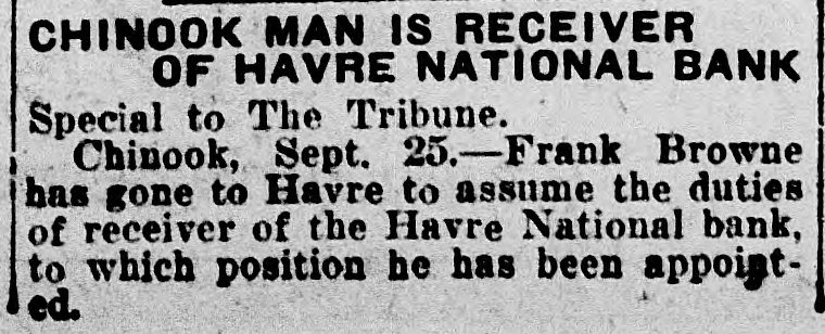 CHINOOK MAN IS RECEIVER OF HAVRE NATIONAL BANK Special to The Tribune. Chinook, Sept. 25.-Frank Browne has gone to Havre to assume the duties of receiver of the Havre National bank, to which position he has been appointed.