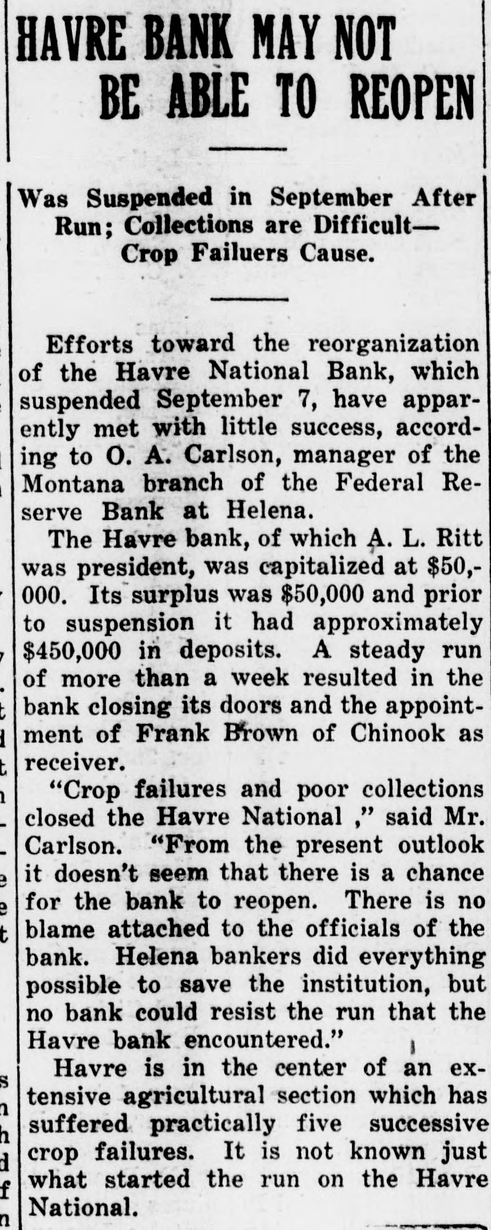 HAVRE BANK MAY NOT BE ABLE TO REOPEN Was Suspended in September After Run; Collections are DifficultCrop Failuers Cause. Efforts toward the reorganization of the Havre National Bank, which suspended September 7, have apparently met with little success, according to O. A. Carlson, manager of the Montana branch of the Federal Reserve Bank at Helena. The Havre bank, of which A. L. Ritt was president, was capitalized at $50,000. Its surplus was $50,000 and prior to suspension it had approximately $450,000 in deposits. A steady run of more than a week resulted in the bank closing its doors and the appointment of Frank Brown of Chinook as receiver. "Crop failures and poor collections closed the Havre National ," said Mr. Carlson. "From the present outlook it doesn't seem that there is a chance for the bank to reopen. There is no blame attached to the officials of the bank. Helena bankers did everything possible to save the institution, but no bank could resist the run that the Havre bank encountered." Havre is in the center of an extensive agricultural section which has suffered practically five successive crop failures. It is not known just what started the run on the Havre National.