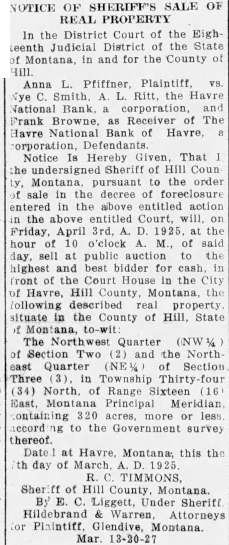 NOTICE OF SHERIFF'S SALE OF REAL PROPERTY In the District Court of the Eighteenth Judicial District of the State of Montana, in and for the County of Hill. Anna L. Pfiffner, Plaintiff, VS. Nye C. Smith, A. L. Ritt, the Havre National Bank, a corporation, and Frank Browne, as Receiver of The Havre National Bank of Havre, orporation, Defendants. Notice Is Hereby Given, That the undersigned Sheriff of Hill Coun Ly, Montana, pursuant to the order of sale in the decree of foreclosure entered in the above entitled action in the above entitled Court, will, on Friday, April 3rd, A. D. 1925, at the hour of 10 o'clock A. M., of said day, sell at public auction to the highest and best bidder for cash, in front of the Court House in the City of Havre, Hill County, Montana, the following described real property situate in the County of Hill, State f Montana, The Northwest Quarter (NW 1/ of Section Two (2) and the Northeast Quarter (NE% of Section Three (3), in Township Thirty-four (34) North, of Range Sixteen (16) East, Montana Principal Meridian, ontaining 320 acres, more or less. accord ng to the Government survey thereof. Date at Havre, Montana; this the th day of March, A. D. 1925. R. TIMMONS, Sher of Hill County, Montana. By E. C. Liggett, Under Sheriff Hildebrand & Warren, Attorneys for Plaintiff, Glendive, Montana. Mar. 13-20-27