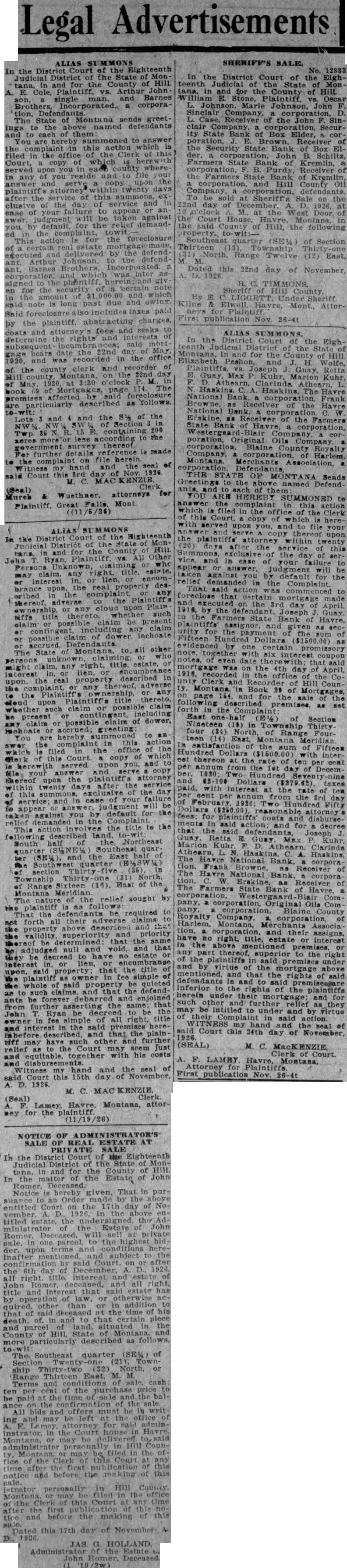 Legal Advertisements ALIAS SUMMONS In the District the Eighteenth Judicial District of the State of Montana, In and for the County of Hill. A. E. Cole, Plaintiff. vs. Arthur John son, single man. and Barnes Brothers, Incorporated, corporaThe State of Montana sends greet. ings to the above named defendants and to each of them You are hereby to answer the this action which is filed in the office of the Clerk of this of which herew served Court, upon copy you in where in any of you reside file answer and serve copy upon the plaintiff's attorney twenty days after of this summons, ex clusive of the day service and case of your failure to appear or an swer judgment be taken against you, by default, for the relief demandthe ed This action compla for the foreclosure of certain real estate defend and delivered by the to the defend Arthur was later signed giv en for the security and which note is long past due and owing. foreclosure taxes paid by the plaintiff abstracting charges, costs and attorney's fees and seeks determine the rights and said gage bears date the 22nd day the of office May and was in the county clerk and recorder Montana on the 22nd day of May 1920 at 3:30 o'clock P. M. book 69 of Mortgages, page 174. The premises affected by said foreclosure are particularly described as follows Lots and and the S½ of the NW% NW SW of Section Twp. 36 N. 15 E. containing 200 less according to the government survey thereof. For further details reference is made to the complaint on file herein Witness hand and the seal of said Court this 3rd day of KENZIE, Nov 1936 C. MAC (Seal) attorneys for Murch & Great Mont. ALIAS SUMMONS Court of the In Fudicial the District District of the State of and for the County All Other John claiming estate. who claim. any may or interest in, or lien, or enoumbrance upon, the real property des- any in the complaint the Plaintiff's adverse whether such title thereto, claim be present or poss contingent including any claim or possible of inchoate The State of Montana. all other who persons claim, any right, estate, or interest lien, or encumbrance upon. real property described in the complaint, any adverse the Plaintiff's ownership or any sloud upon Plaintiff's title thereto, whether such claim or possible claim present contingent including claim possible elaim of dower, are hereby to action an complaint in this the swer which is filed the office of the Clerk of this Court copy of which herewith served upon you, and and serve copy answer shereof file, upon the plaintiff's attorney service within twenty days after the this summons, exclusive of the day service and in case your will failure be udgment taken appear against you by default for the relief demanded in the This action the title to the Northeast South ter (SE% and the East half of the Southwest quarter section Thirty five 35) in Township Thirty North, of Range Sixteen (16). East of the Meridian Montana The the relief sought by is as follows the be required to forth all their adverse property above described and the validity superiority and priority Mareof determined that the same adjudged null and void, and that they be decreed have no estate interest in or lien, or eneumbrance upon, said property: that the title plaintiff as owner simple the whole said property be quieted to such claims. and that the defendants be forever debarred and enjoined from further asserting the same: John Ryan be the owner in fee all right, title and said premises hereimbefore described, and that the plain tiff may have such other and further relief as to the Court may seem just and equitable, together with his costs and Witness my hand and the seal of said Court this 15th day of November, D. 1926 M. C. MAC KENZIE (Seal) Lamey Havre Montana, attormey for the plaintiff (11/19/26) NOTICE OF ADMINISTRATOR'S SALE OF REAL ESTATE AT PRIVATE SALE District the Eighteenth In the District the of Montana. and the County of Hill. the the Estate of John In matter Romer Notice is hereby given, That in pur made entitled on day of No vember the titled the the of Estate John ministrator will at sale the Inafter the by said Court, on or the 6th day of December A. all title interest and John all title and that said estate has of law or otherwise by other than or addition that quired. said deceased at the time of his in that and land, County of HHL State of Montana. and more described as follows, to-wit The Southeast quarter (SE%) of Tow Sectio ship Thirty (32) North. or Range Thirteen East. M M. Terms and conditions of sale, cash ten per cent of the purchase price be paid at the time sale and the bal ance the the All bids and offers must be in writ ing and may be left at the office Lamey, attorney for said admin instrator, in the Court house in Havre. administrator in Hill County, Montana. or may filed in the office of the Clerk of this Court at any time after the first lication of this notice and before the making of this istrator sale. personally in Hill County Montana. or may filed in the office of the Clerk of this Court at any time after the first tice and before the making of this Dated this 17th day of November & Administrator of the Estate John Romer, Deceased 19/2w) SHERIFF'S SALE. No. 12833 In the District Court of the Eighteenth Judicial of the State of Mon. tana, in and for the County of Hill Johnson Marie Johnson, John Sinclair Company, D. Case, of the John F. Sinclair Company, Security State Bank of Box Elder, cor Brown, Receiver the Security State Bank of Box ElFarmers State Bank of Kremlin, corporation. F. B. Purdy, Receiver of the Farmers State Bank of Kremlin a corporation. and Hill County Oil Company To be sold at Sheriff's Sale on the 22nd day of December, D. 1926. M. at the West Door, of the Court House, Havre Montana, in the said County of Hill, the following to-wit:Southeast quarter (SE%) Section Thirteen (13) Thirty-one M M. North, Range Twelve (12) East, Dated this 22nd day of November, A. Sheriff Hill County By E LIGGETT. Sheri