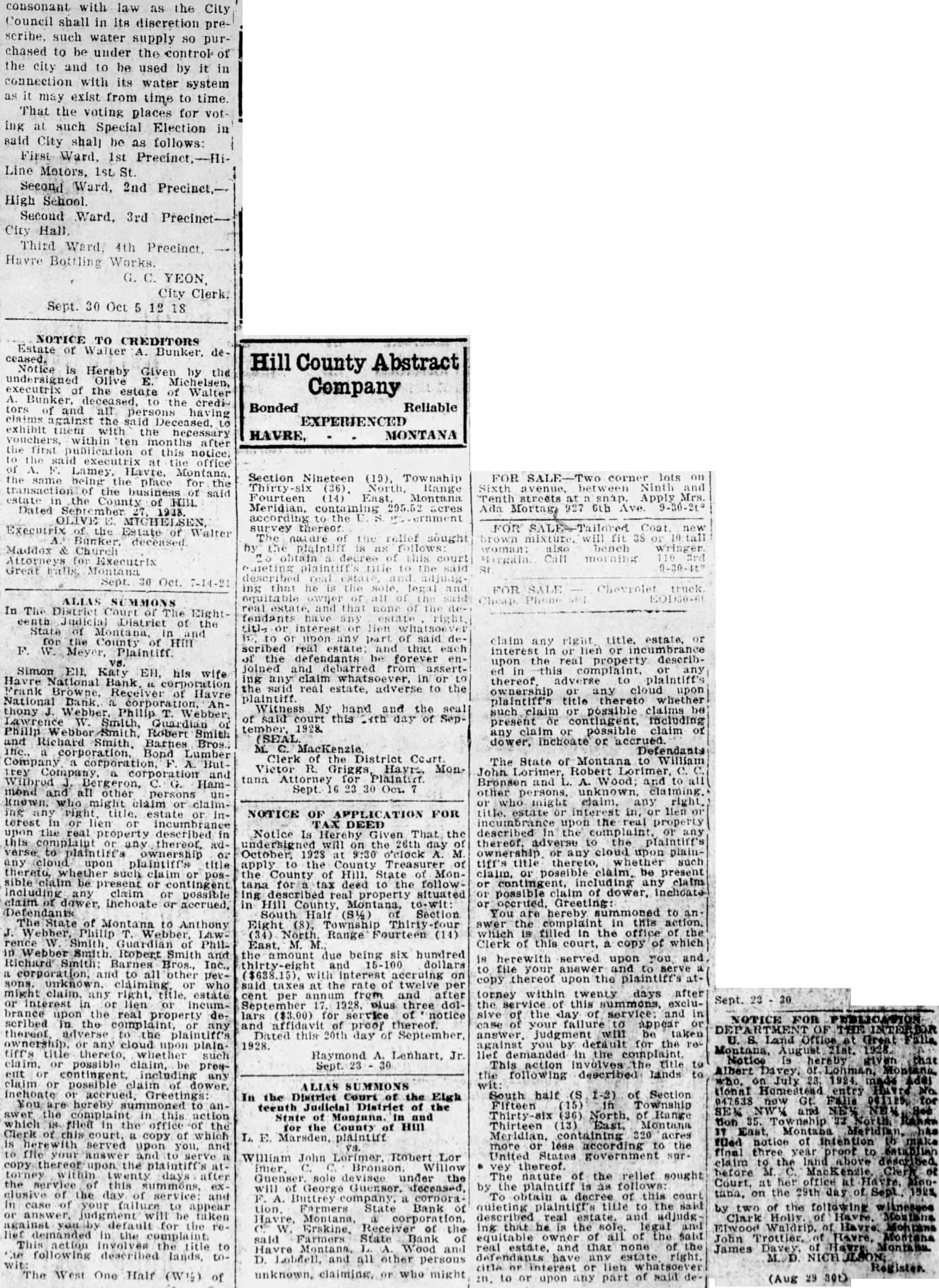 consonant with law as the City Council shall in its discretion prescribe. such water supply SO purchased to be under the control of the city and to he used by it in connection with its water system as may exist from time to time. That the voting places for voting such Special Election in said City shall be as follows: First Ward. 1st Precinct,-HiLine Metors, 1st St. Second Ward, 2nd Precinct,High Second Ward, 3rd PrecinctCity Third Ward. 4th Precinct. Havre Bottling Works. G. C. YEON City Sept. 30 Oct 18 NOTICE TO CREDITORS ceased. Estate or Bunker, de. Notice Hereby Given by the Olive executrix Bunker. of the estate Michelsen, Walter the tors and all persons claims the said exhibit the within ten after the this executrix at the same for the the business said estate the of Hill Dated Executrix the Estate of Walter Bunker, Maddox Attorneys Executrix Great Sept. 30 Oct. In The District MMONS EightDistrict of State Montana, the County Simon Ell, Katy EH, his wife Havre National Bank Frank Browne, Receiver Havre National thony Philip Webber, Lawrence Smith, Phillp Robert Guardian Smith and Richard Smith, Barnes Bros. Bond Company corporation. Lumber But mond and all Hamknown, might claim or terest upon real described this thereof, verse plaintiff's ownership plaintiff's title thereto, including be present or contingent claim possible claim inchoate accrued, Webber, of Montana Anthony Philip LAWrence Smith, Guardian PhilSmith. Robert Smith Richard Smith Barnes Bros., Inc., corporation, and other sons. claiming might claim. estate lien incumbrance real scribed in the any thereof, adverse plaintiff's claim. possible claim, presincluding any claim or possible inchoate Greetings: hereby the complaint in this which the office Clerk of served upon you, copy torney thereof upon the plaintiff's days after the this clusive of the service: and your appear judgment taken demanded involves following described lands, toThe West One Half of Section Nineteen (19), Township FOR SALE-Two corner lots Range Fourteen East Montana streets Apply Meridian, containing 295 survey thereof FOR new sought follows: bench of morning plaintiff's ing he FOR SALE truck equitable real and that fendants lien upon part of said de- claim any title, estate, scribed estate and that interest or the defendants forever the real property describupon joined and in this thereof. to plaintiff's real estate, adverse to the ownership plaintiff's thereto whether Witness My hand and the of said court this of Sep- present contingent, including 1928. claim any or Defendants Clerk the District Court The State or Montana to William Victor Mon. Robert Bronson and Sept. 30 Oct. NOTICE OF APPLIC ATION FOR DEED Notice Is That will the day 9:30 the County Treasurer the County State tax deed follow. Ing real property situated in Montana, South Half Section Township (34) Range (14) the amount due being hundred and dollars said taxes the rate of twelve per per from and lars ($3.00) service thereof. of affidavit Dated 20th day of September 1928. Raymond Lenhart, Jr. Sept. ALIAS SUMMONS In the District the Eigh teenth District of the State of Montana. and for the County Hill L. E. Marsden, plaintiff William John Lorimer. Robert Lor Willow Guenser. sole devisee under the Buttrey Farmers State Bank Montana, Receiver the Farmers State and all other persons unknown, claiming, or who might any right estate described thereof. adverse to the plaintiff's ownership plaintiff's thereto, such or be any claim or of dower, Greeting You are hereby to the in this action, which filled in the office Clerk of court, copy of which herewith served upon you and your thereof upon the plaintiff's torney within after this sive the service and failure appear or answer, judgment will taken against for the demanded action title following described lands South half (S Section Fifteen Township North, Range Thirteen East, Montana containing 320 acres more less according the United States government sprthereof. nature of the sought plaintiff follows: of this court quieting title the real and that he legal all of and that none have estate right. or in. to or upon any part of said Sept. 23 20 NOTICE FOR Land Notice hereby Albert and East notice three claim the before on the 29th by two of the Clark John James NICH Register. (Aug 29 30th